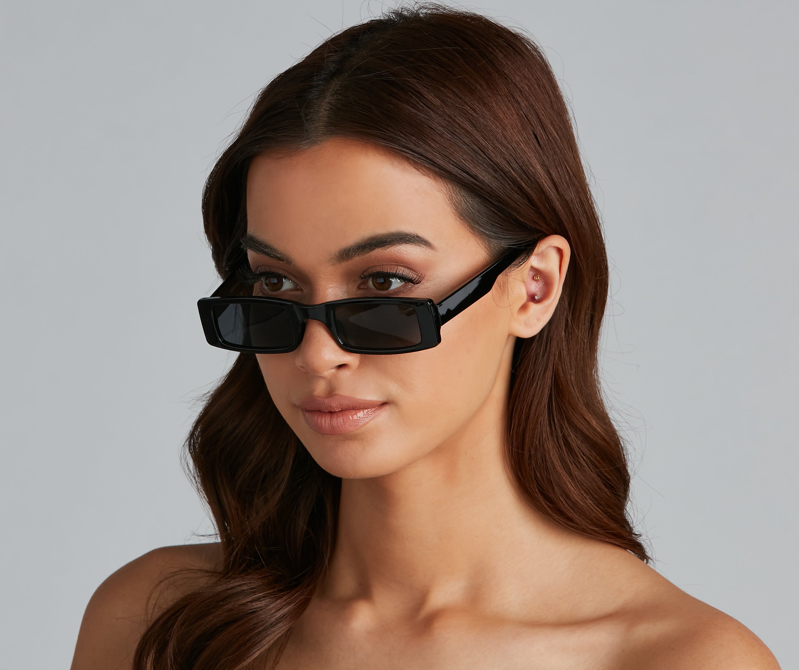 Throw it back to the ’90s in these trendy sunglasses featuring small plastic rectangular frames and arms with grommet insets. Complete the look in a?