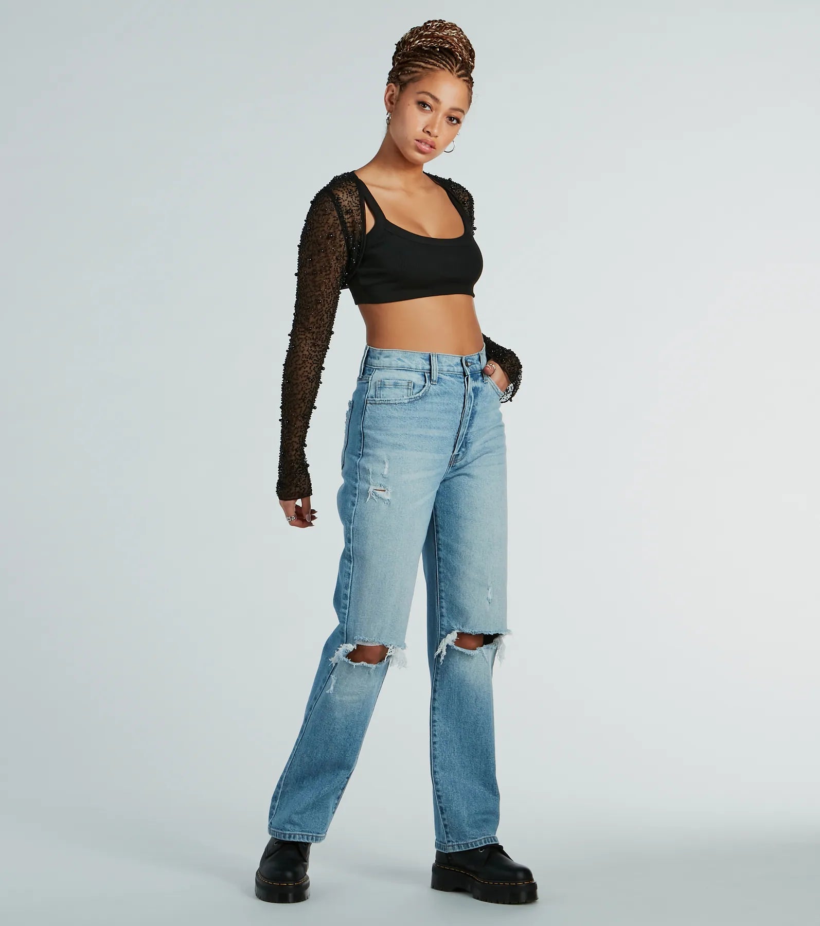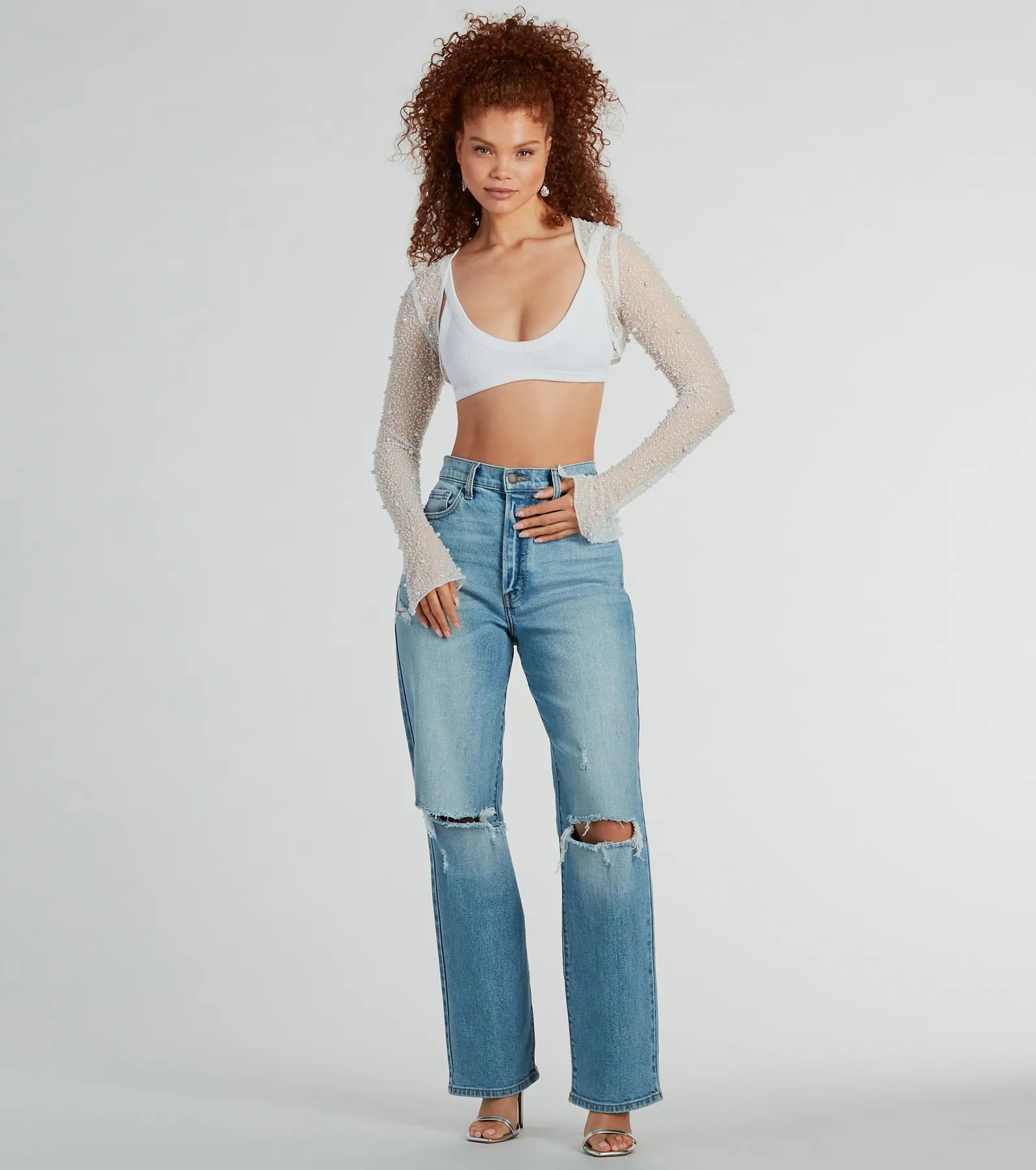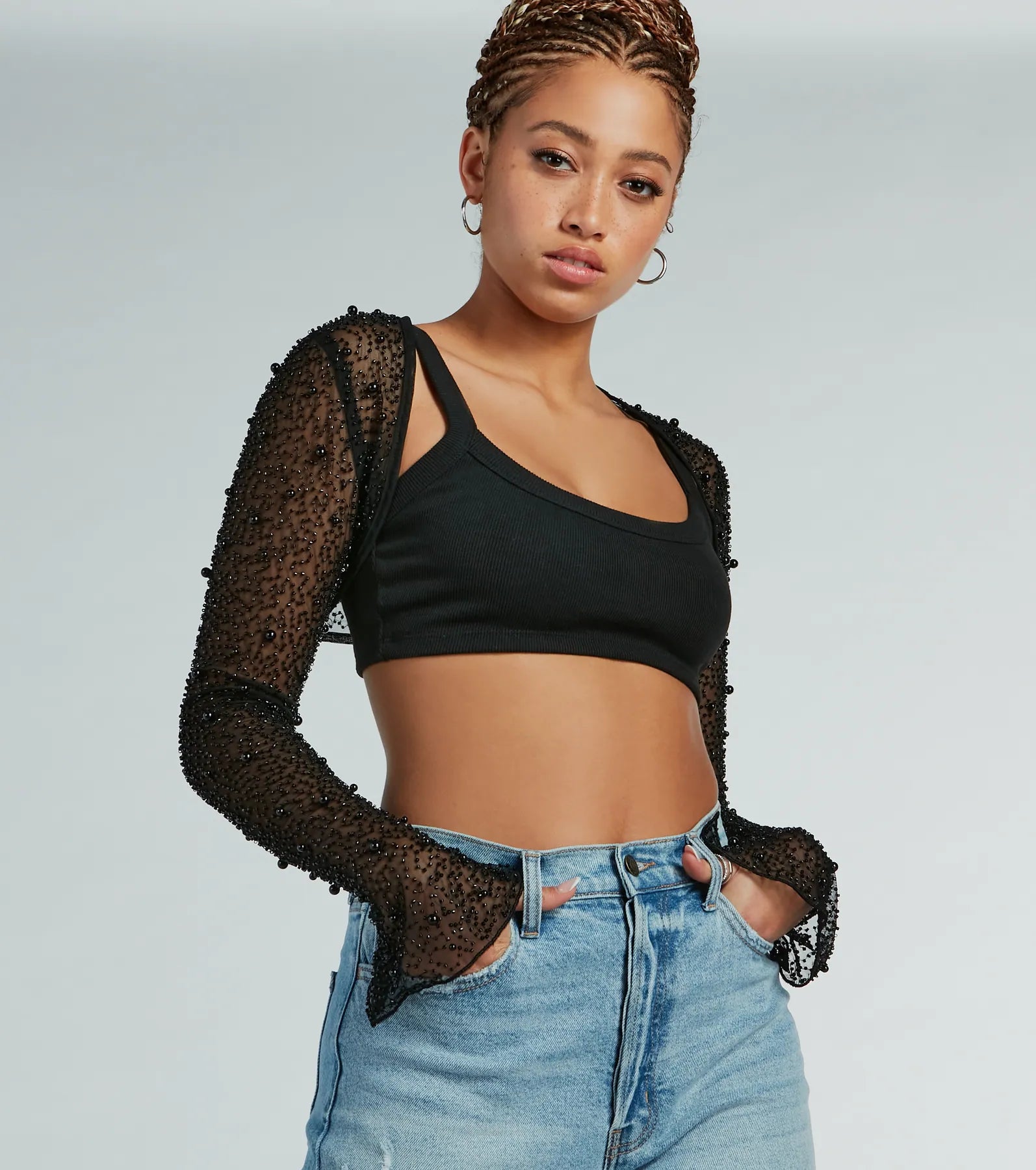 Perfect for any special occasion. this mesh bolero is the epitome of luxury! This sheer mesh bolero is designed with fitted long sleeves with flared slit cuffs. an open front design. and an ultra-cropped hem for a delicate yet modern touch. Adorned with faux pearl and beaded embellishments. this bolero shrug exudes sophistication and elegance. Complete the look in dressy .