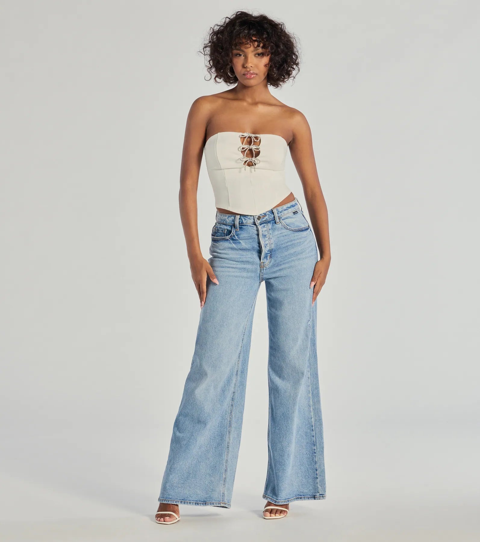 - Three bust cutouts. rhinestone bow accents