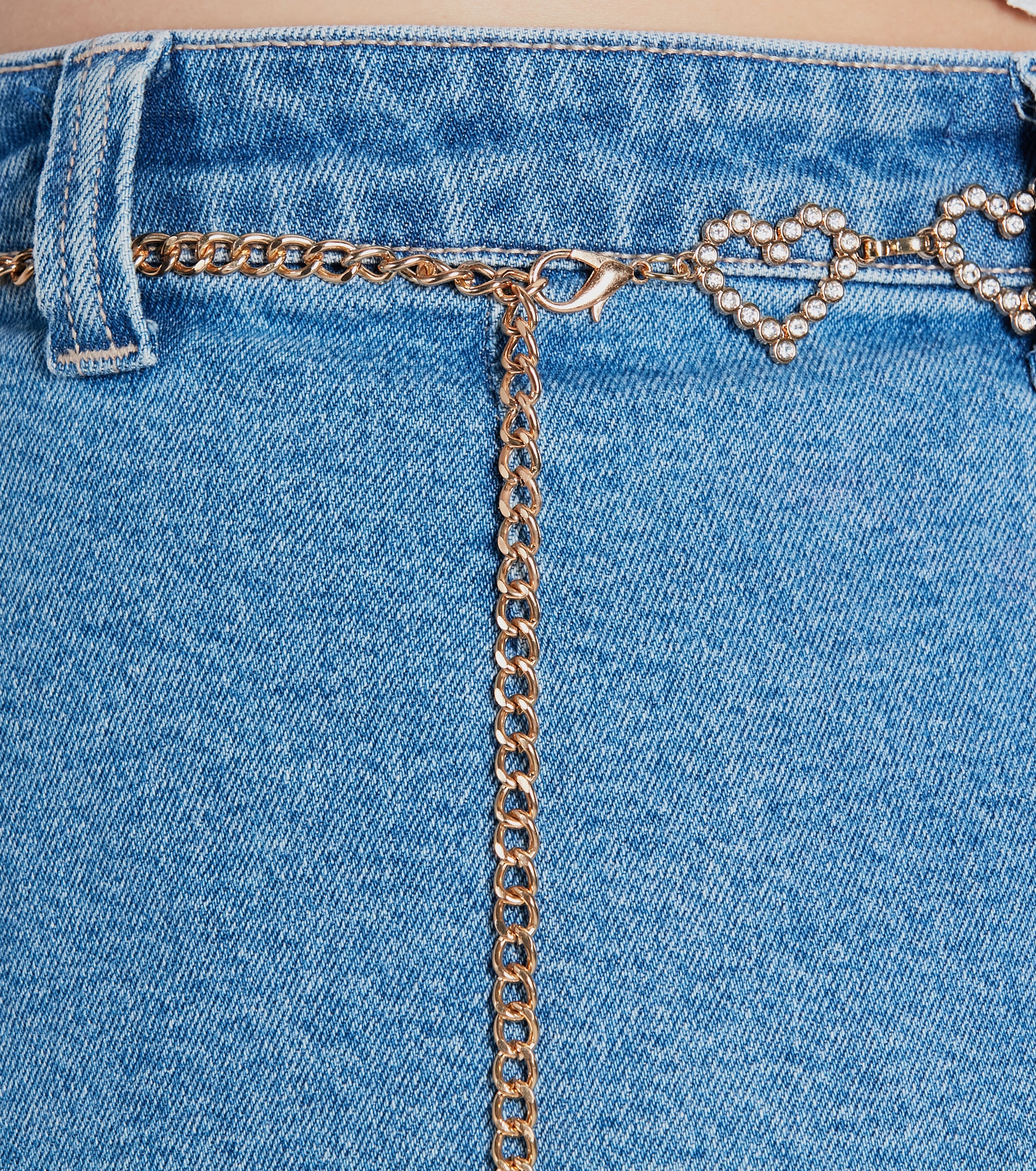 This adorable glam rhinestone heart chain belt will add a trendy touch to your casual looks! It features heart-shaped accents with glitzy rhinestone embellishments and includes a back adjustable chain with a lobster clasp closure. Style this chain belt over a with a corset top and mules.