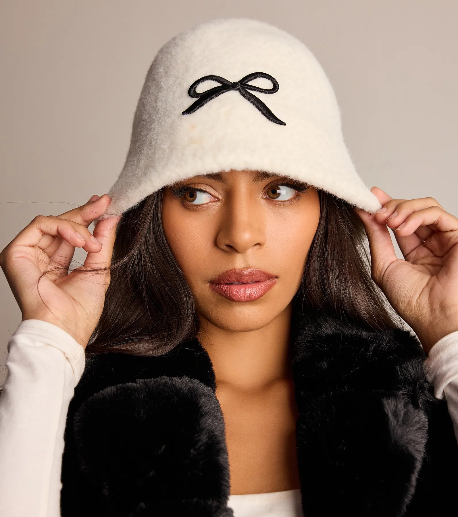 Adorable and cozy meet on this faux wool bucket hat with a bow trim and a short brim. Pair with ballet flats.