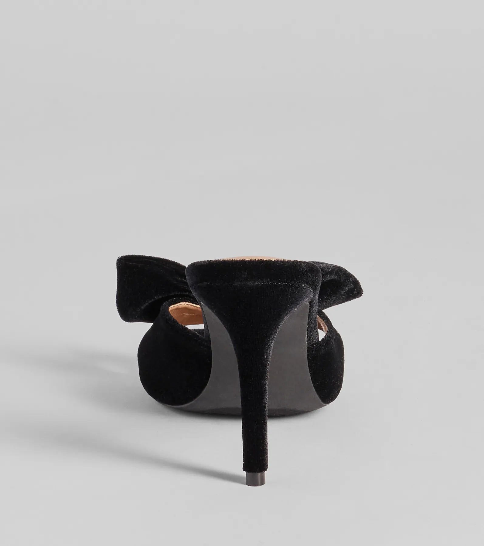 Walk into glam with the adorably luxe velvet bow strap stiletto mules. Featuring a chic bow accent and cushioned insole. these mules are your new go-to for effortless elegance.