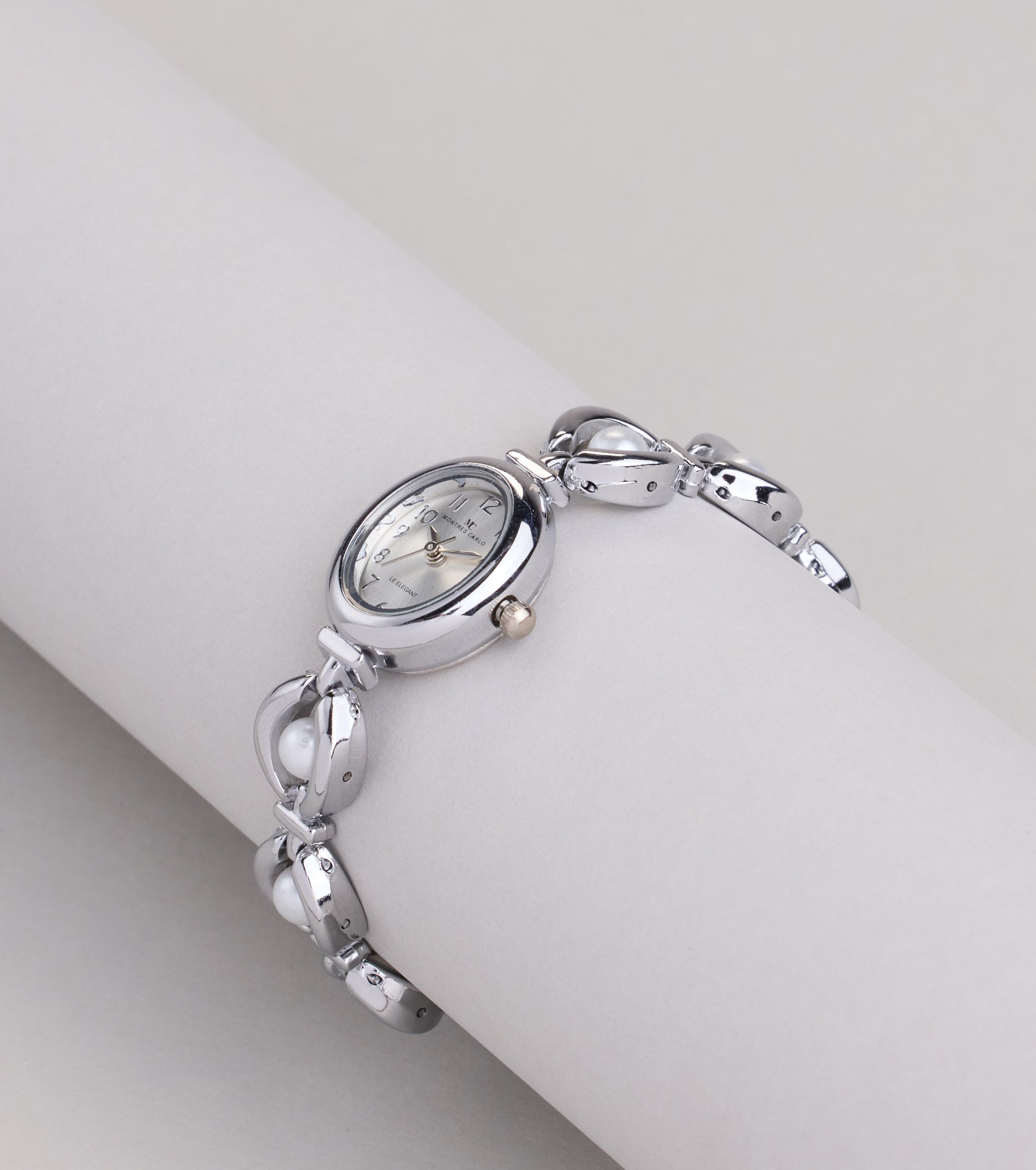 Classy and poised. this chic watch is adorned with faux pearls for a polished look and an adjustable clock dial to keep track of time.