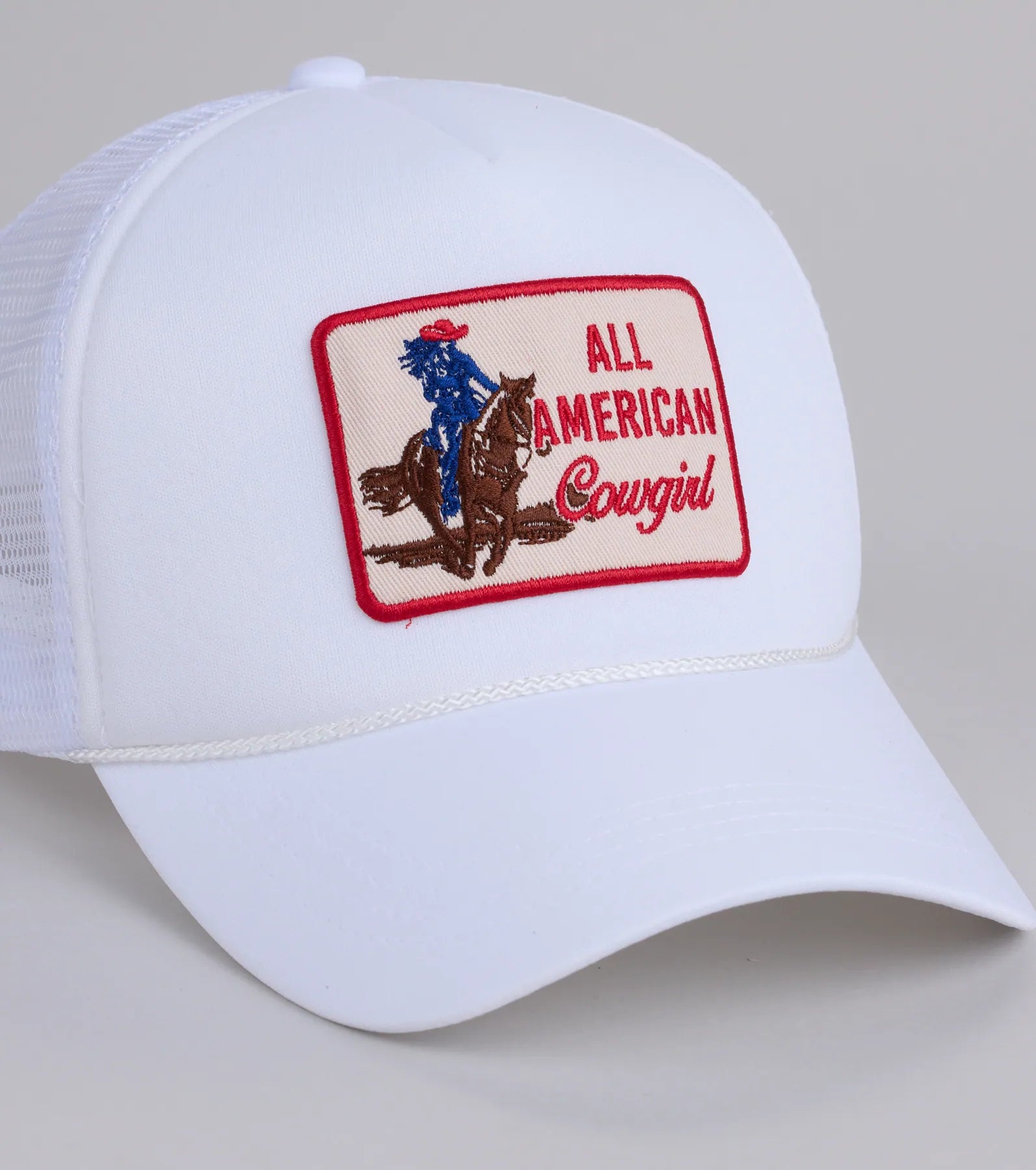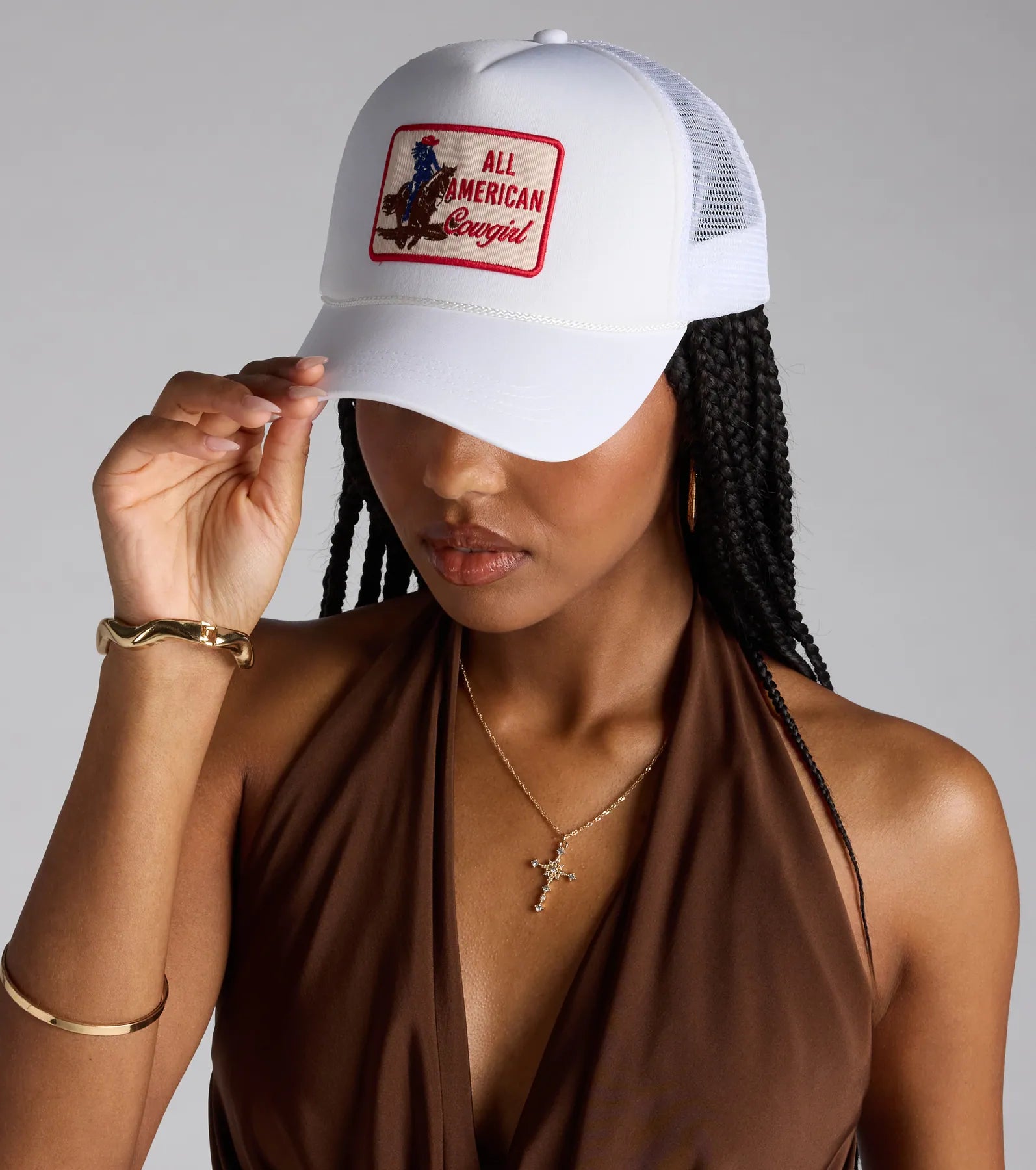 Show off your patriotic spirit with this snap back trucker hat. Featuring a stylish cowgirl patch and breathable mesh panels for all-day comfort.