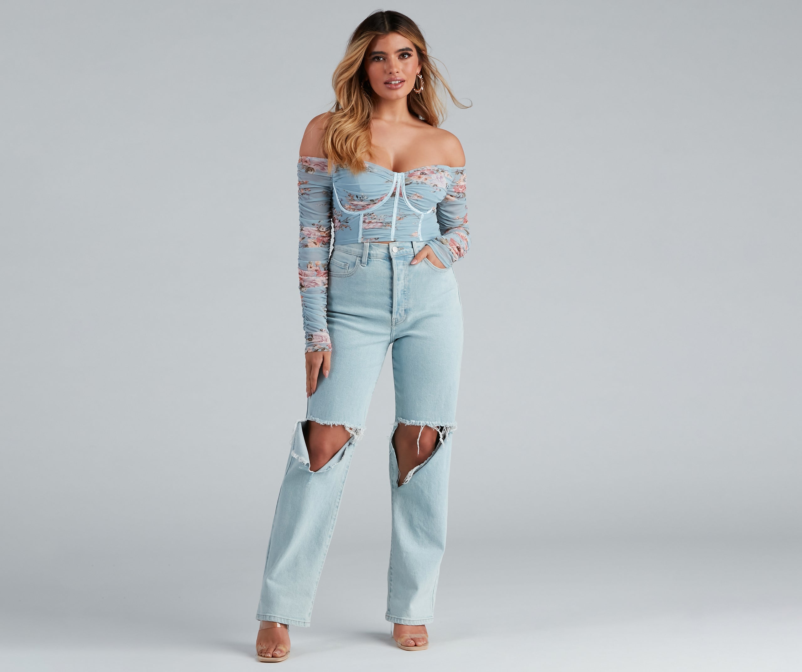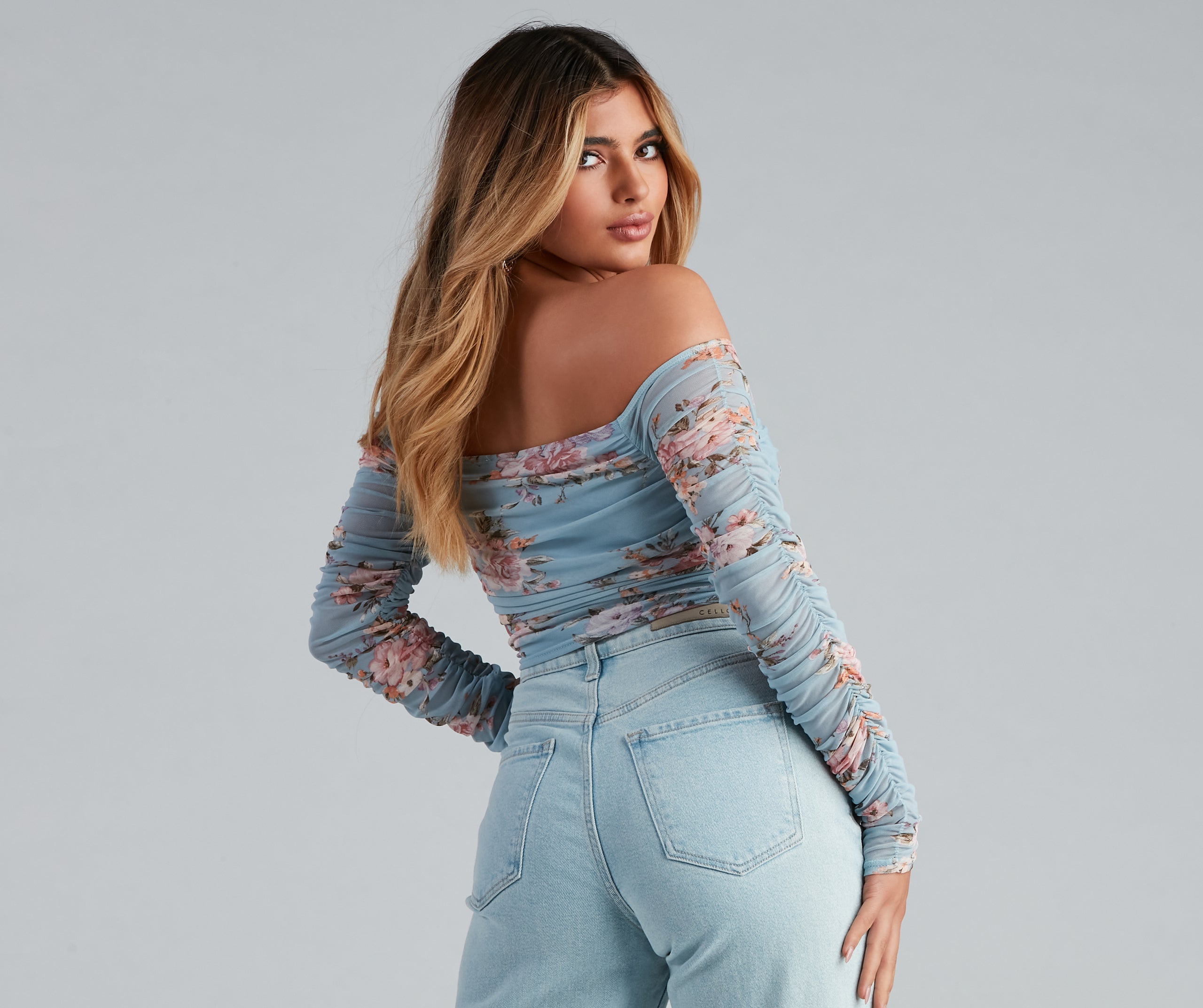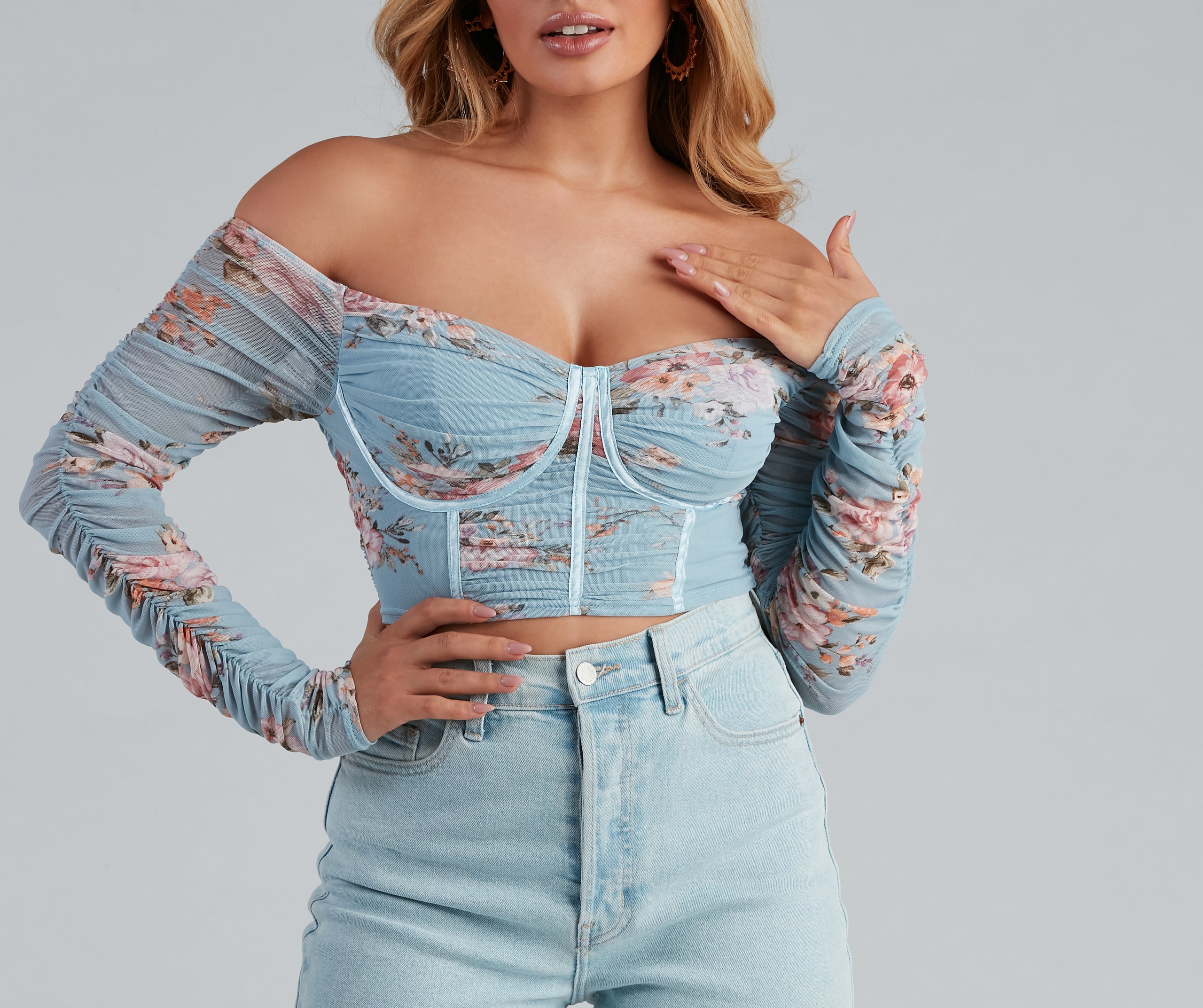 If you’re all for the florals. this mesh satin trim bustier is for you! It features an off-the-shoulder neckline with ruched long sleeves. a built-in padded bust. and satin trim detail along the cropped hem. Complete the look in trendy for a sweet look.