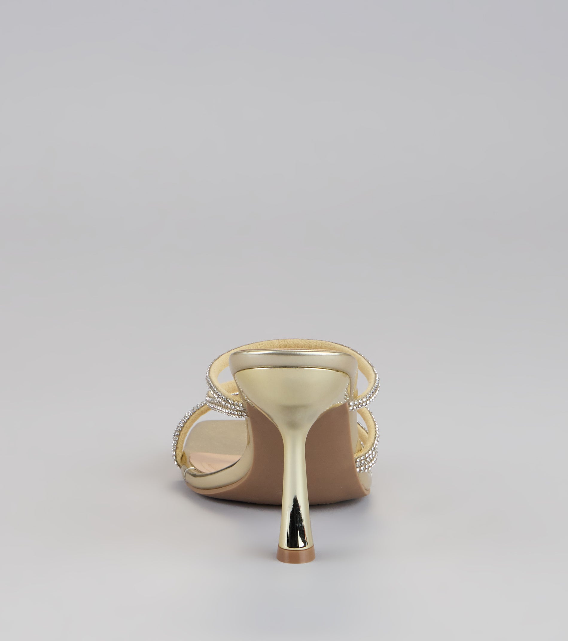 The heels that never miss. These stiletto mules bring effortless glam with rhinestone straps that catch every bit of light—and attention. Designed with a sculpted heel and sleek silhouette. they’re your not-so-secret weapon for any night worth dressing up for.