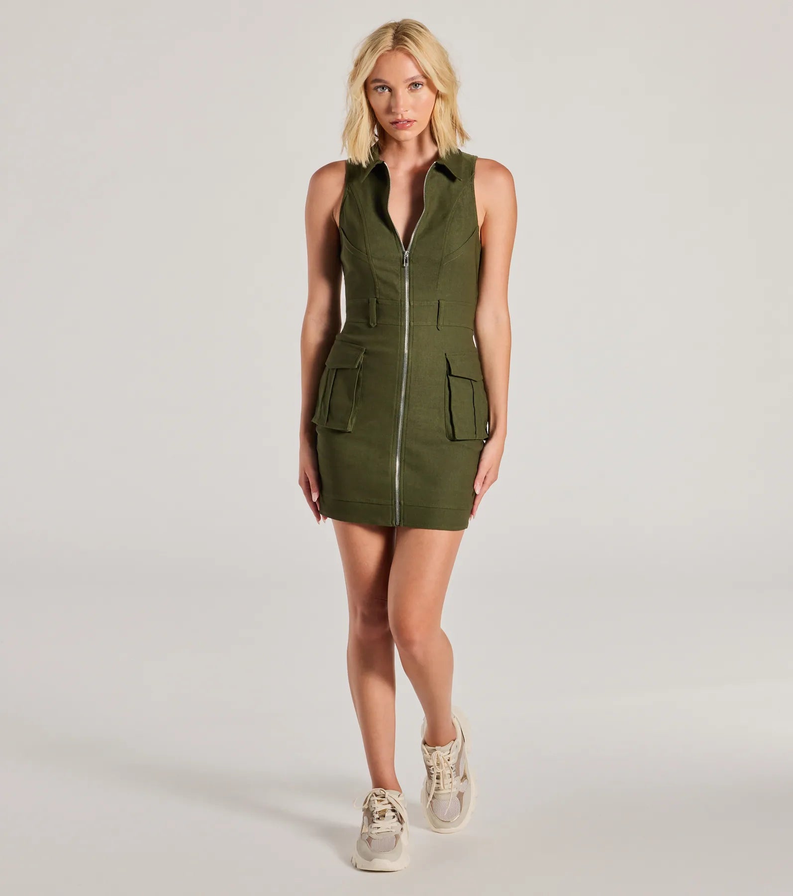 Capture all the attention in this structured and chic cargo mini dress! It features a sleeveless collared neckline. a complete zip-front design creating a V-neckline. a faux belted waist. large cargo-style side pockets. a mini-length hem. and a streamlined form-hugging fit. The woven fabric offers minimal stretch. Style this mini dress with and clear heels.