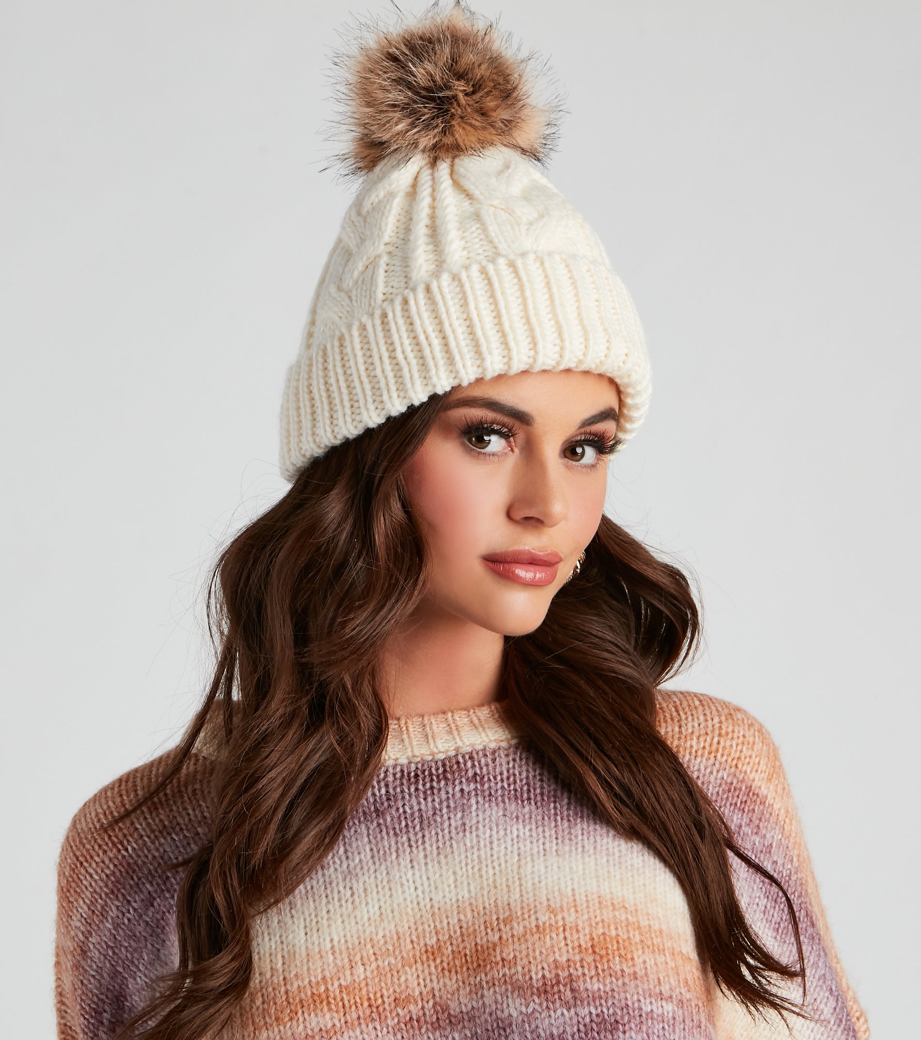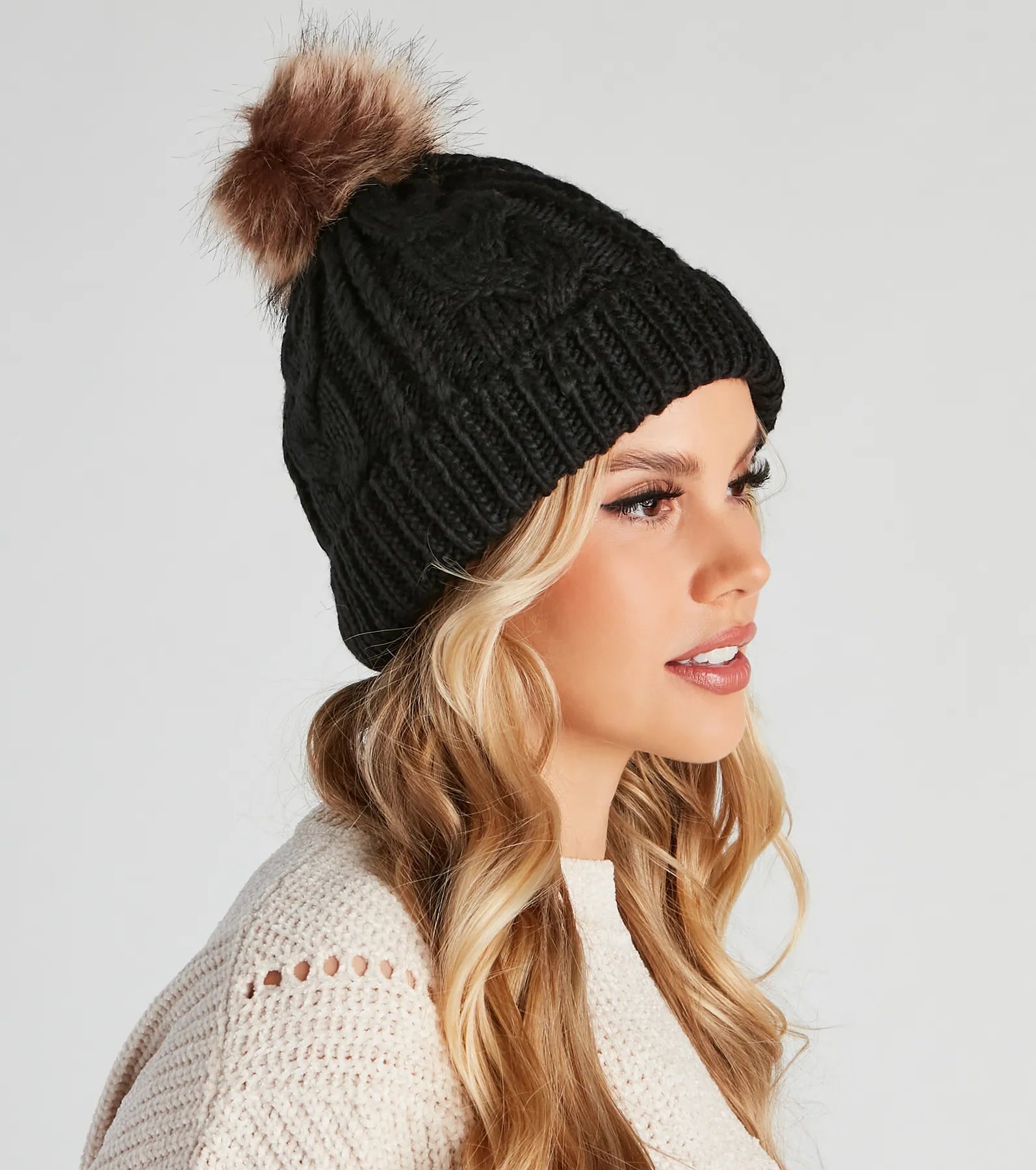 Keep your winter ‘fit cozy with this adorable knit beanie! It features a ribbed fold-over hem. a cable knit design. an ultra-plush faux fur lining to keep you warm. and a top fuzzy faux fur pom detail. Style this cute beanie with your favorite .