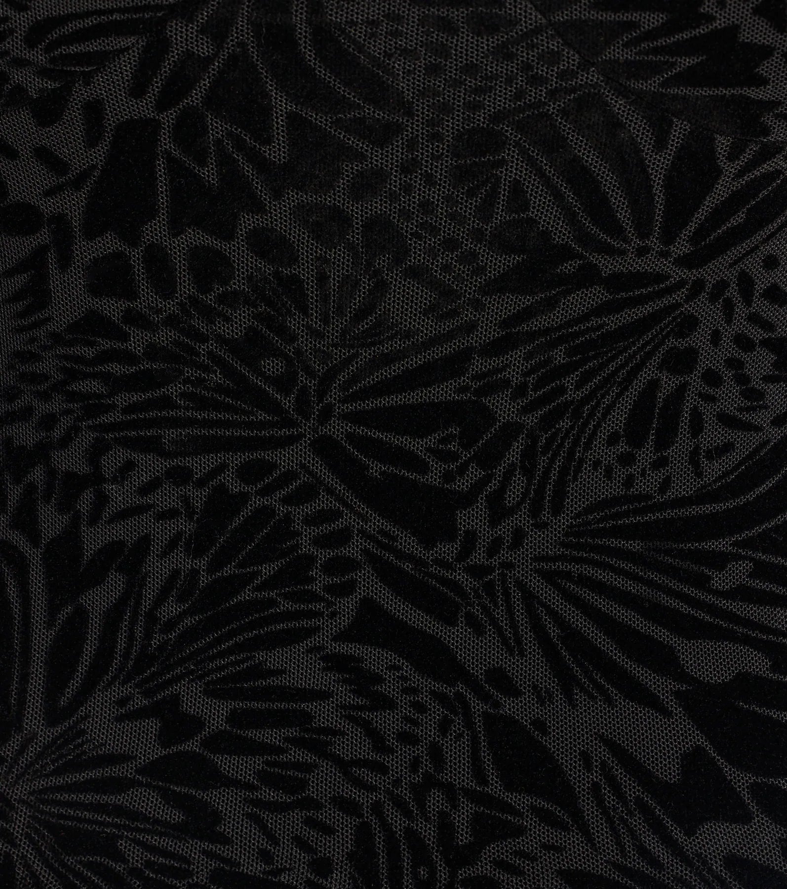 • Sheer mesh fabric with velvet flocked floral pattern. partial front knit lining
