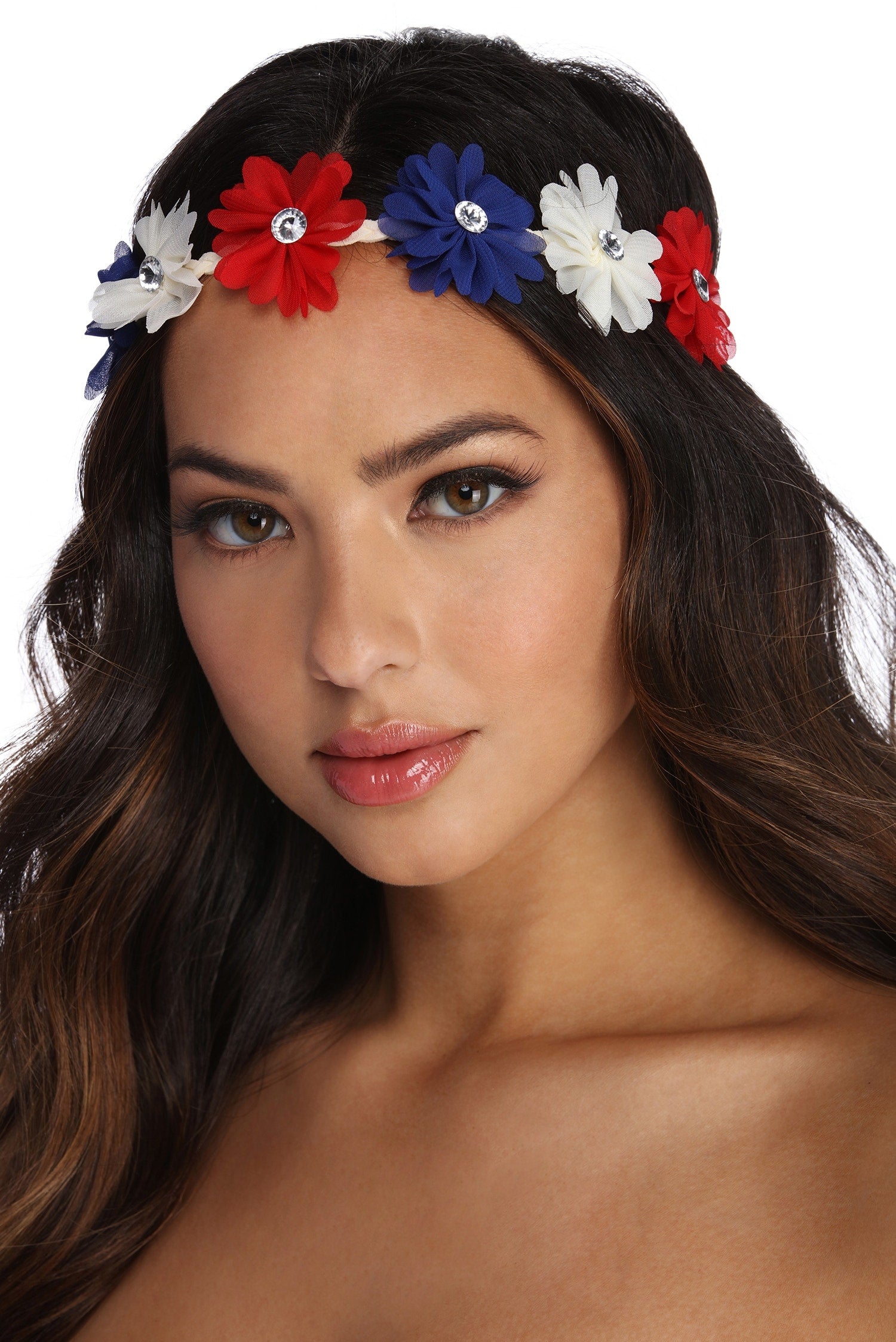 Rock an Americana look and add this flower headband to your pretty tresses! It features red. white. and navy blue flowers with rhinestone accents attached to a braided material with an elastic banded back.