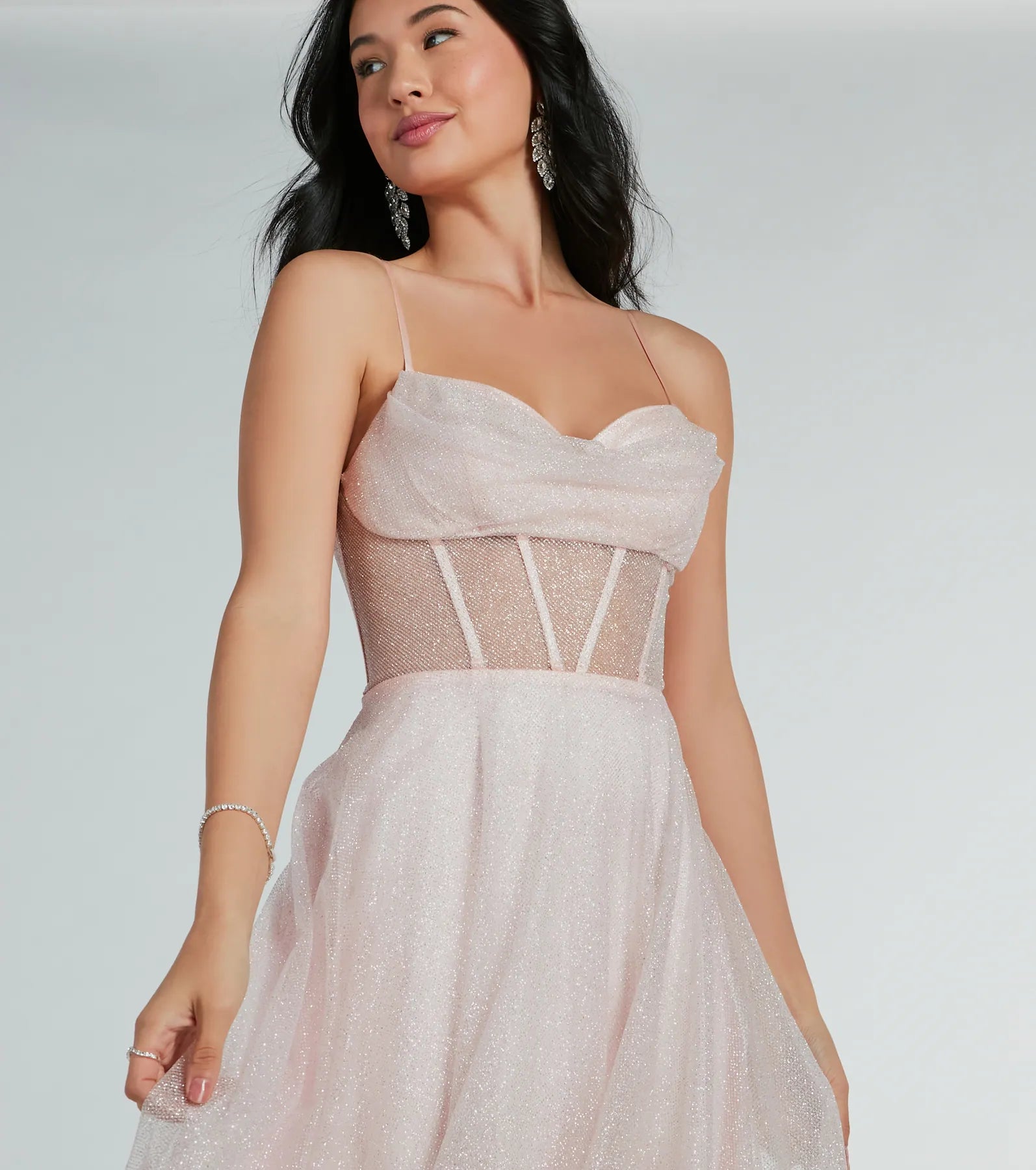 Sparkling glitter transforms the Ariel formal dress into a dream for prom and fancy birthday celebrations! She’s crafted from glitter mesh fabric and satin lining provides a lavish finish to your evening. The cowl neckline. padded bust. and sheer corset bodice with flexible boning offer a luxurious fit. while the A-line silhouette and bonded floor-length hem create a graceful silhouette. Complete the look with elegant and block heels.
