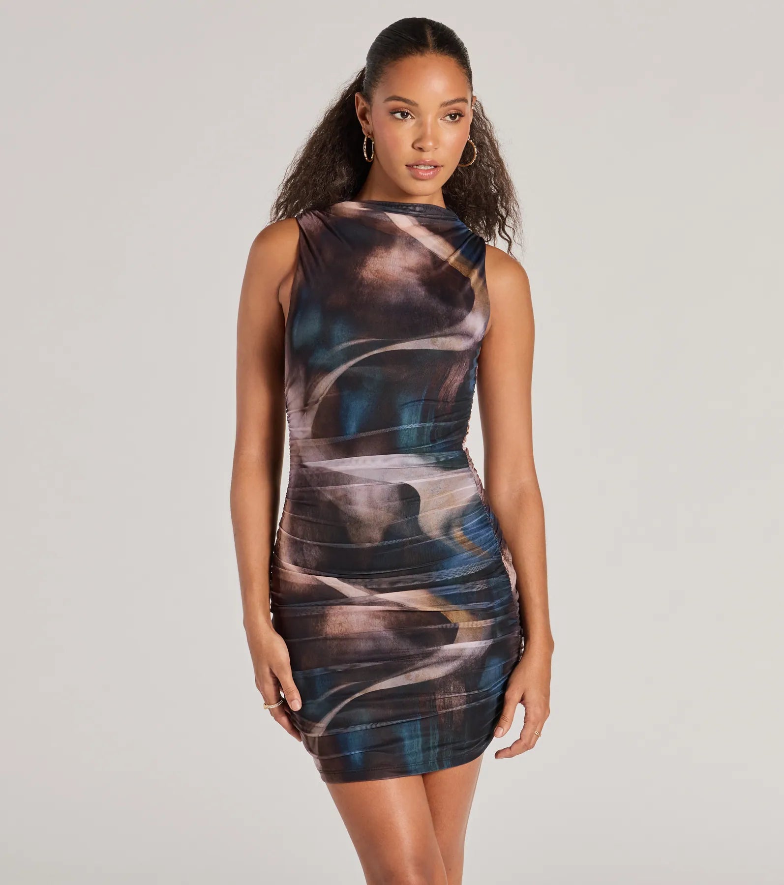 A sleeveless mesh mini dress features a crew neckline and flattering side ruched seams to enhance your curves along the bodycon silhouette. The mesh fabric showcases an artsy abstract print for a unique look.