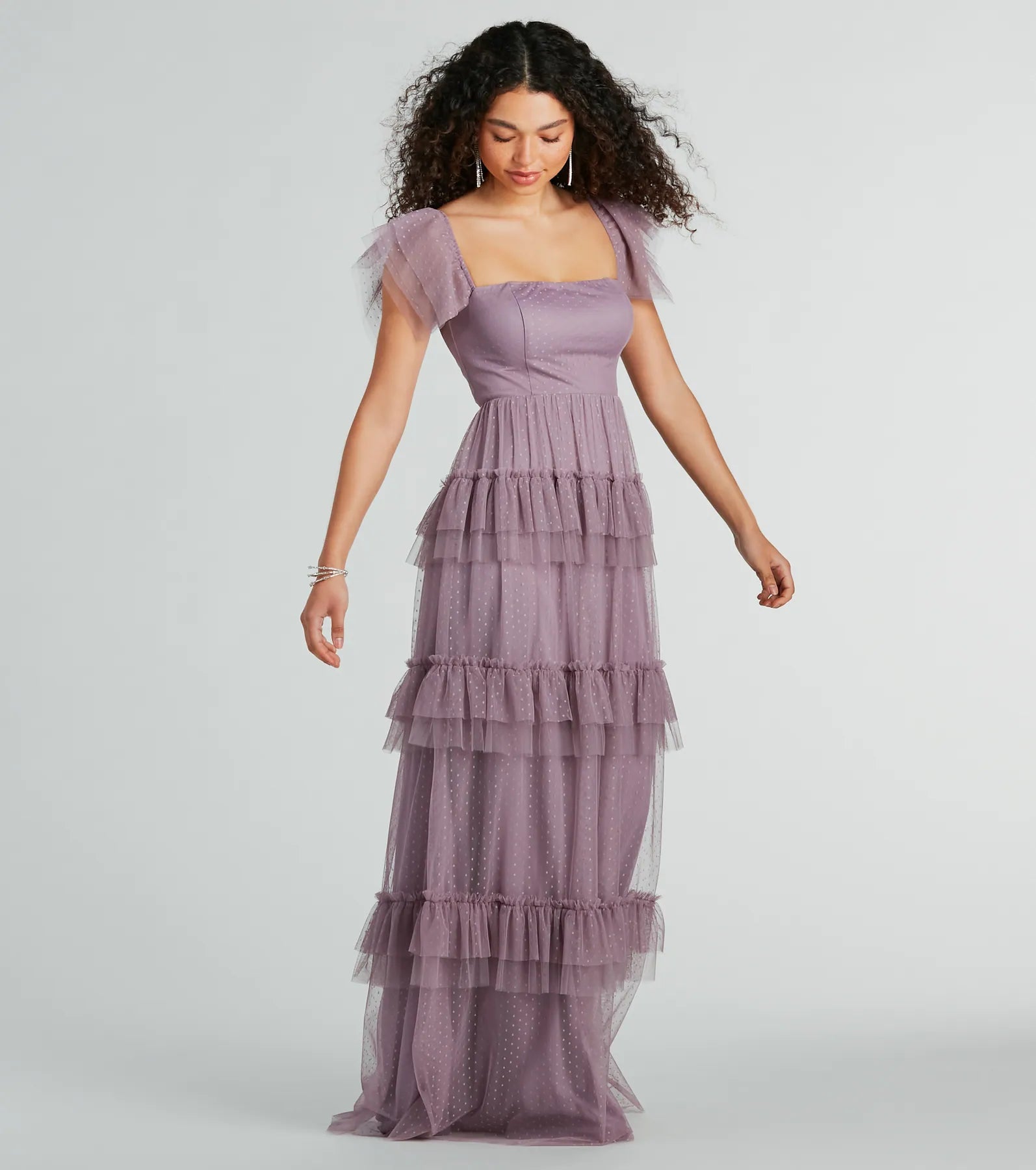 A delicate polka dot pattern covers the Arylee tulle formal dress – a romantic gown for bridesmaids. wedding guests. or banquets! With sheer tiered short sleeves and a square neckline. this floor-length formal dress exudes luxury and charm. The A-line silhouette and tiered ruffles add a touch of femininity. while the non-slip grip lining along the neckline ensures a flawless fit. Complete the look with and strappy heels.
