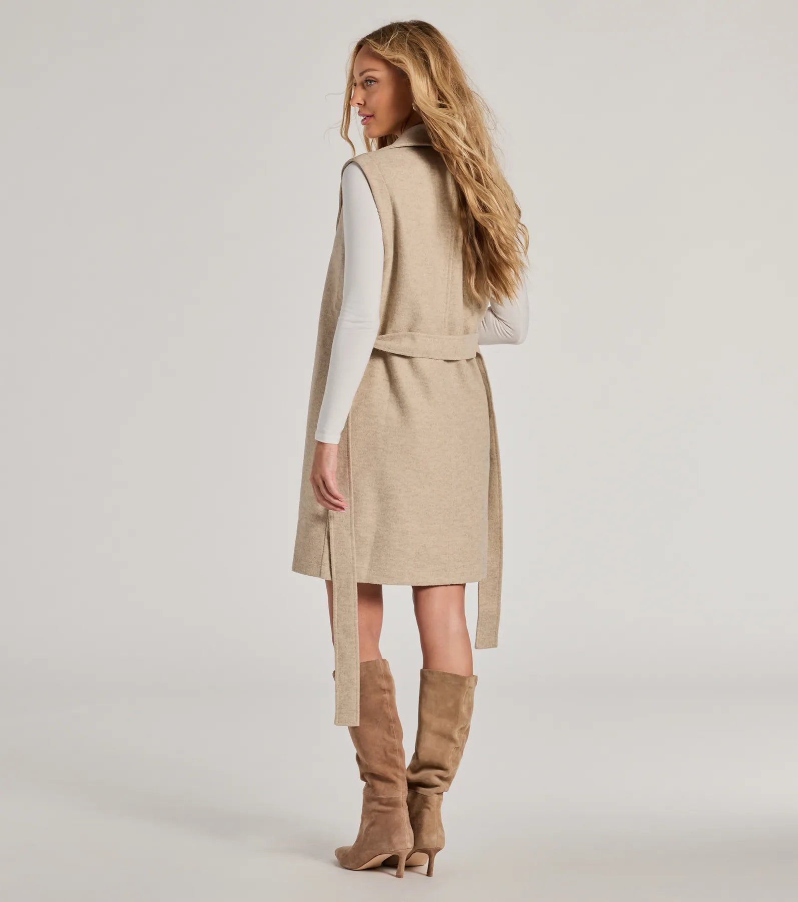 Feel the brisk chill in the air looking so chic in this faux wool long belted vest with a tie-front and dual side pockets to keep your hands warm. Pair with boots.