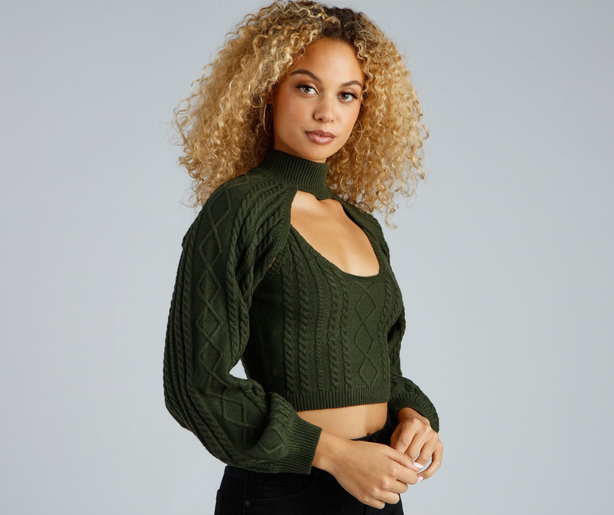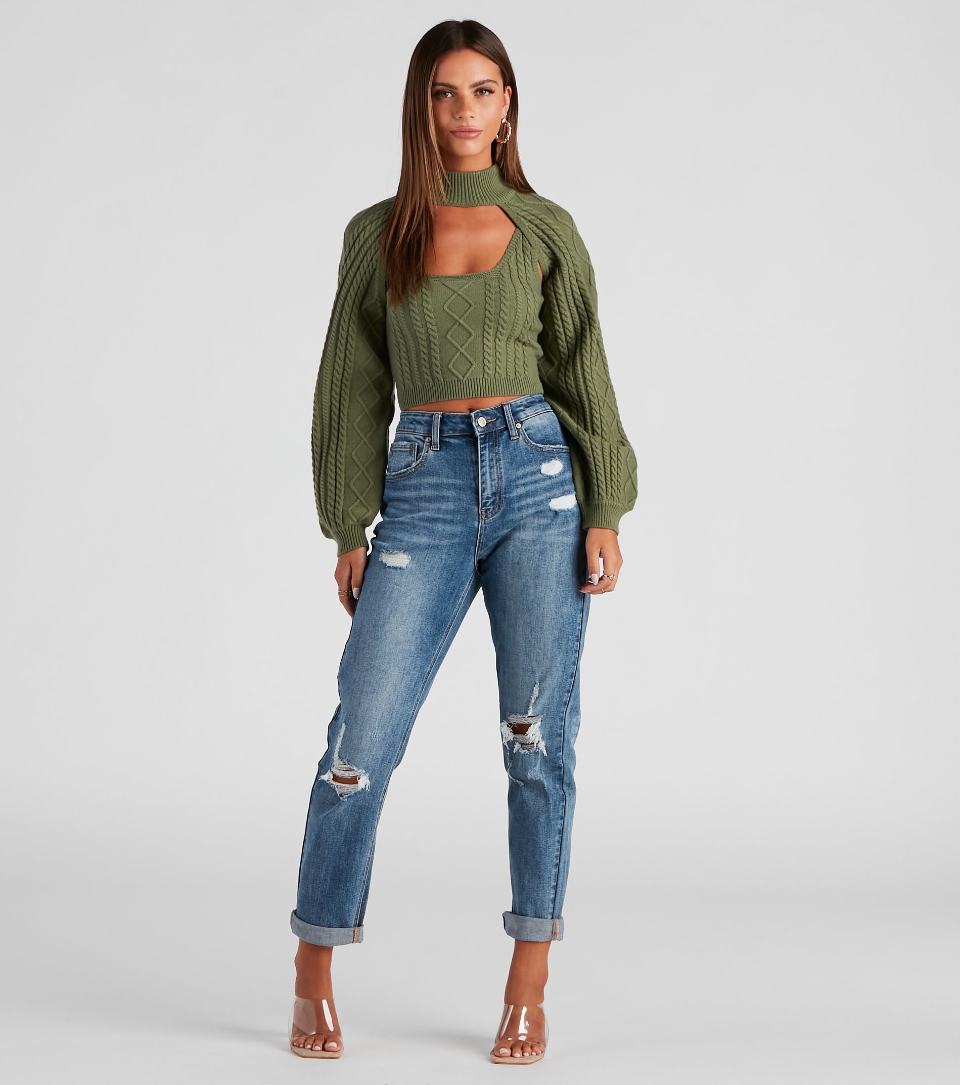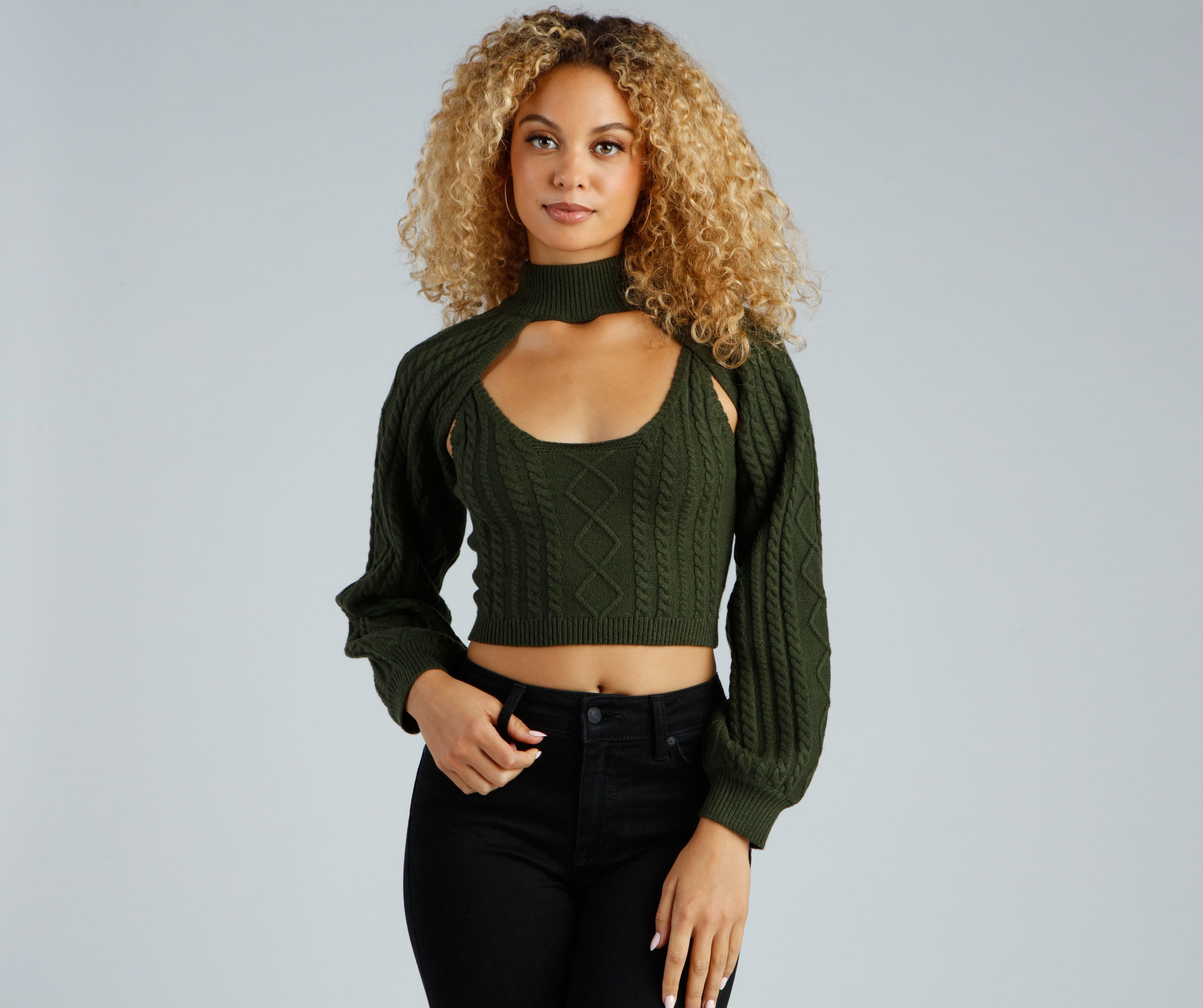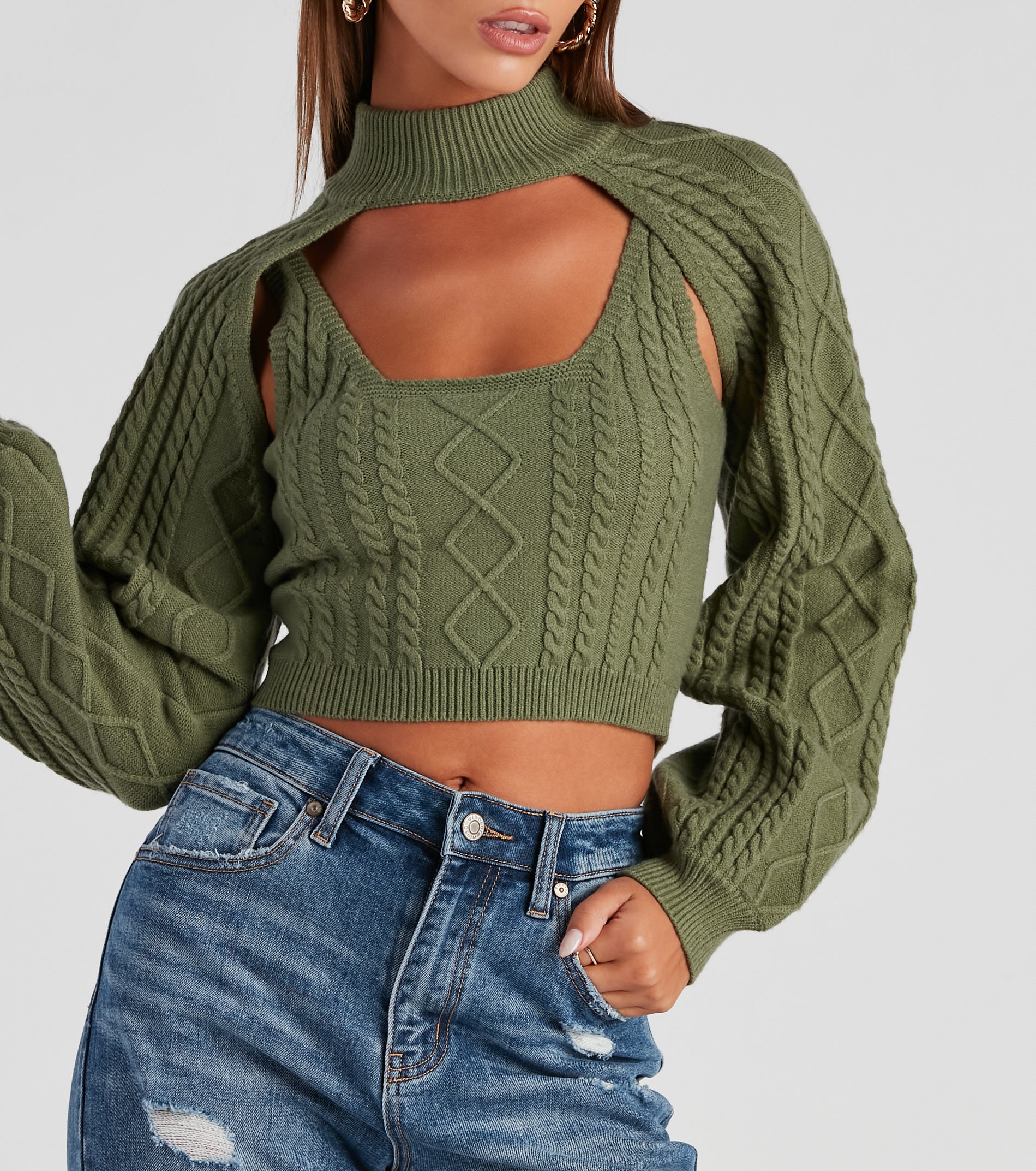 This mock neck sweater top has landed in the harvest for this season! It features puff long sleeves and a cable knit fabric with a moderate stretch. Complete the look with the matching tank top.