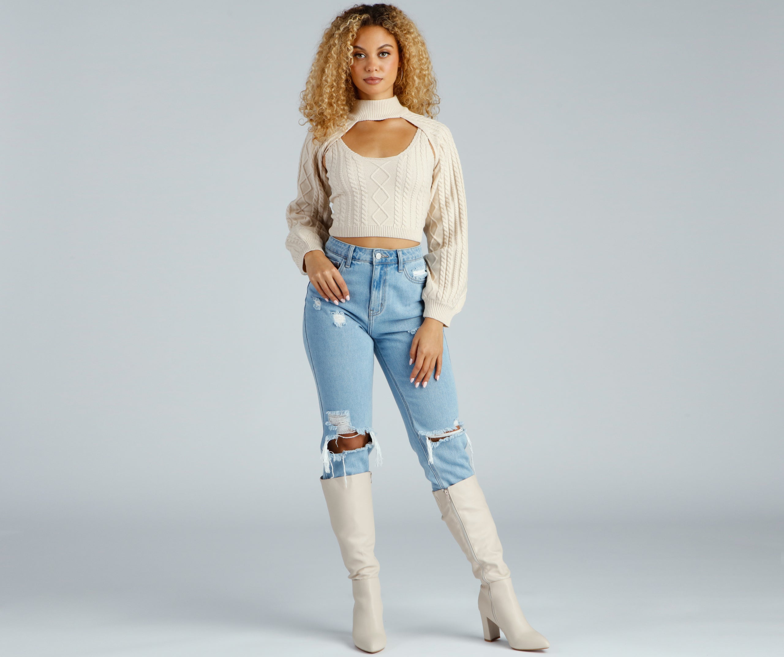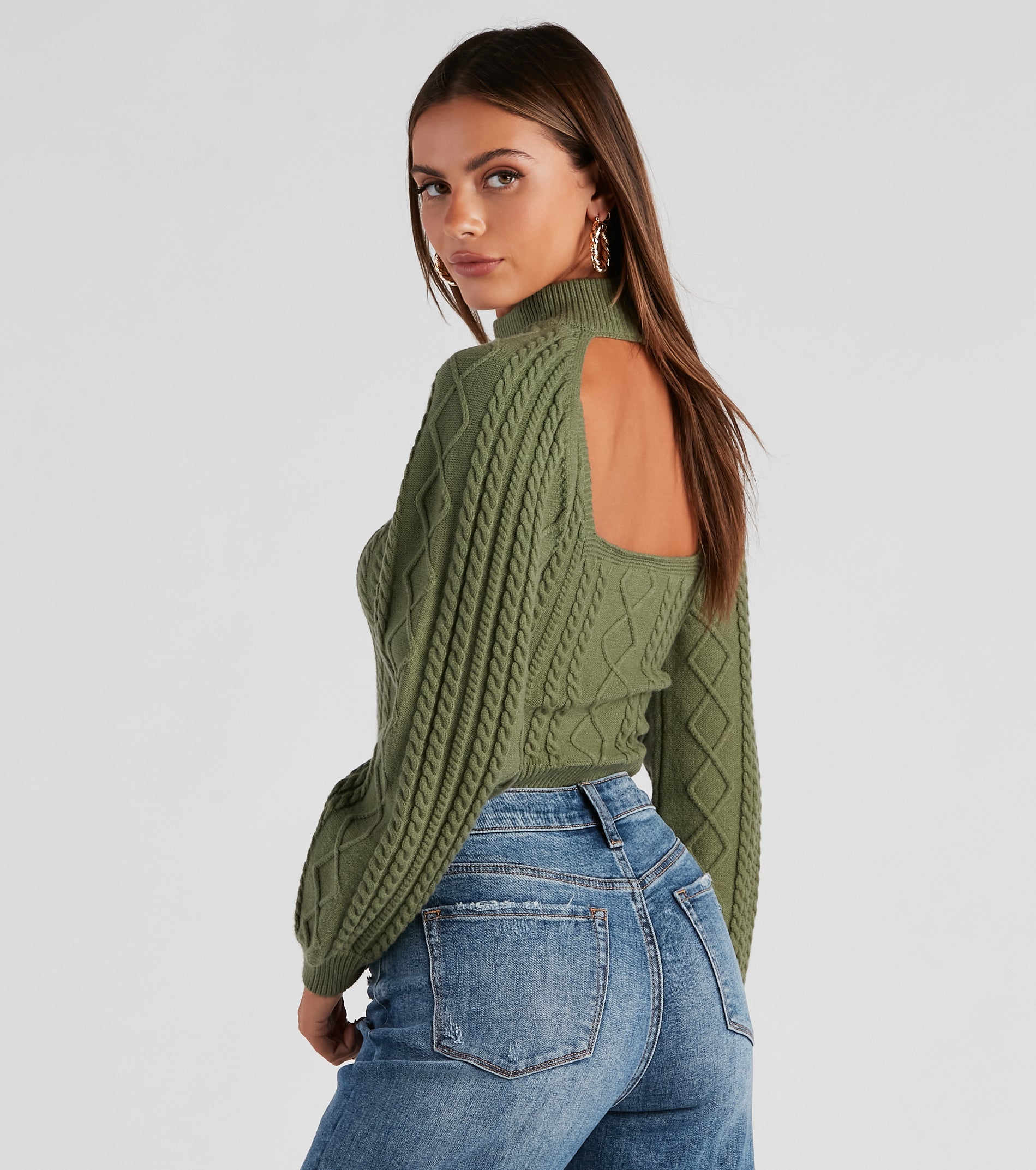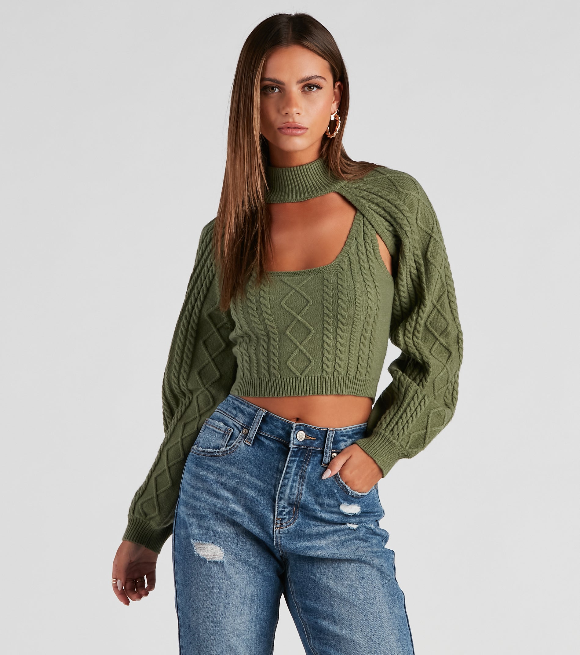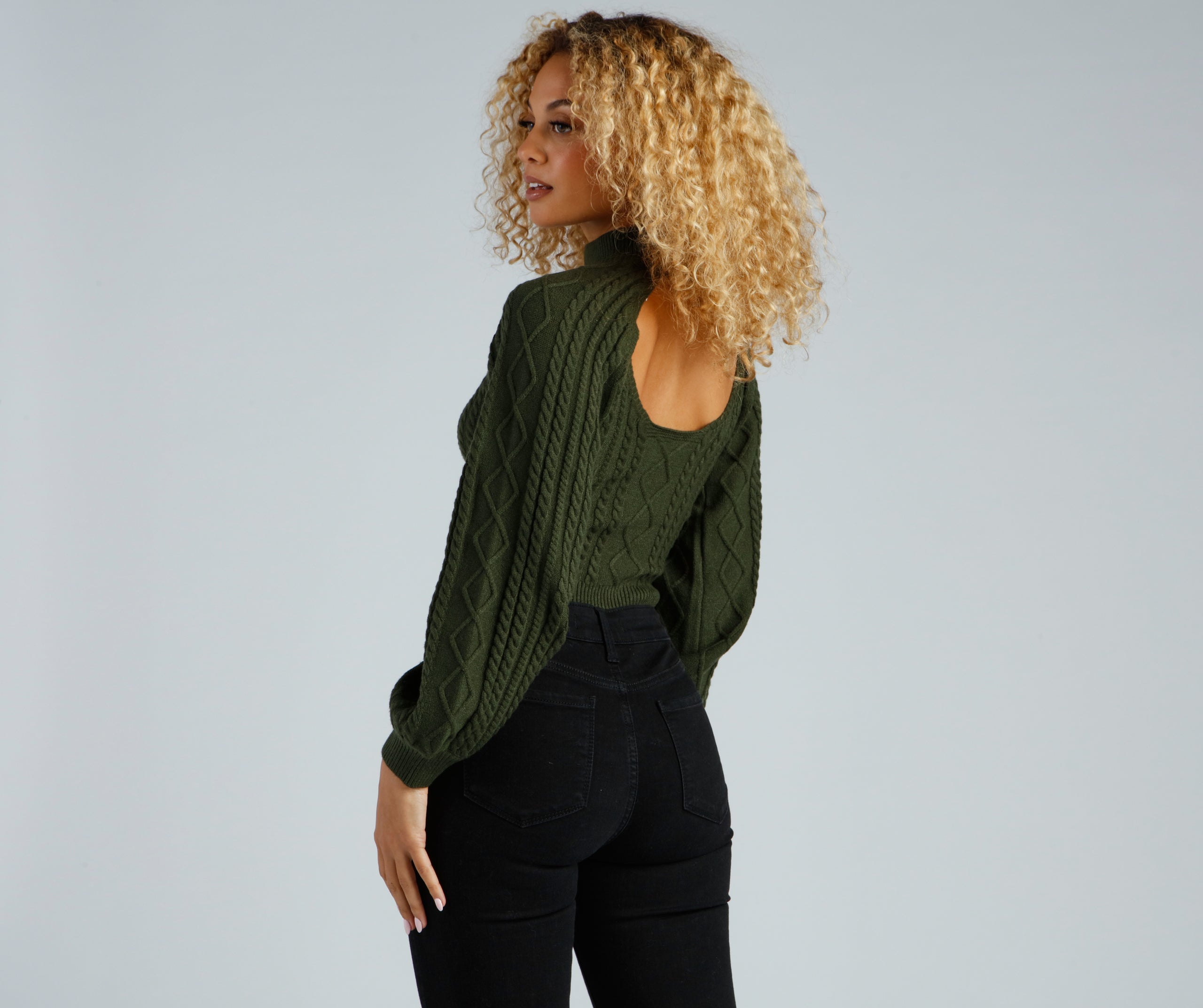 This mock neck sweater top has landed in the harvest for this season! It features puff long sleeves and a cable knit fabric with a moderate stretch. Complete the look with the matching tank top.