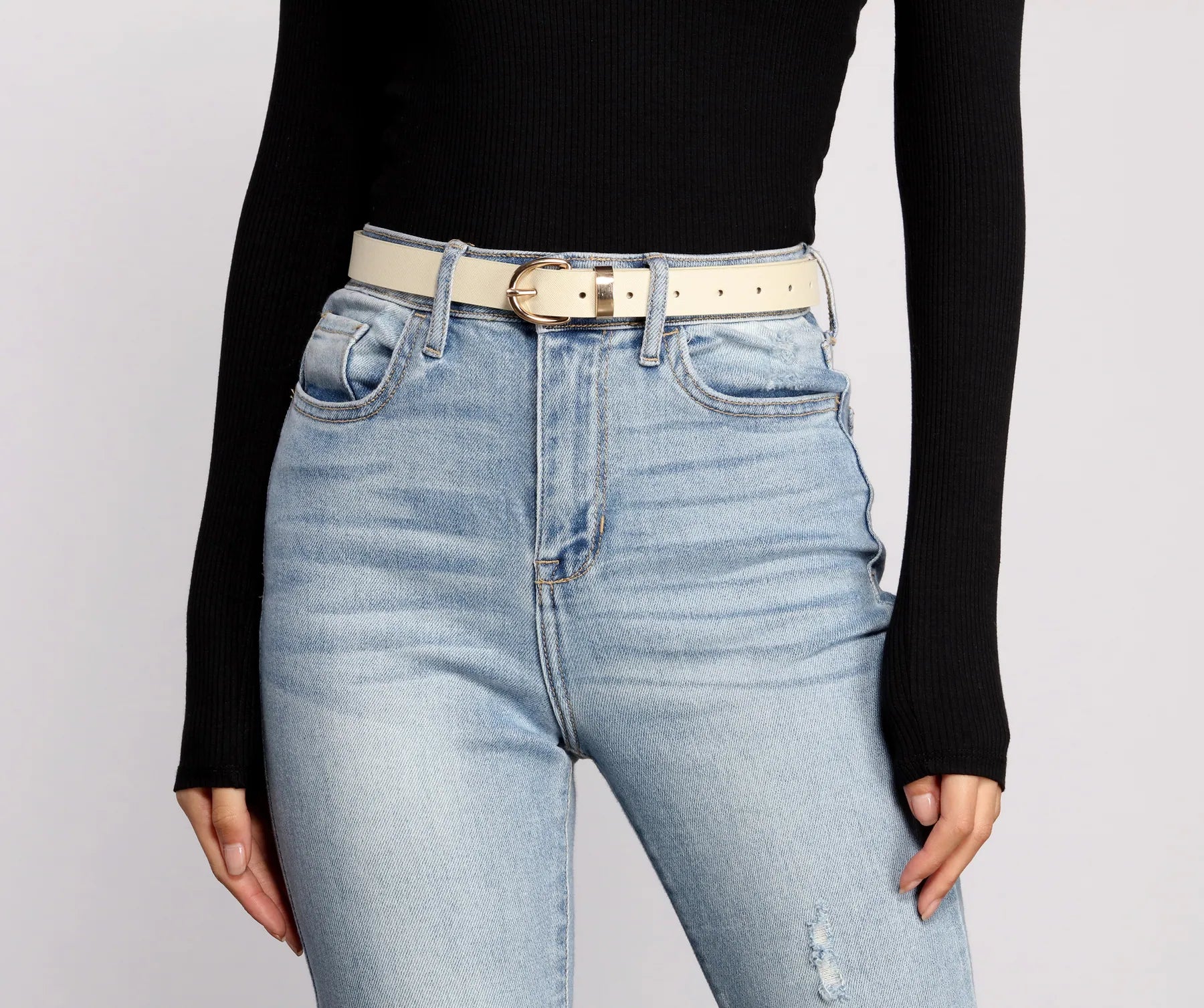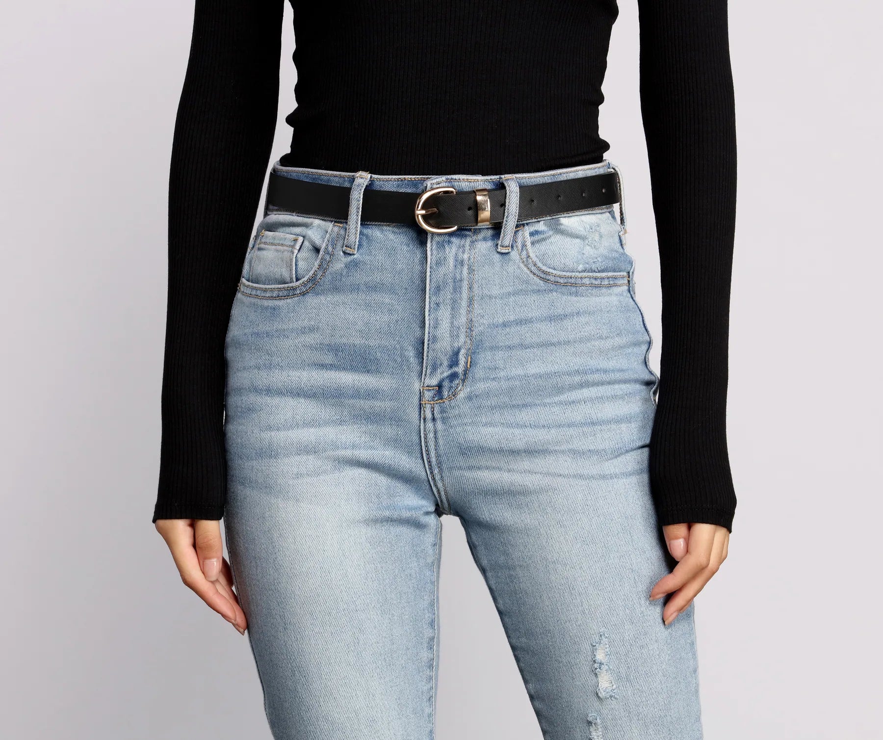 Stay chic with a sleek minimal belt. Keep it casual with a sleek minimal belt that features a narrow faux leather strap. punch holes. and a small gold buckle with a belt loop. The pack includes three belts in neutral hues. Pair belt with to complete look.