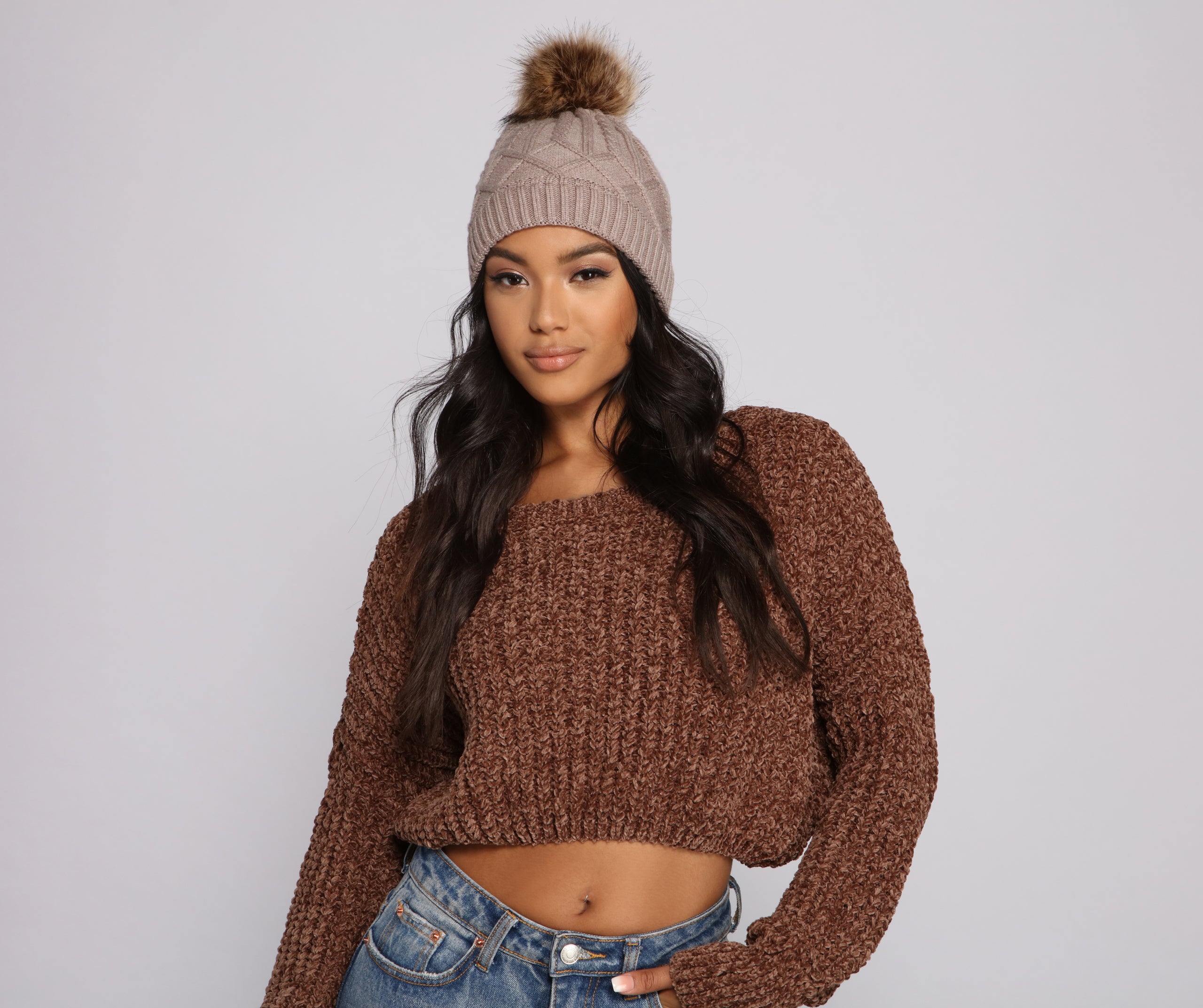 Warm up those chilly days in a beanie that keeps it cozy and cute. The beanie features a cable knit material. a traditional fit. and a pom pom accent. Complete look with a and high waist jeans.?