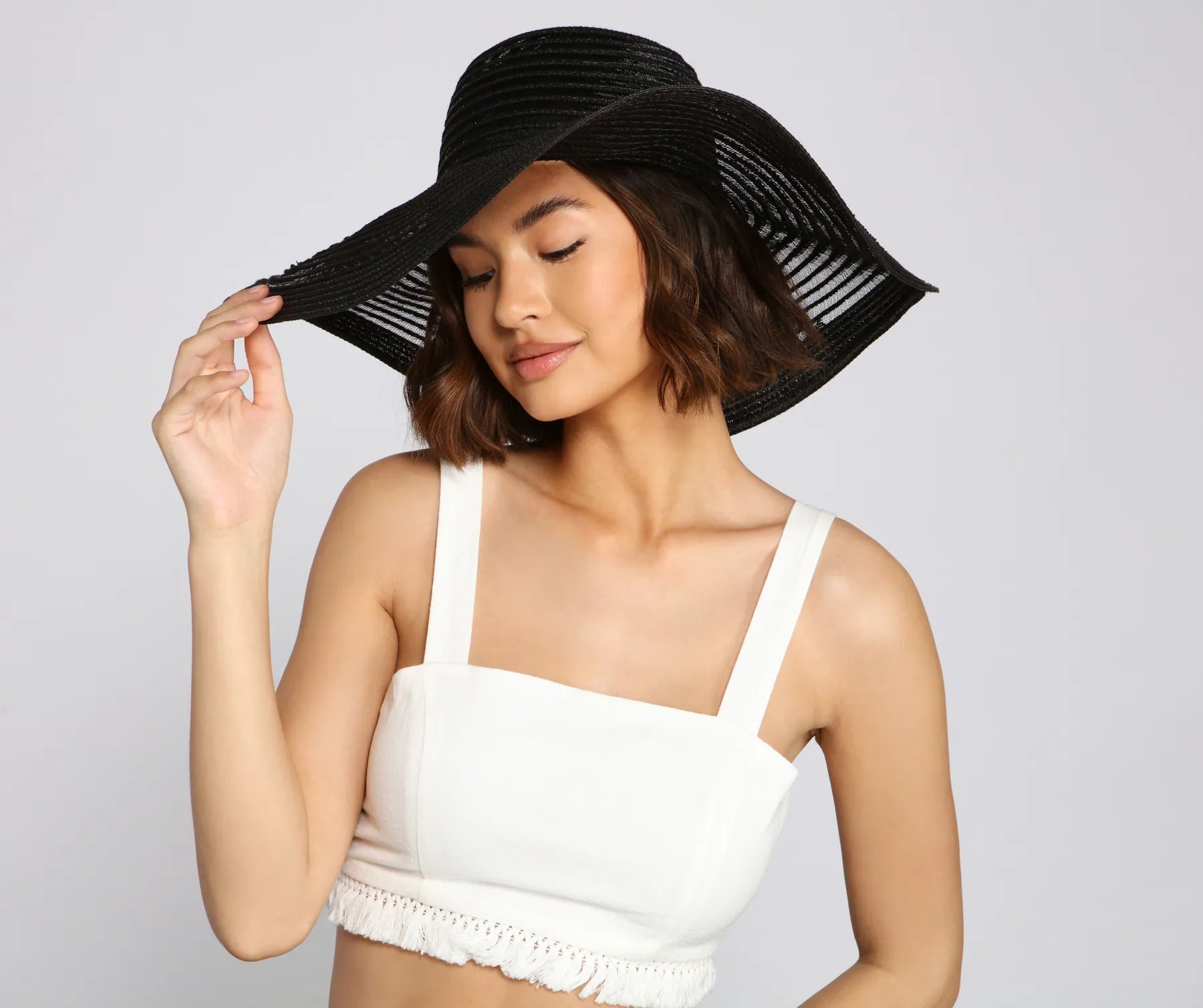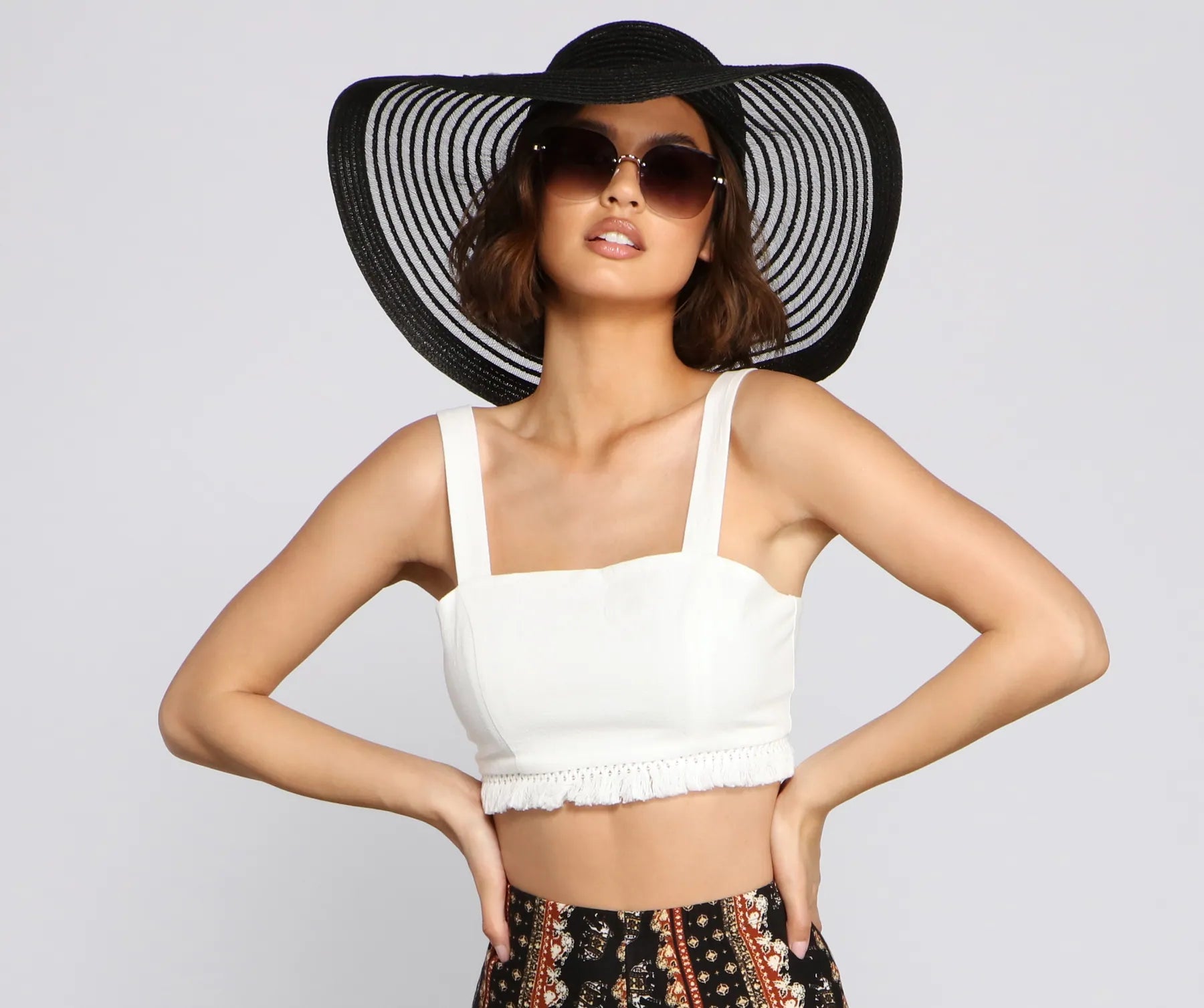 Have a stylish beach day in this chic floppy hat! It features an illusion stripe design. Pair it with a bikini and oversized sunglasses.