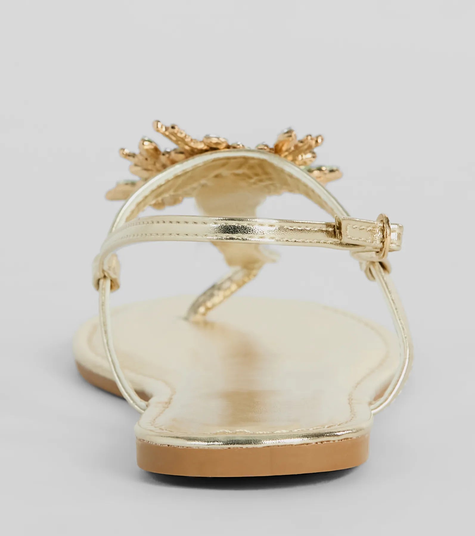 Level up your fabulous vacay ‘fits with these glam rhinestone metallic sandals! Made with sleek faux leather with a metallic sheen. they feature a square-shaped toe. a thong strap with a glitzy rhinestone-embellished palm tree design. an adjustable ankle strap with a buckle closure. and a flat sole for comfortable wear. Style with a and hoop earrings for a beachside dinner!