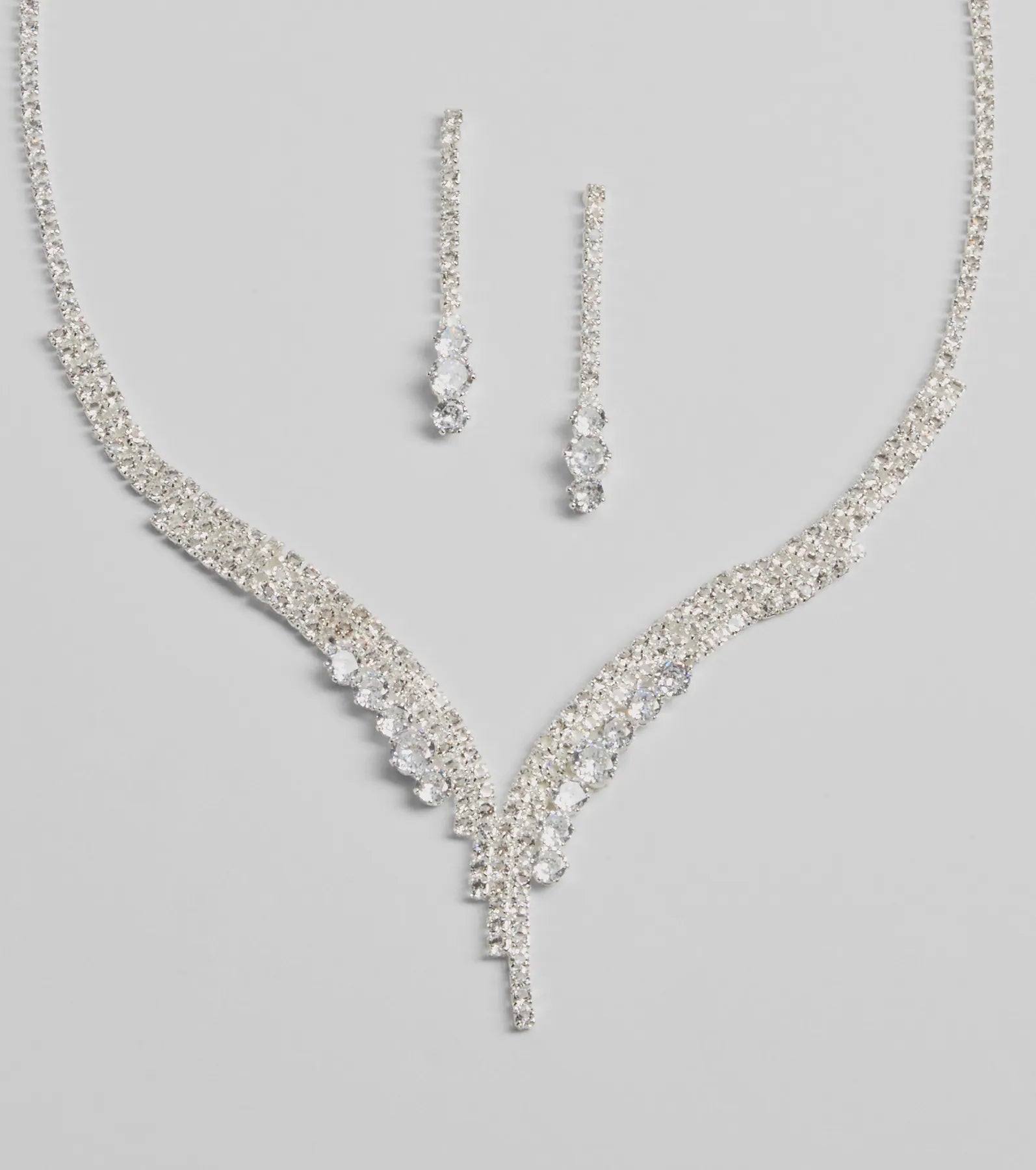 Elevate your formal wear beauty in this necklace and earrings set for a perfect look! The necklace features a decadent design glimmering with rhinestone embellishments in a V-cut design with matching dangly rhinestone earrings. Complete the look with a glamorous for a special occasion!
