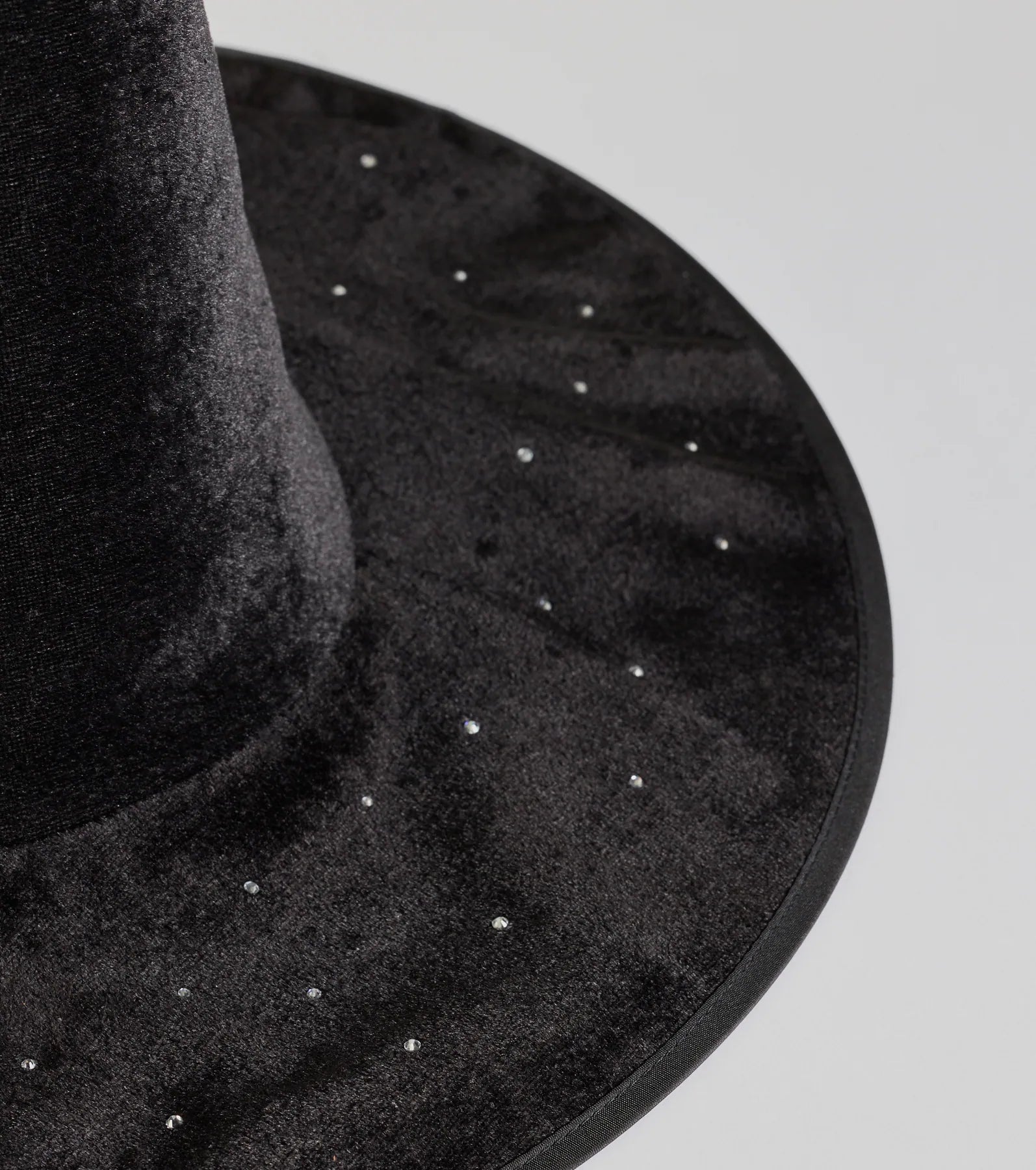 Bewitch this Halloween with this witch hat with a wide brim and a velvet fabrication adorned with rhinestones on the brim. Complete your costume with a black dress and sheer tights.