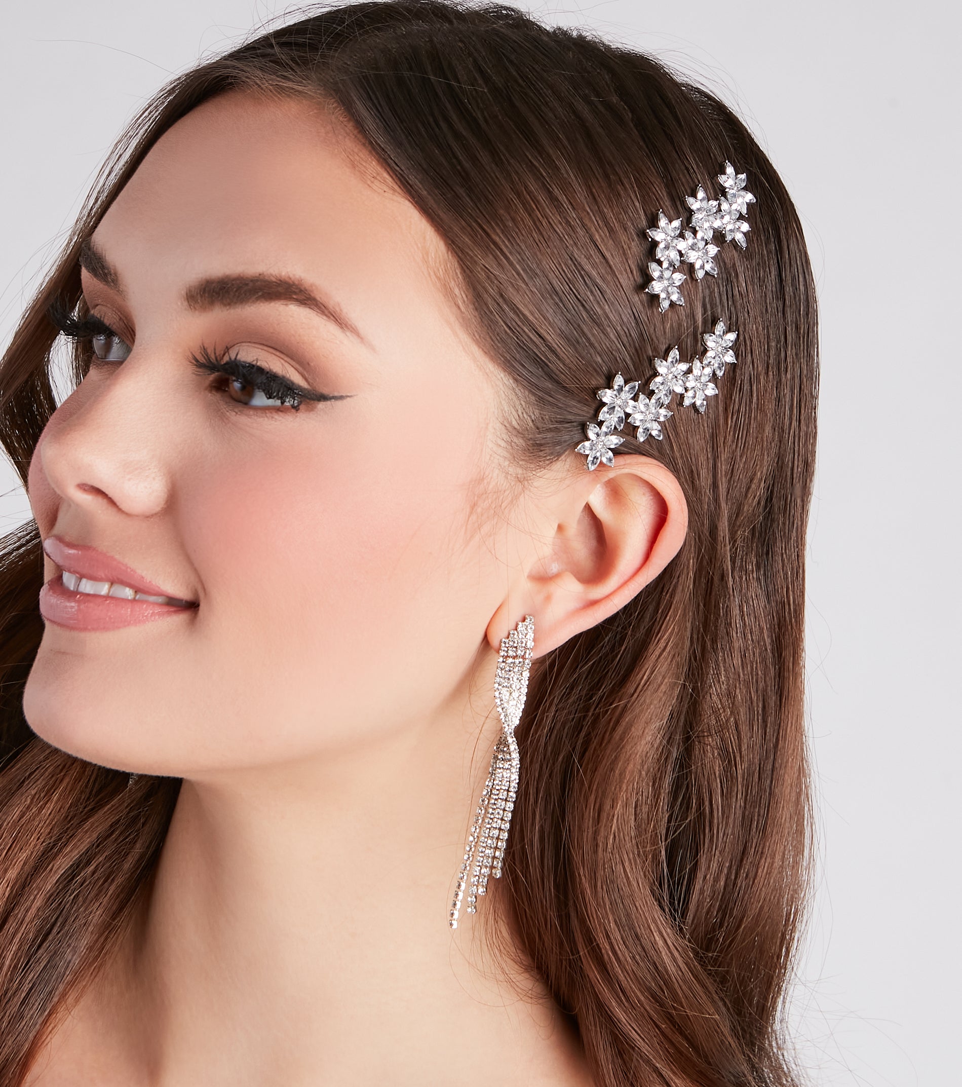 Bloom with glamour with this sparkly rhinestone barrette set! It features two matching clips with rhinestone embellishments in stunning floral designs. Style with a .