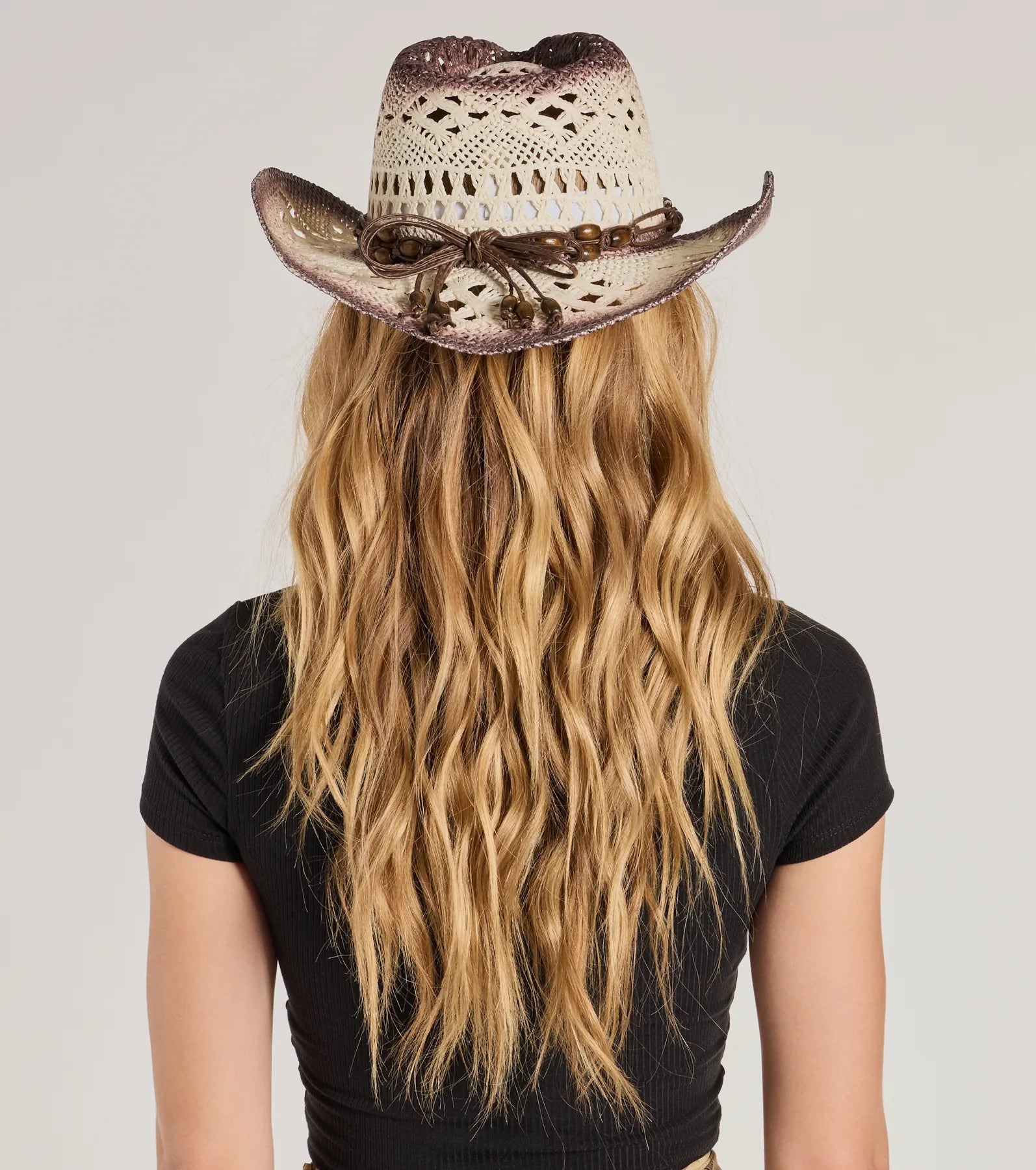Top off your boho babe look for out west in this straw cowboy hat! It features a beaded string band with a string bow tie. a curved wide brim to offer stylish sun protection. and an elasticized inner band for a snug fit. Complete the look in .