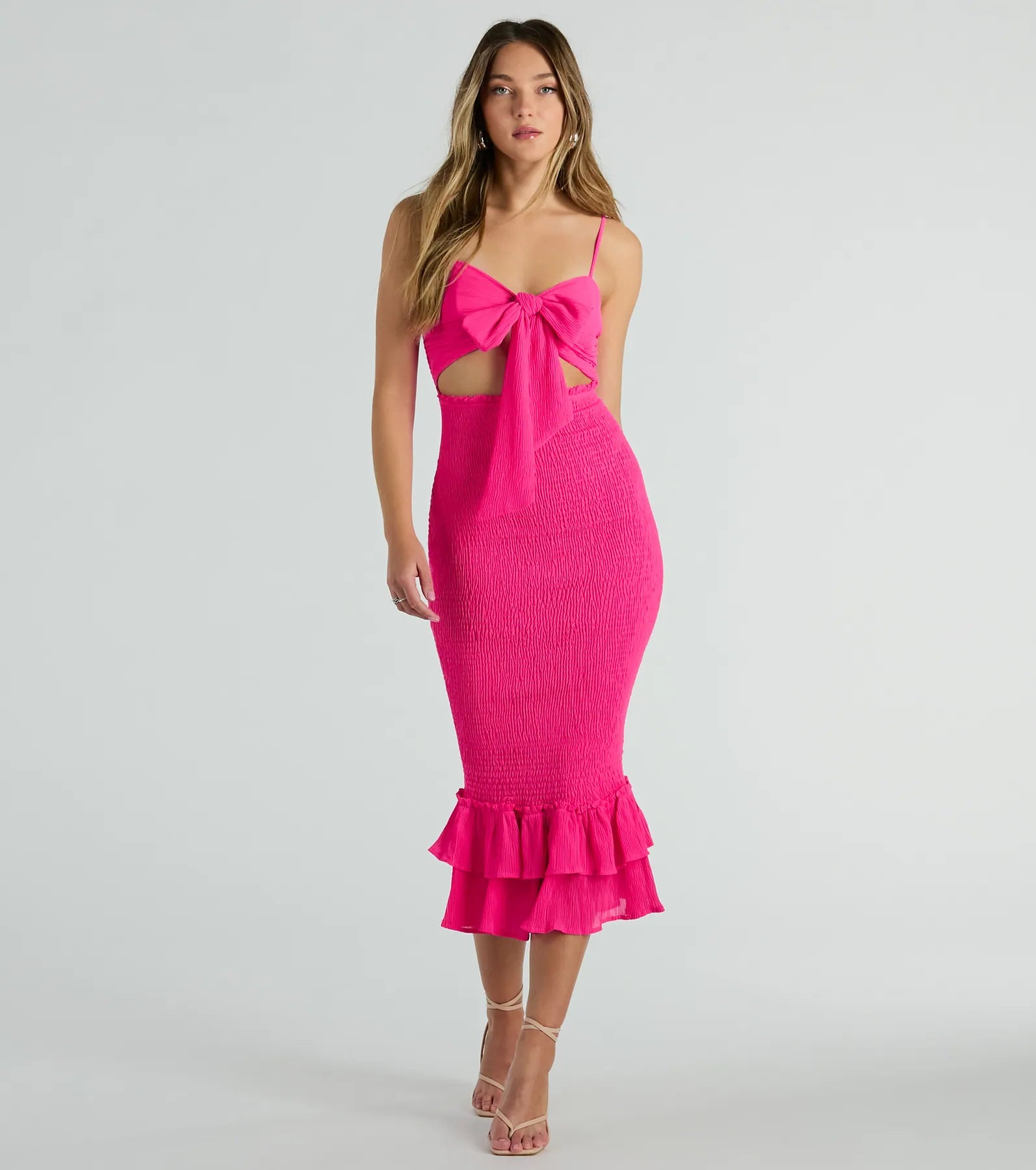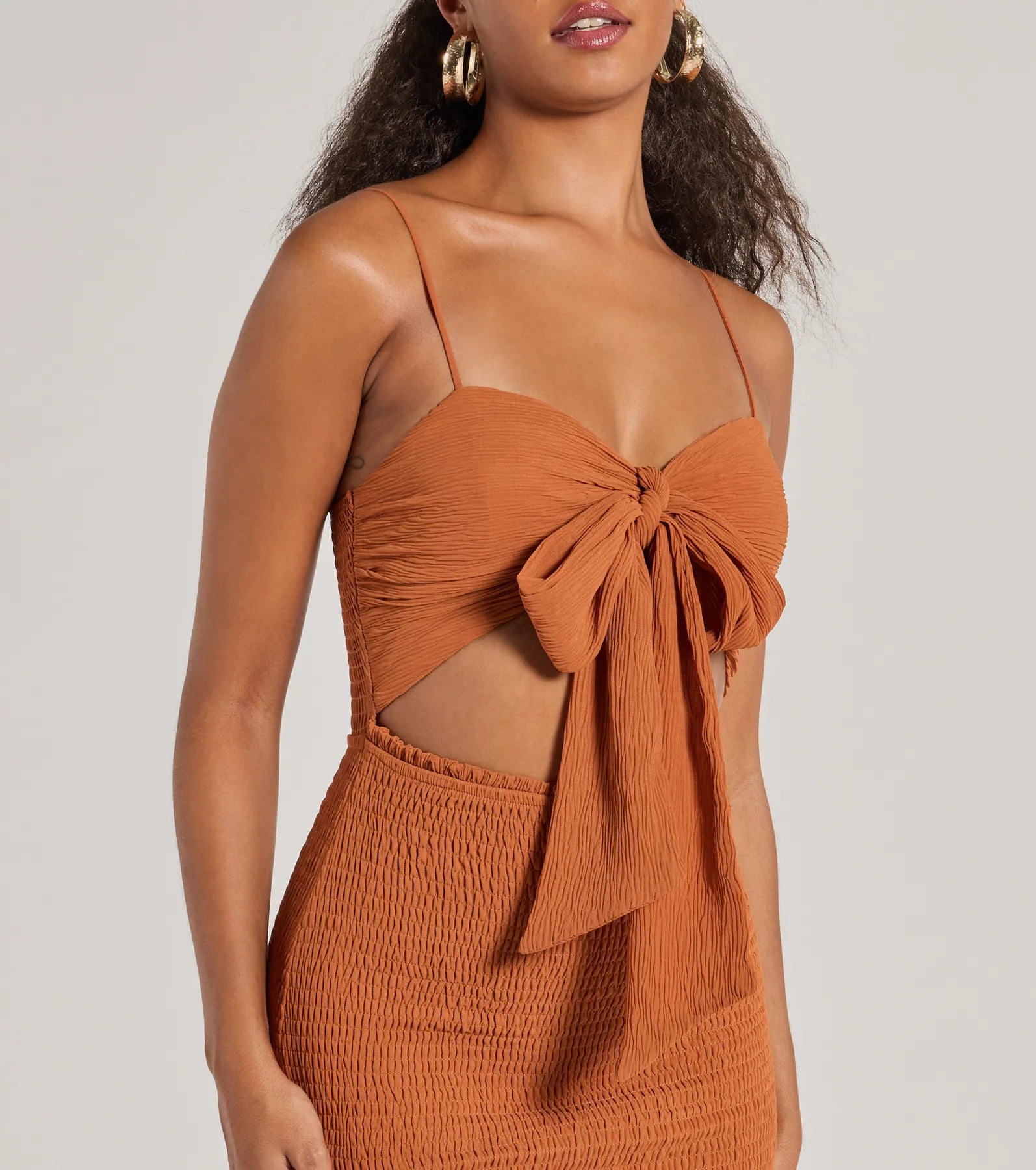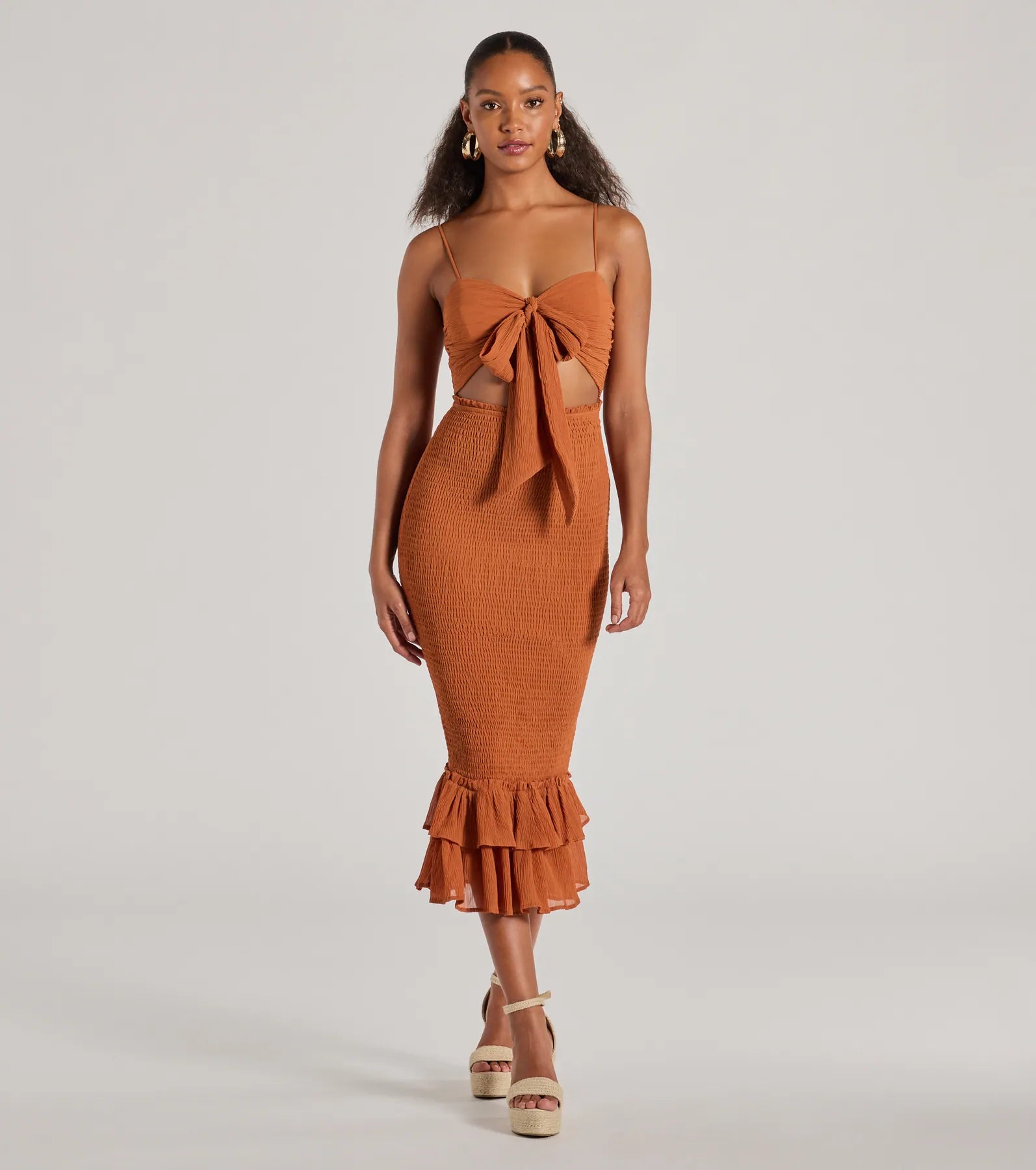 Show up and stun at a summer party like the bold babe you are in this fab midi dress! Designed with a crinkled chiffon fabric. the mid-length dress features a smocked body for added stretch along the figure-flaunting bodycon silhouette. The sleeveless bodice is shaped with a sweetheart neckline with the cutest tie-front design at the bust. a sultry waist cutout to reveal some skin. and adjustable spaghetti straps to find your perfect fit. The layered ruffled hem adds a flirtatious allure to the iconic look. Style this midi dress with hoop earrings and !