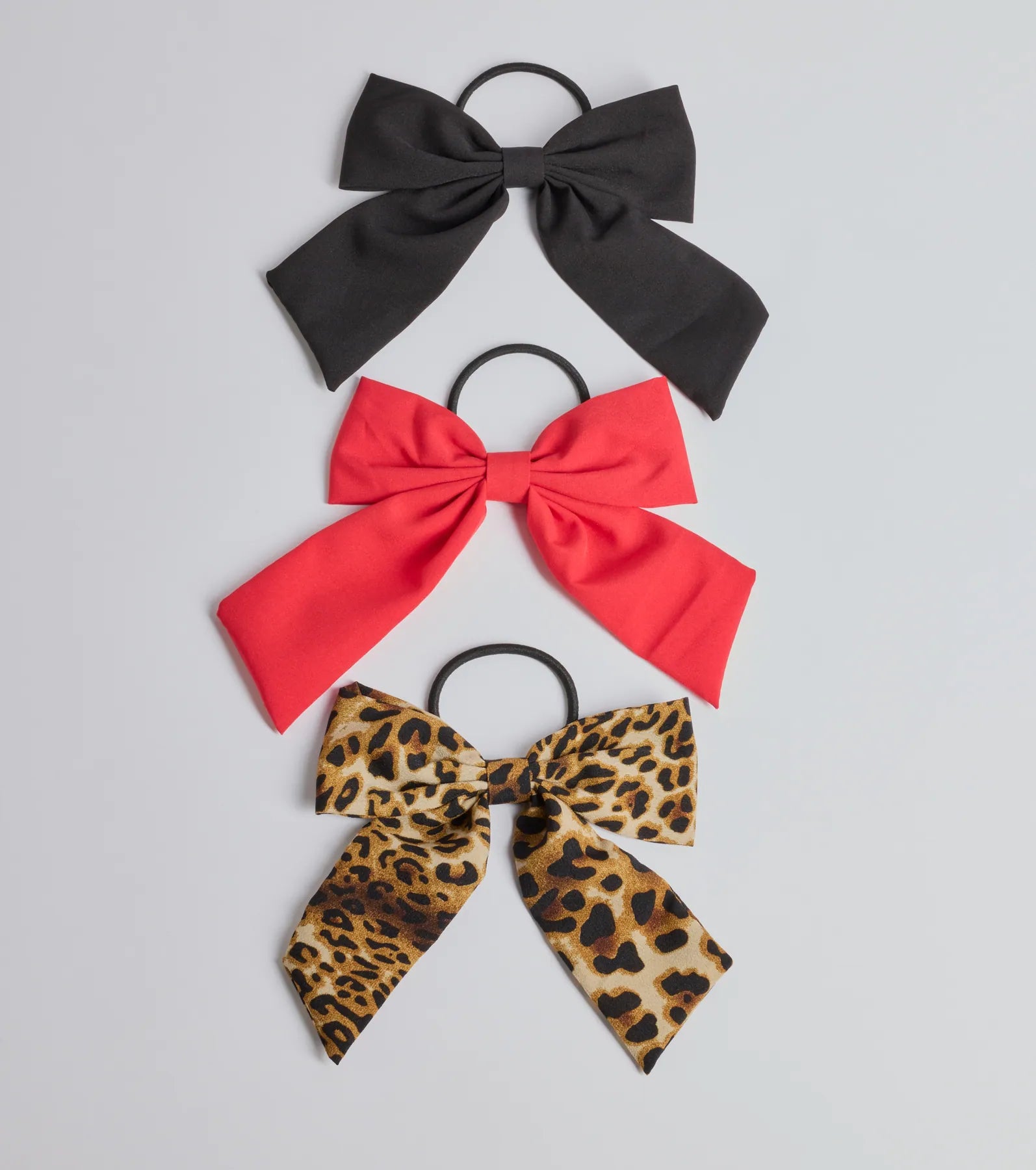 This bow hair tie three-piece set includes two solid colored hair bows and one leopard print hair bow. Perfect for everyday wear.