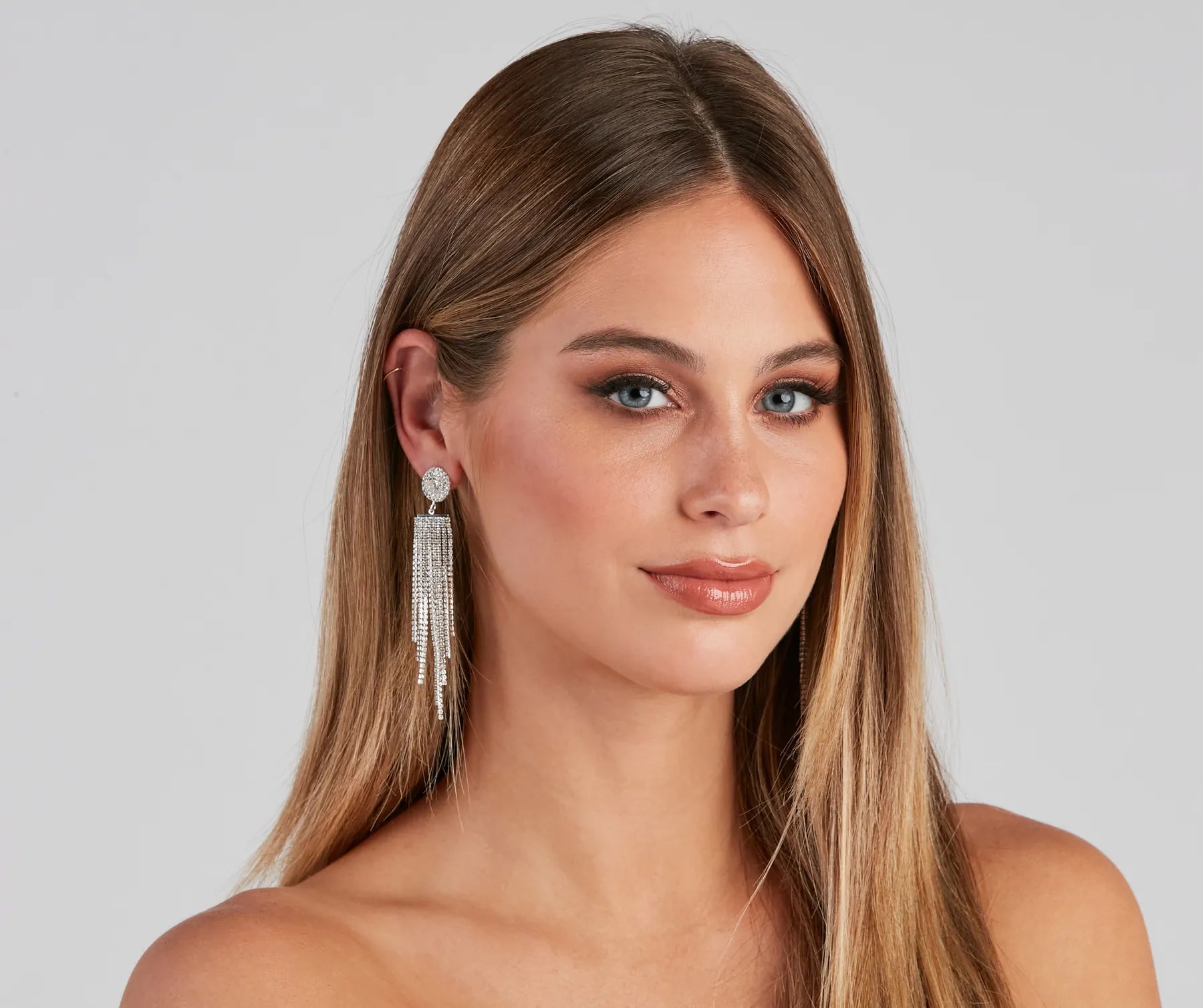 Bring the dazzle with earrings that add that extra glow to your look! The earrings feature a halo stud on post with a ten-row rhinestone fringe design. Complete look with a and heels.