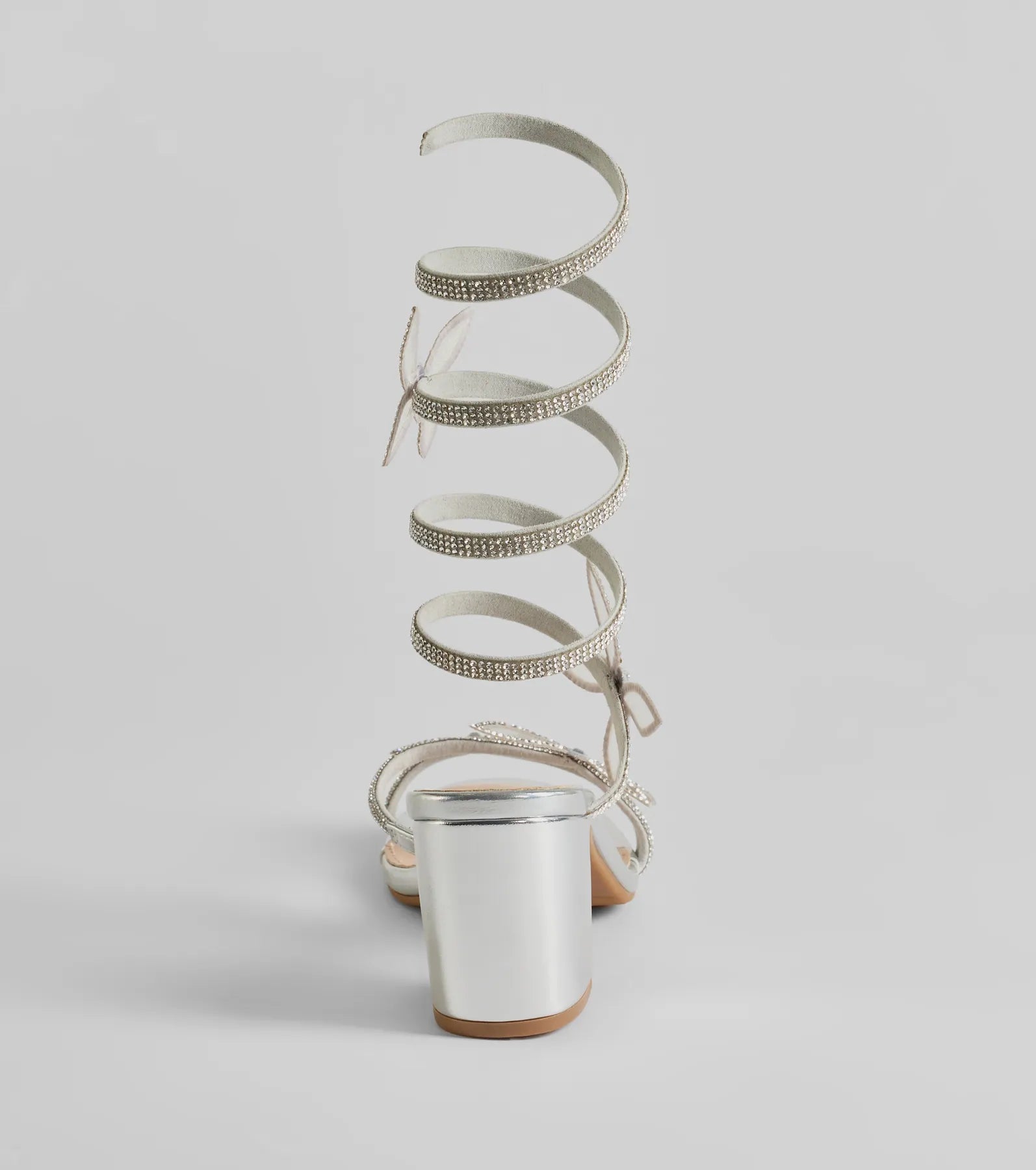 Add a whimsical effect to your look in these block heels featuring a round toe. rhinestone embellished spiral strap with butterflies. and a luxe fit cushioned insole. Perfect for styling with a clutch and jewelry.