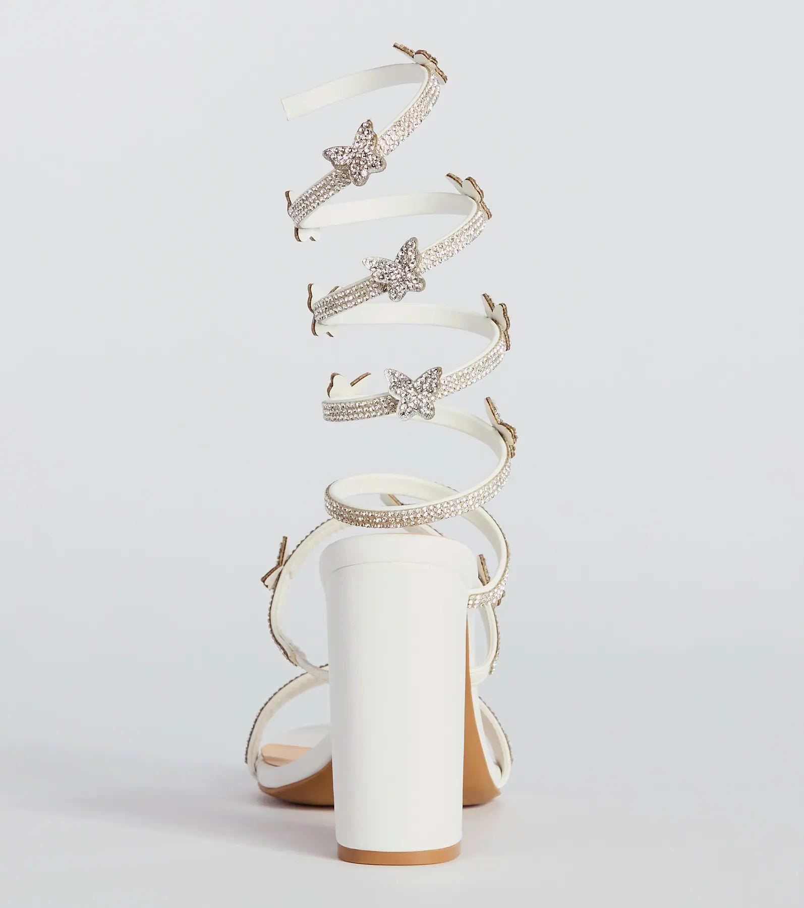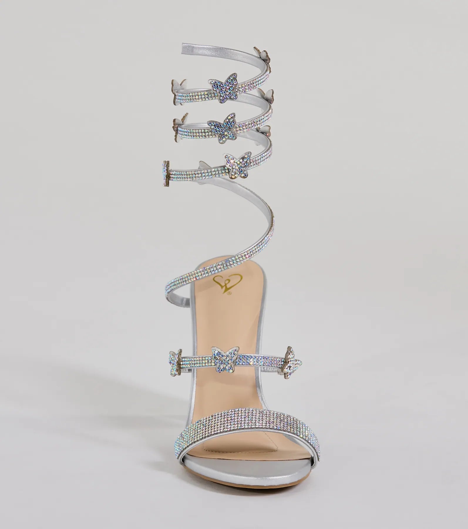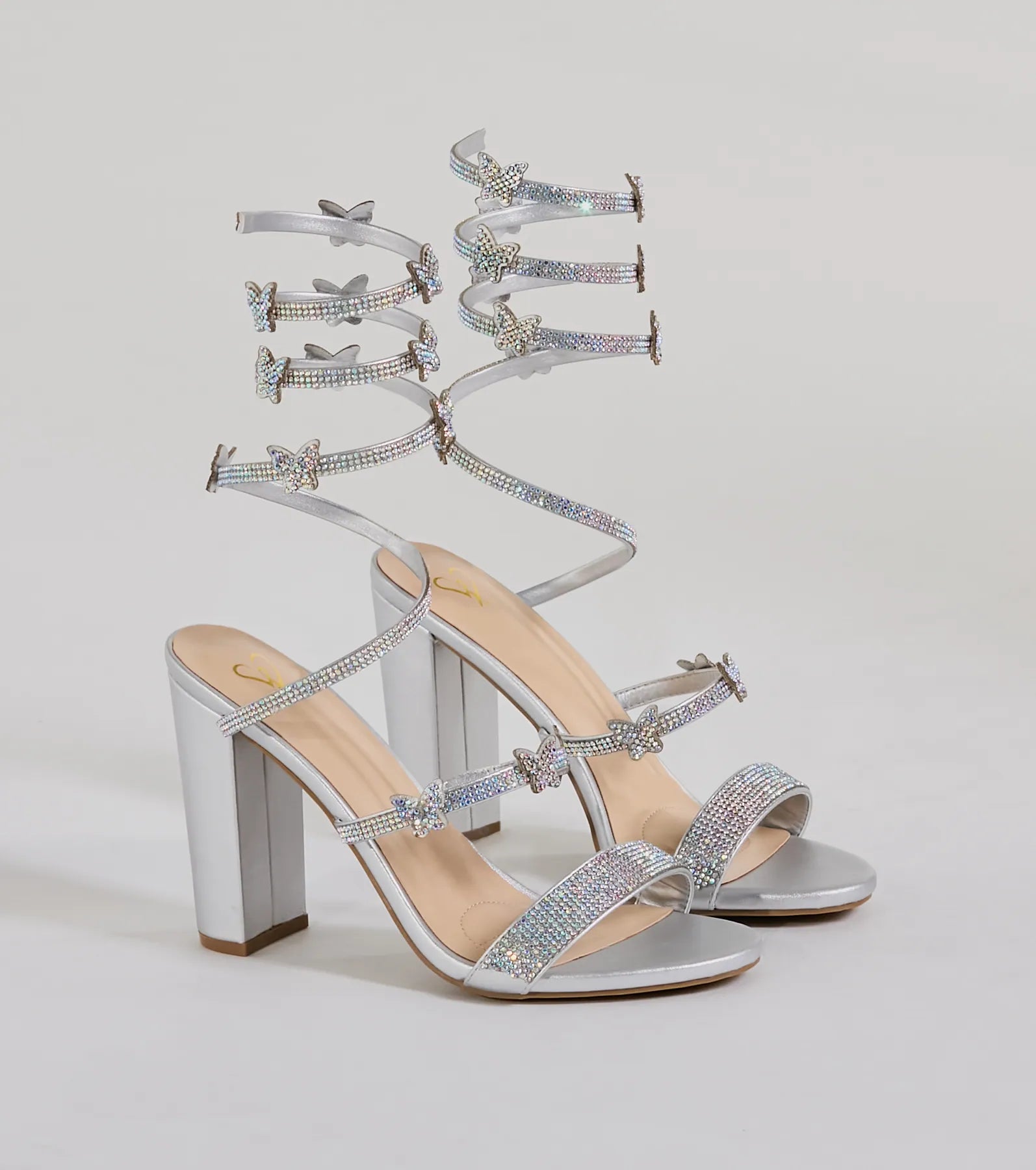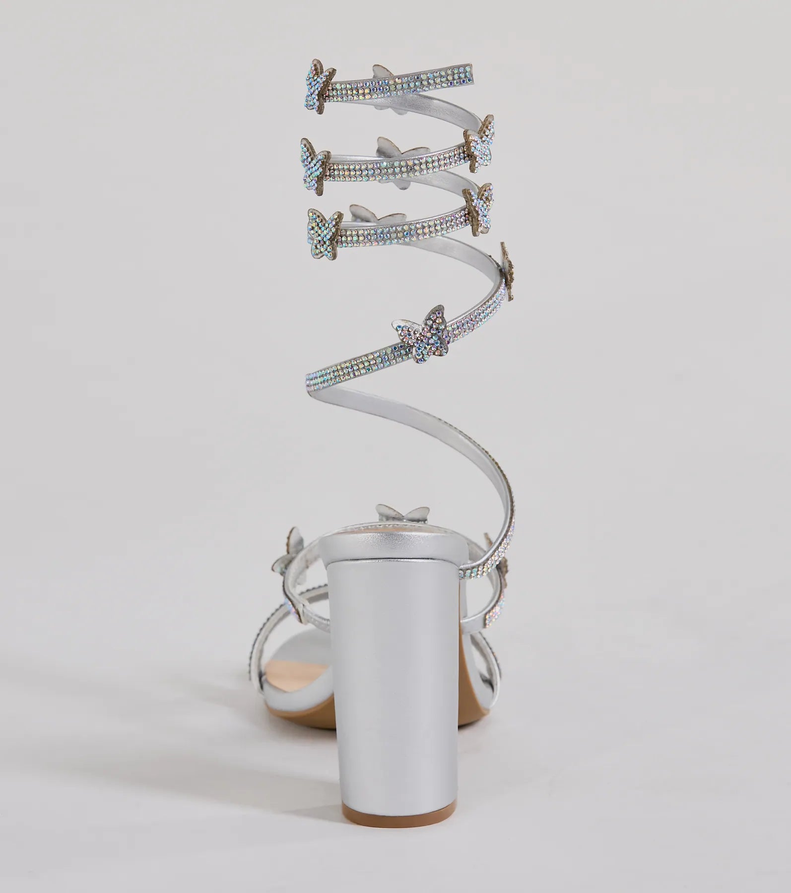 Add a whimsical mystique to your outfit with these statement metallic block heels perfect for dressy events! They feature an almond-shaped toe. a wide toe strap with mini rhinestone trim. and a spiral ankle rhinestone strap with butterfly accents. Complete the look with a