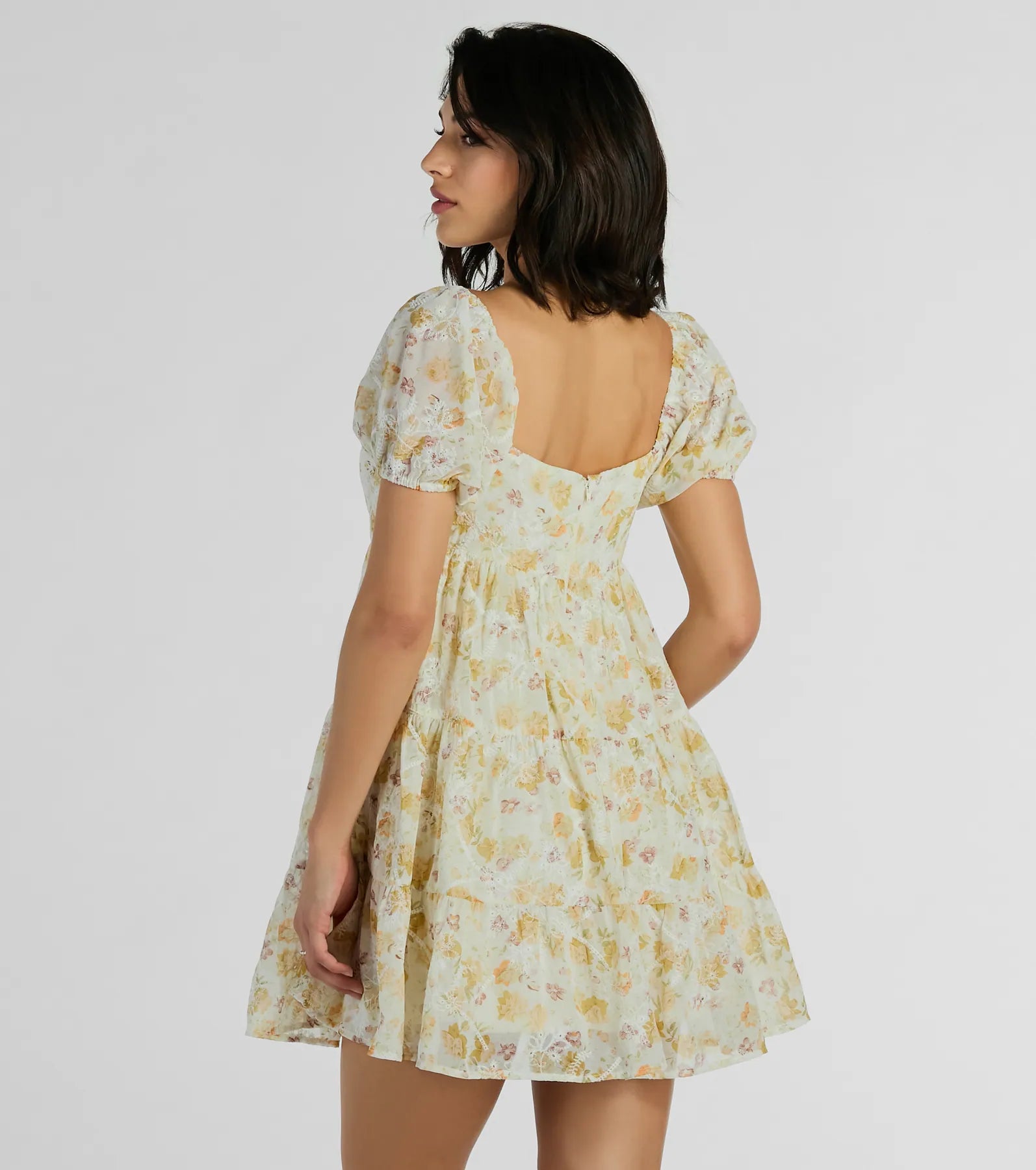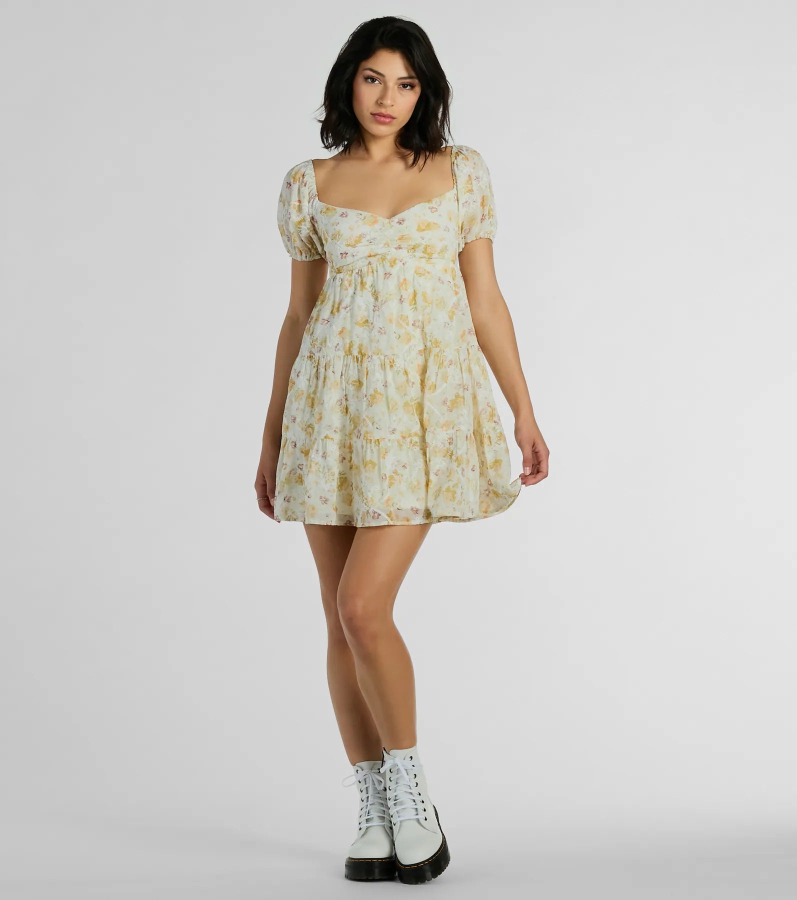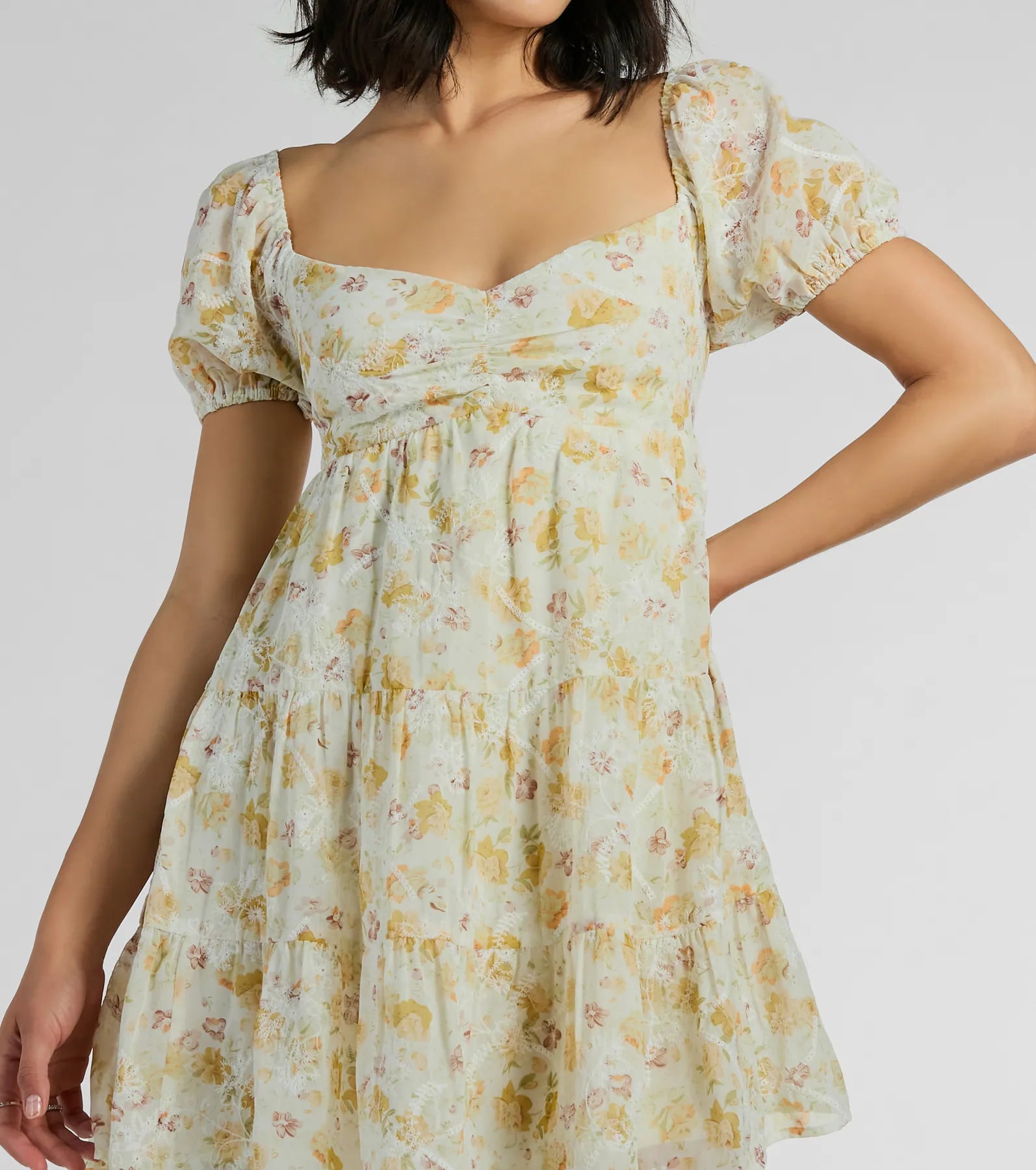 Captivate everyone with your cuteness in this eyelet floral babydoll dress at parties or brunch! Made with delicate eyelet floral chiffon fabric. this dress is perfect for any occasion.? The puff short sleeves and V-neckline add a touch of playfulness. while the babydoll silhouette and tiered ruffled hem offer a flattering fit. Complete the look in edgy .