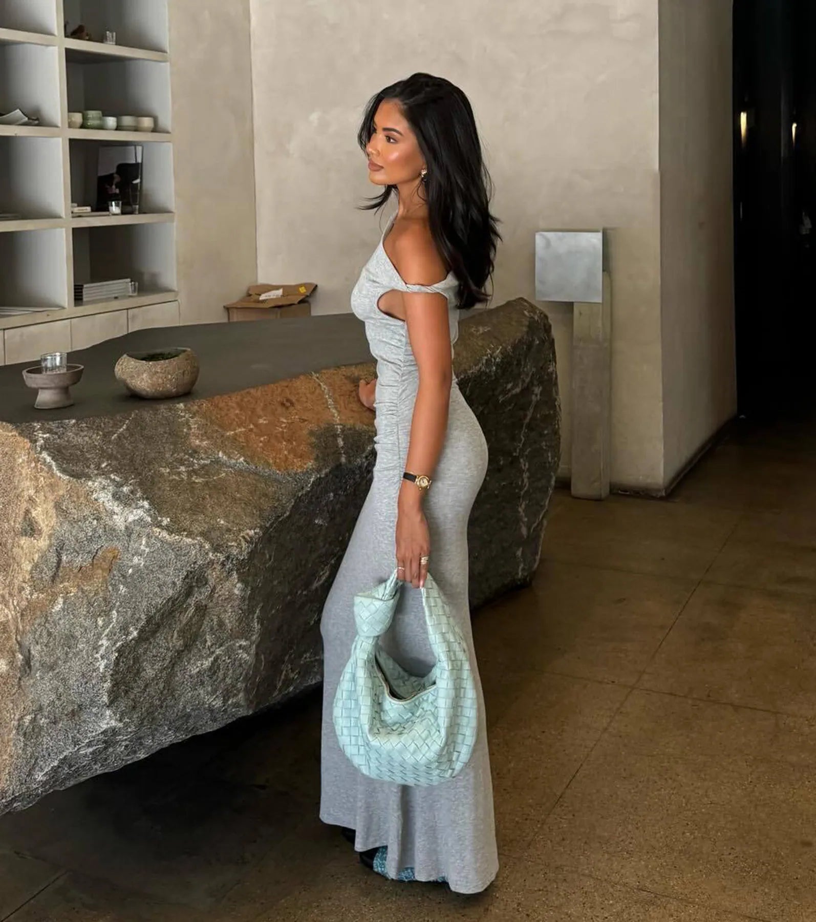 Effortlessly elevate your everyday looks with this casual chic ribbed knit maxi dress. It features a sleeveless boat neckline. tank shoulder straps with a trendy twist-back design. ruched side seams at the waist to accentuate your curves. and a fitted A-line silhouette with a maxi-length hem to flaunt your figure. Style with hoop earrings and .