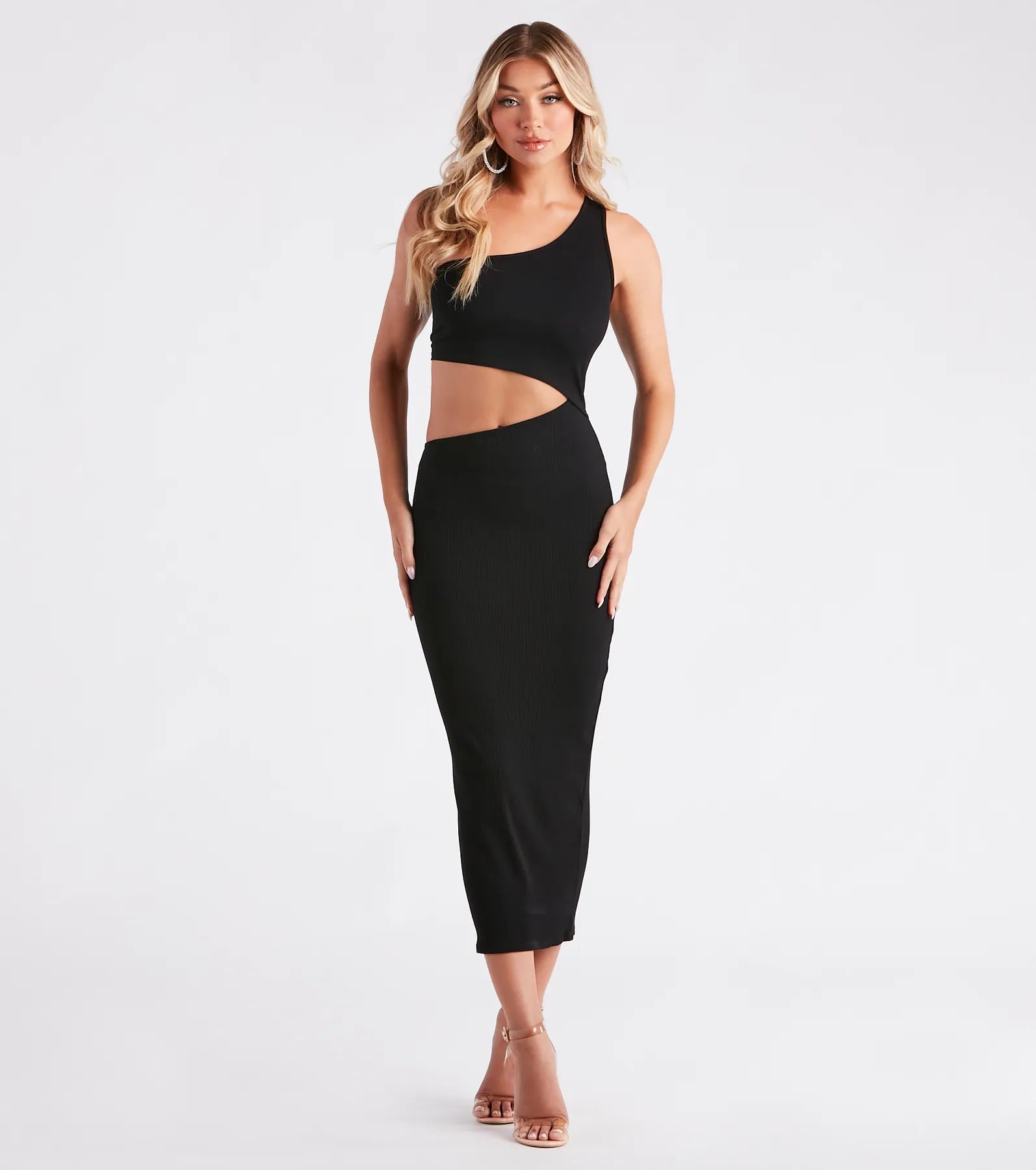 This sultry-chic midi dress will level up your look and make you a casual style icon! It features a sleeveless asymmetric one-shoulder neckline with a tank strap. a bold asymmetric waist cutout for a hint of skin. a midi-length hem. and a bodycon silhouette that will hug your curves. The ribbed knit fabric offers plenty of stretch. Pair with .