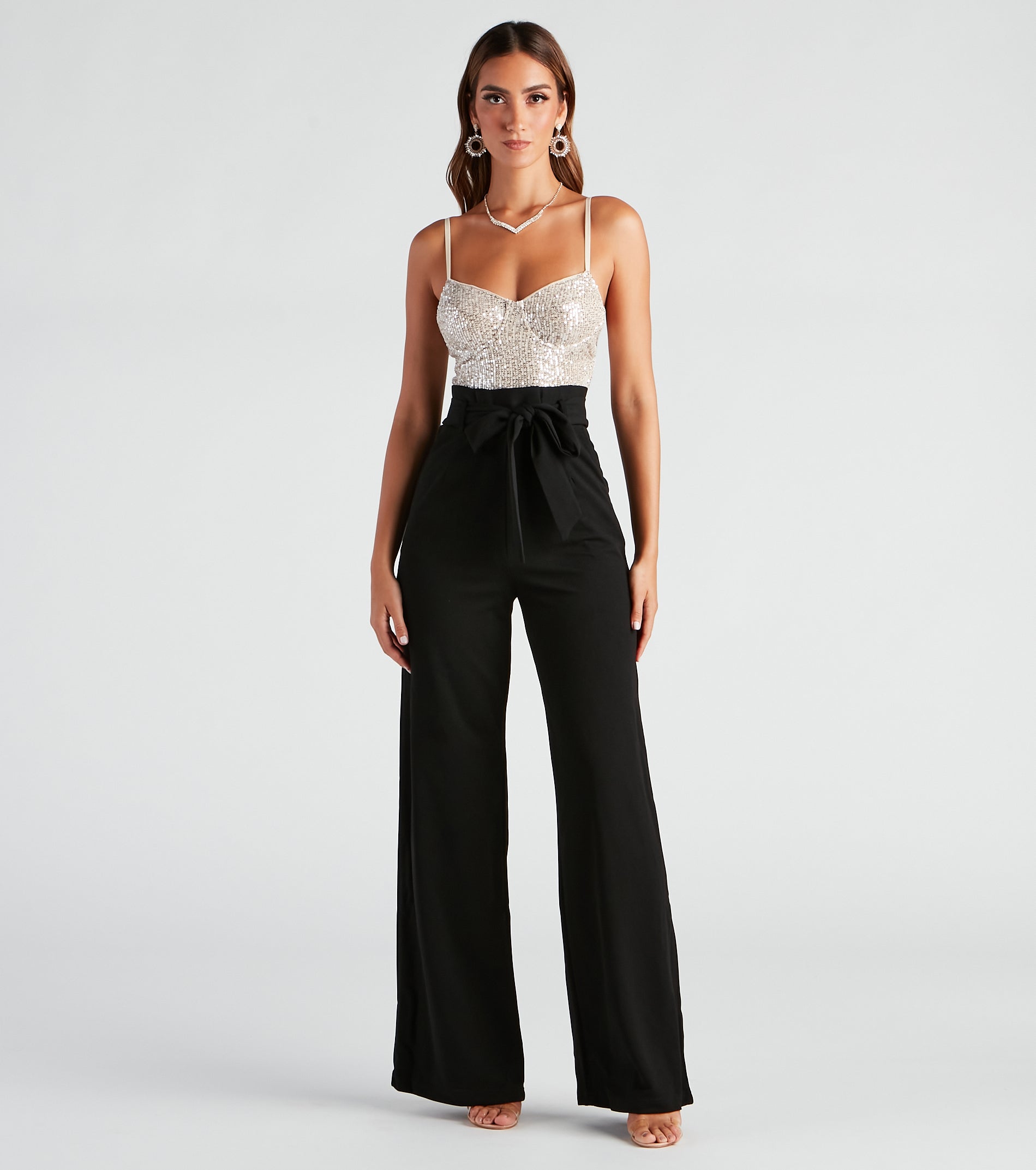 Make jaws drop strutting in wearing this sequin jumpsuit at the party! It features a sleeveless sweetheart sequin top with adjustable spaghetti straps. crepe bottoms with a paperbag high-rise waist. a tie-front belt. and a wide-leg silhouette. Complete the look with .