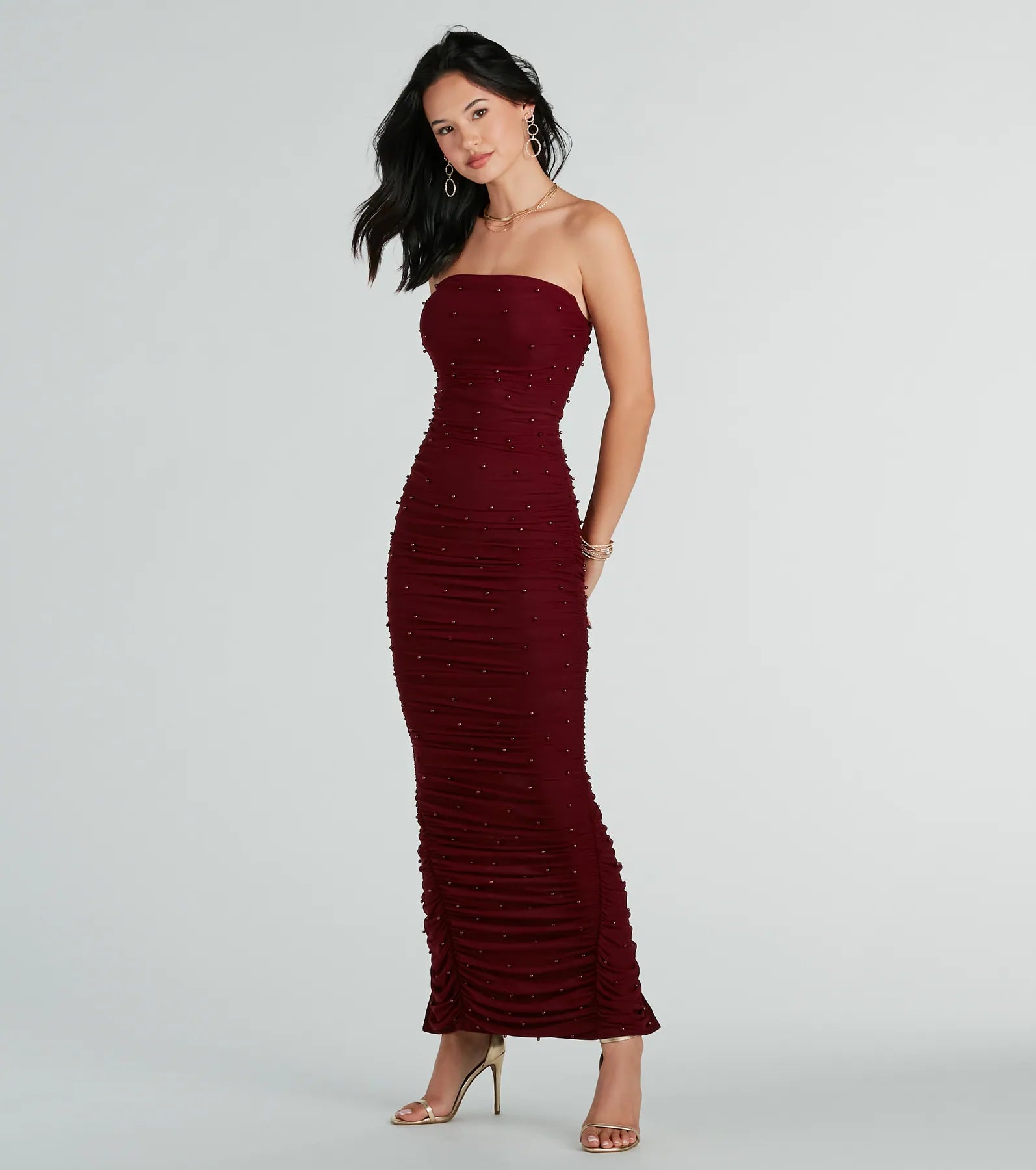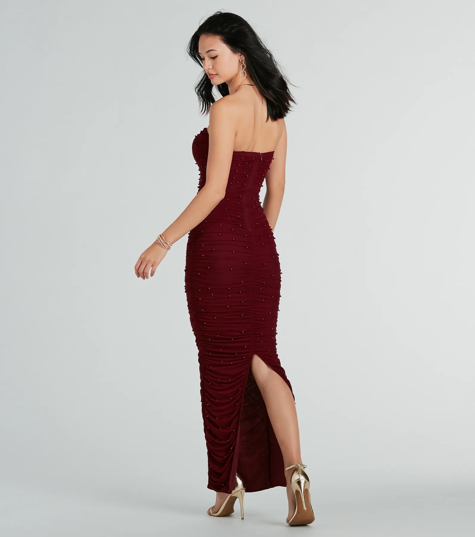 Step out in elevated luxury with the Caterina formal long dress adorning colored faux pearl embellishments for an opulent look! She features a strapless neckline with non-slip grip lining. a padded bust for support. and side ruched seams that accentuate your curves along the bodycon silhouette. The formal dress is finished with a center back slit for movement and a long-length hem on mesh fabric with a sewn-in knit lining. Complete the look with for a wedding or school dance!