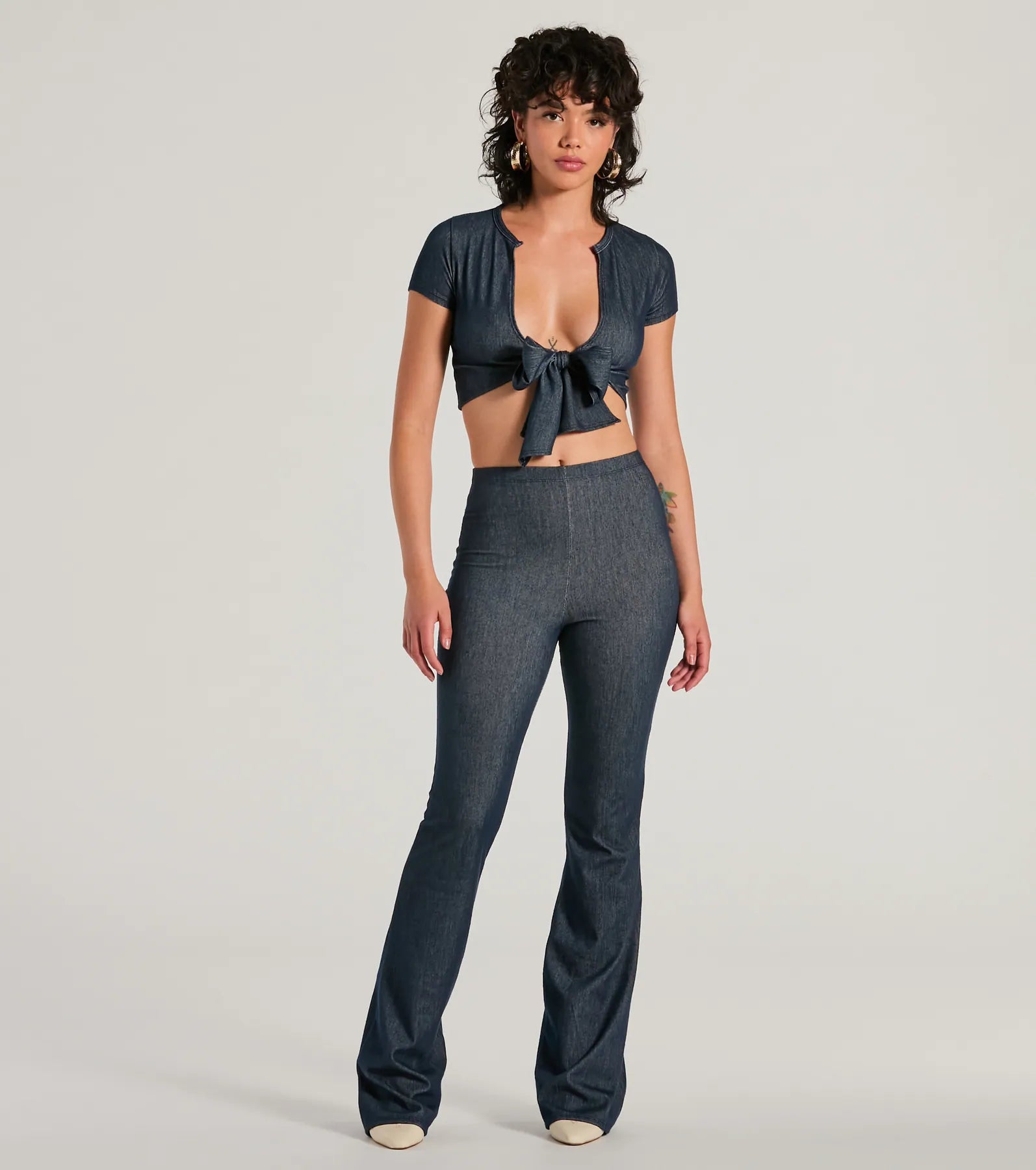 Cause a commotion with your trendsetting style in these denim flare pants! Featuring a high-rise waist and a hip-hugging fit leading to the flared hem that highlights your figure. Complete the look with the matching top.