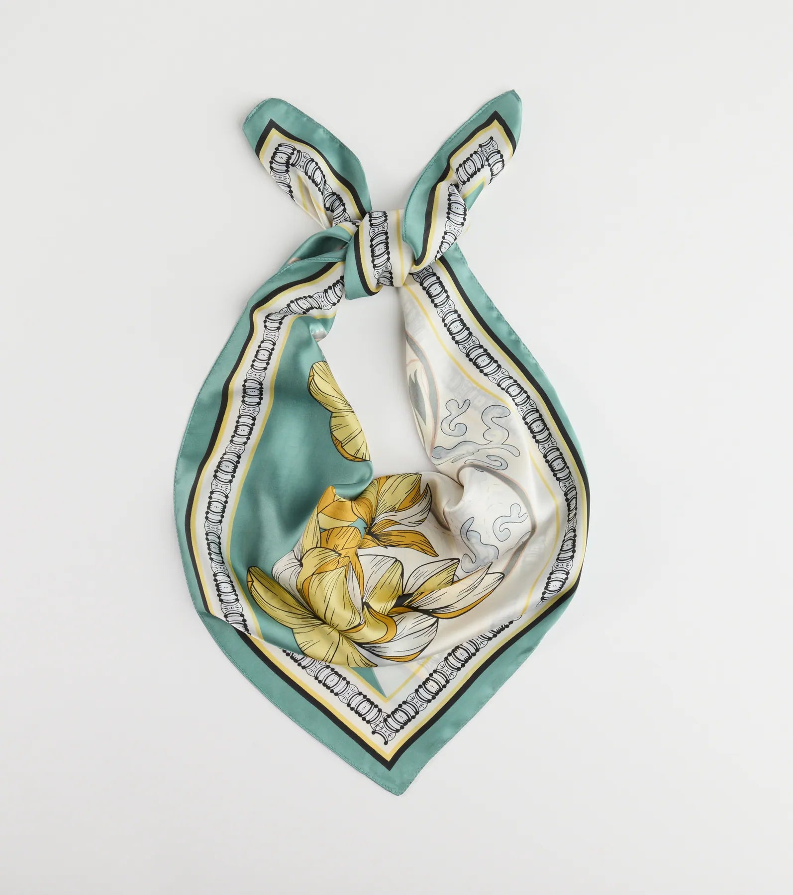 Perfect for adding a serenity charm to any outfit. this versatile floral satin scarf can be styled countless ways—from a neck accent to a hair accessory.