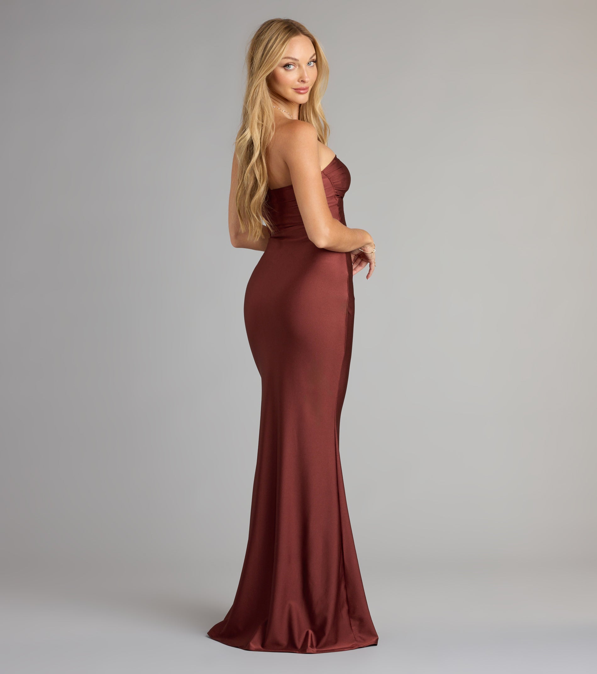 Classy yet modern. the Cheryl strapless formal dress is the epitome of chic with a high slit for movement and a mermaid silhouette that accentuates your figure!