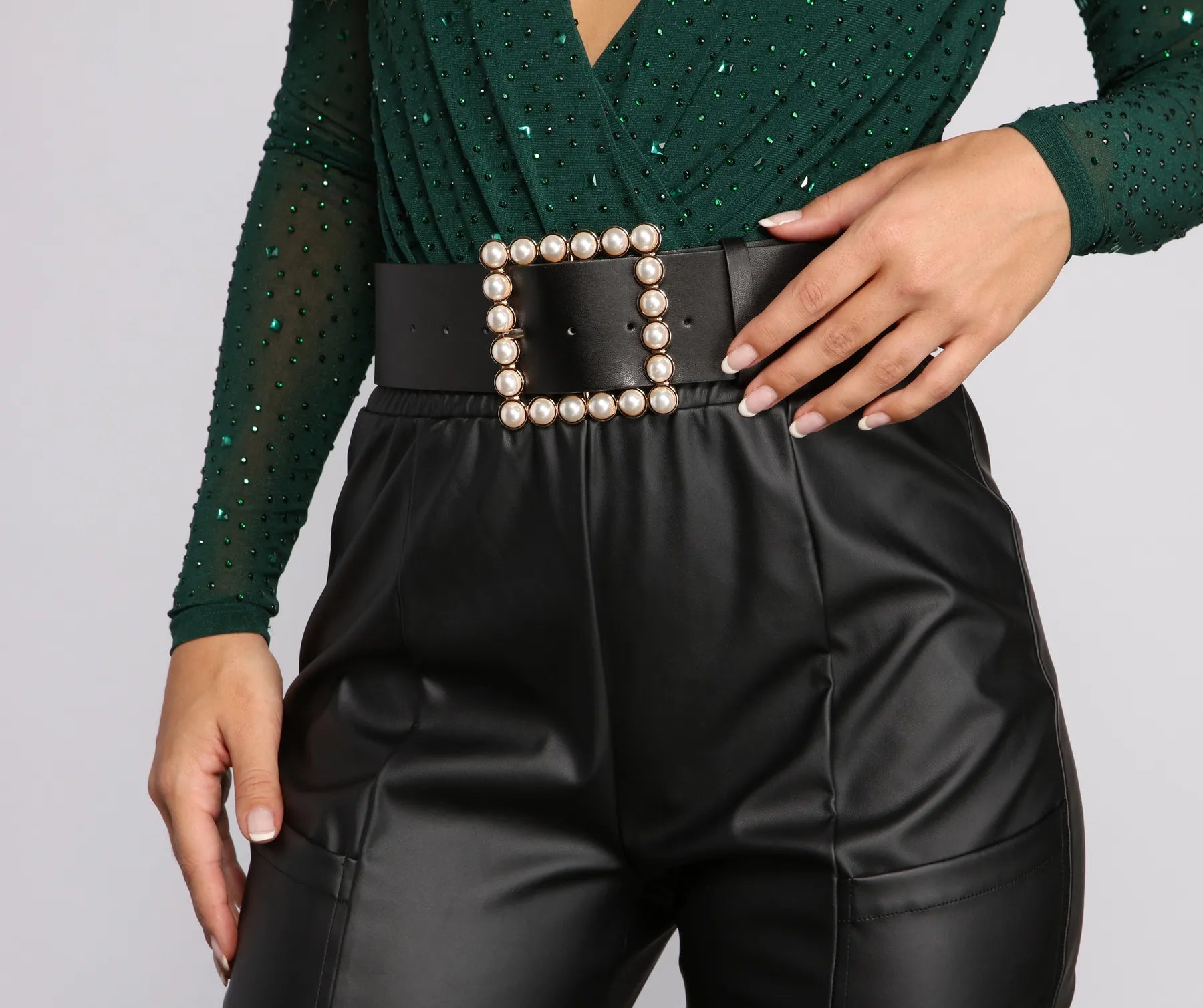 Get a chic and cinched look by adding on this pretty pearl buckle belt to your ‘fit! It features a large statement square buckle embellished with pearl detailing. Pair this belt over a for a gorgeous look.