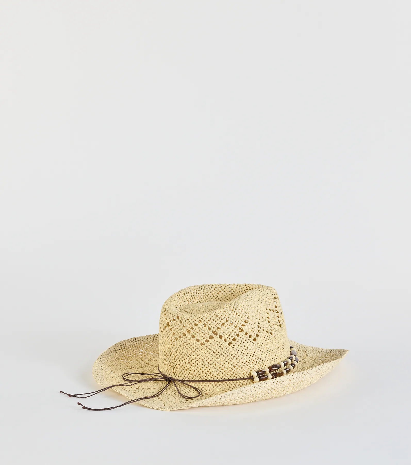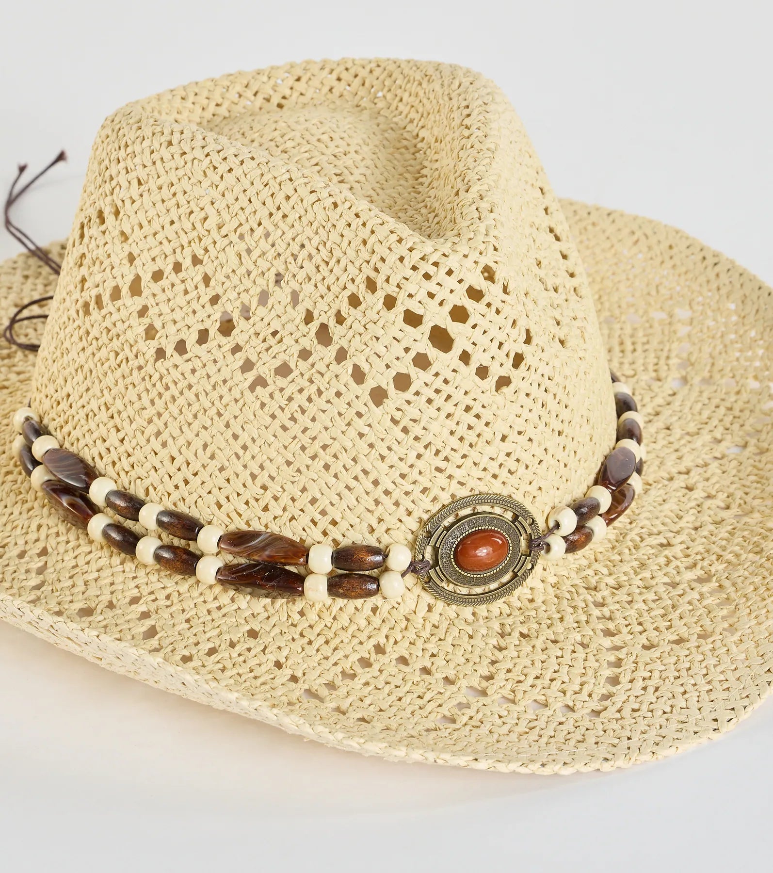 Capture a chic western look with this beaded straw cowboy hat to top off your concert or festival outfit!