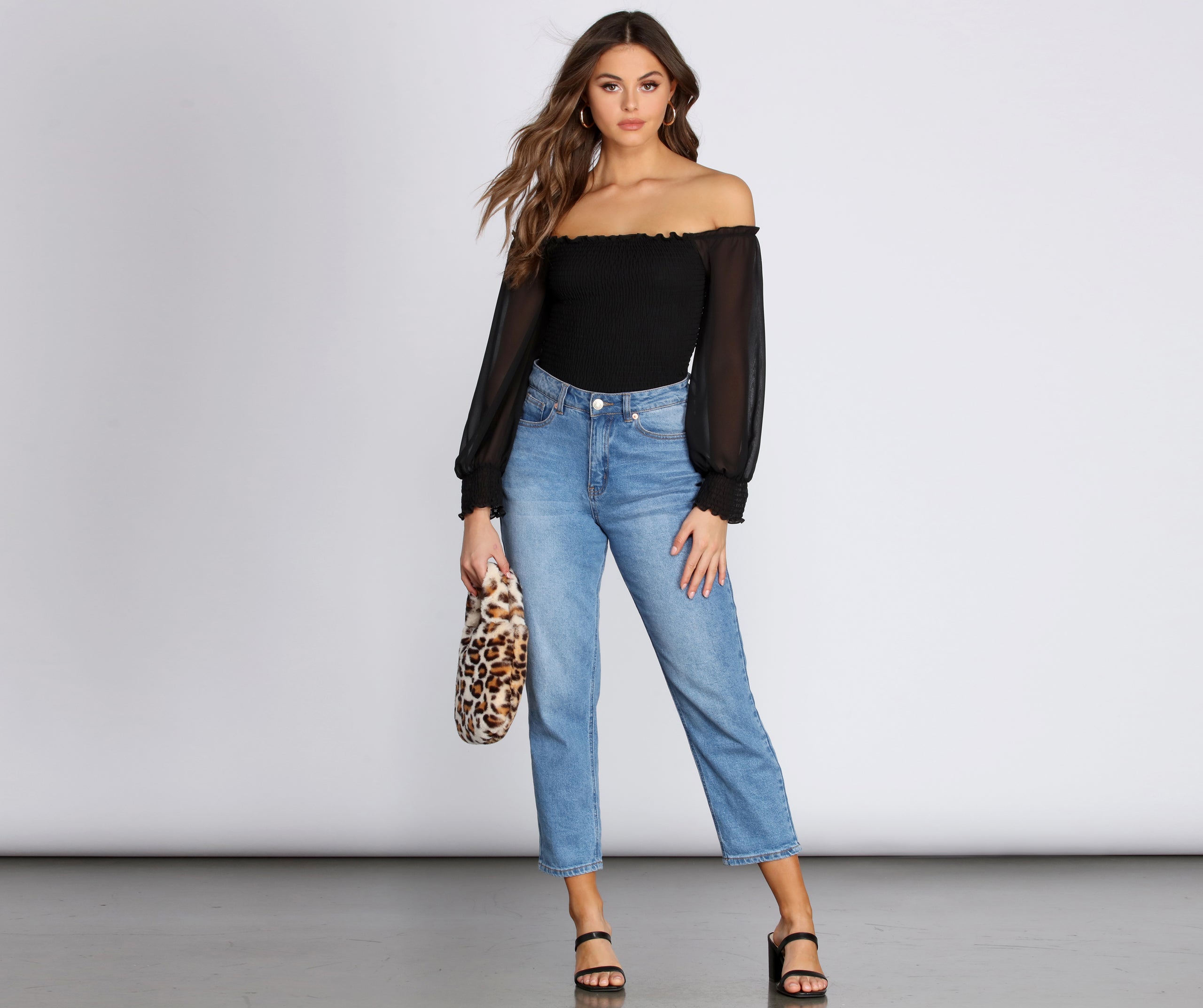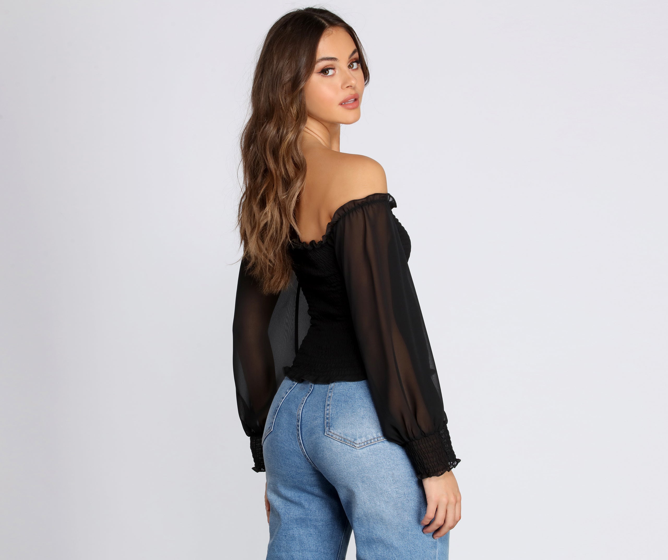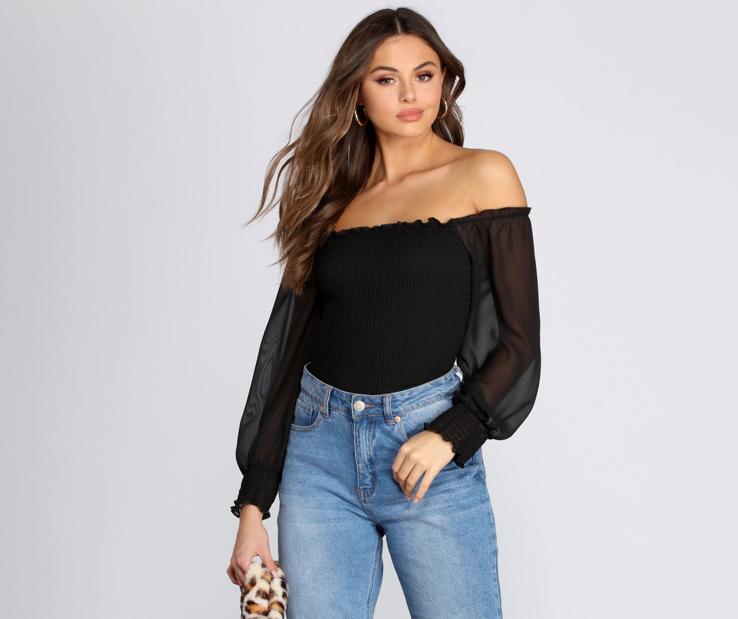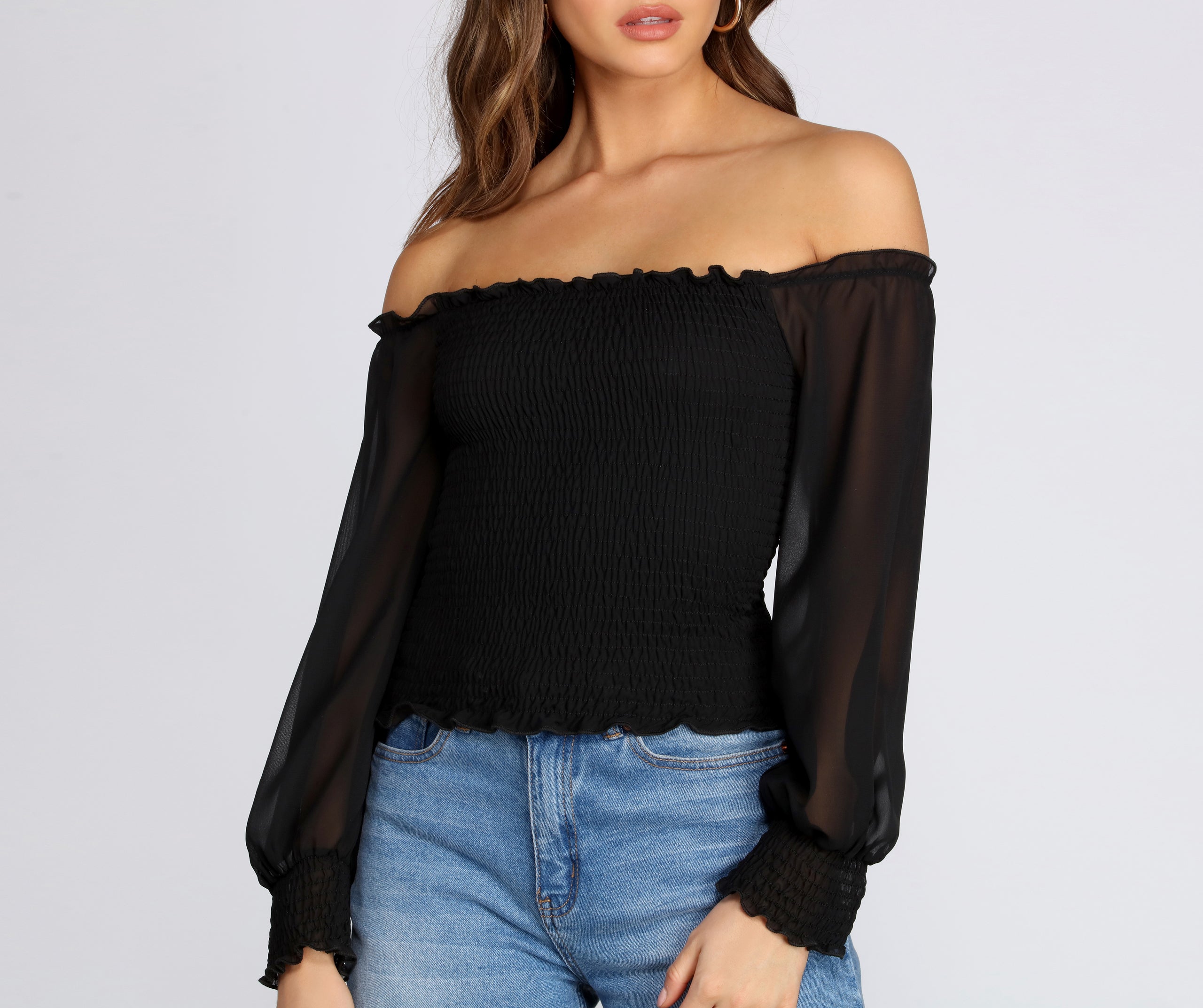 Lightweight and airy. this stylish smocked top can be dressed up or down. It features an off the shoulder square neckline with a merrow edge trim. long billowy sleeves with smocked cuffs. and a mid-length ruffle hem. The chiffon fabric offers moderate stretch and a form hugging fit.