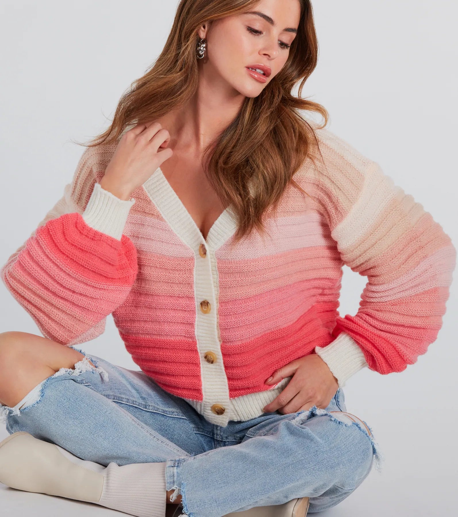 This adorable and cozy striped knit cardigan is perfect for those chill laidback days! It features a V-neckline. a complete button-down front. long balloon-style sleeves with tapered hems. a relaxed fit. and a trendy ombre striped pattern on the ribbed sweater knit fabric. Complete your cute and casual look with and ankle boots.