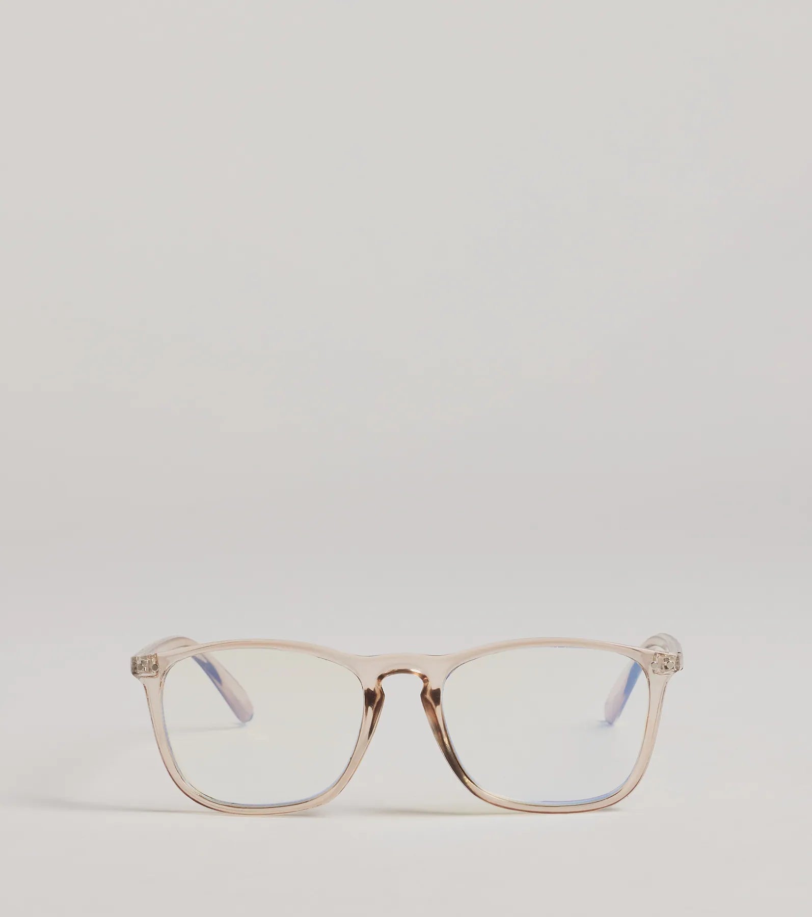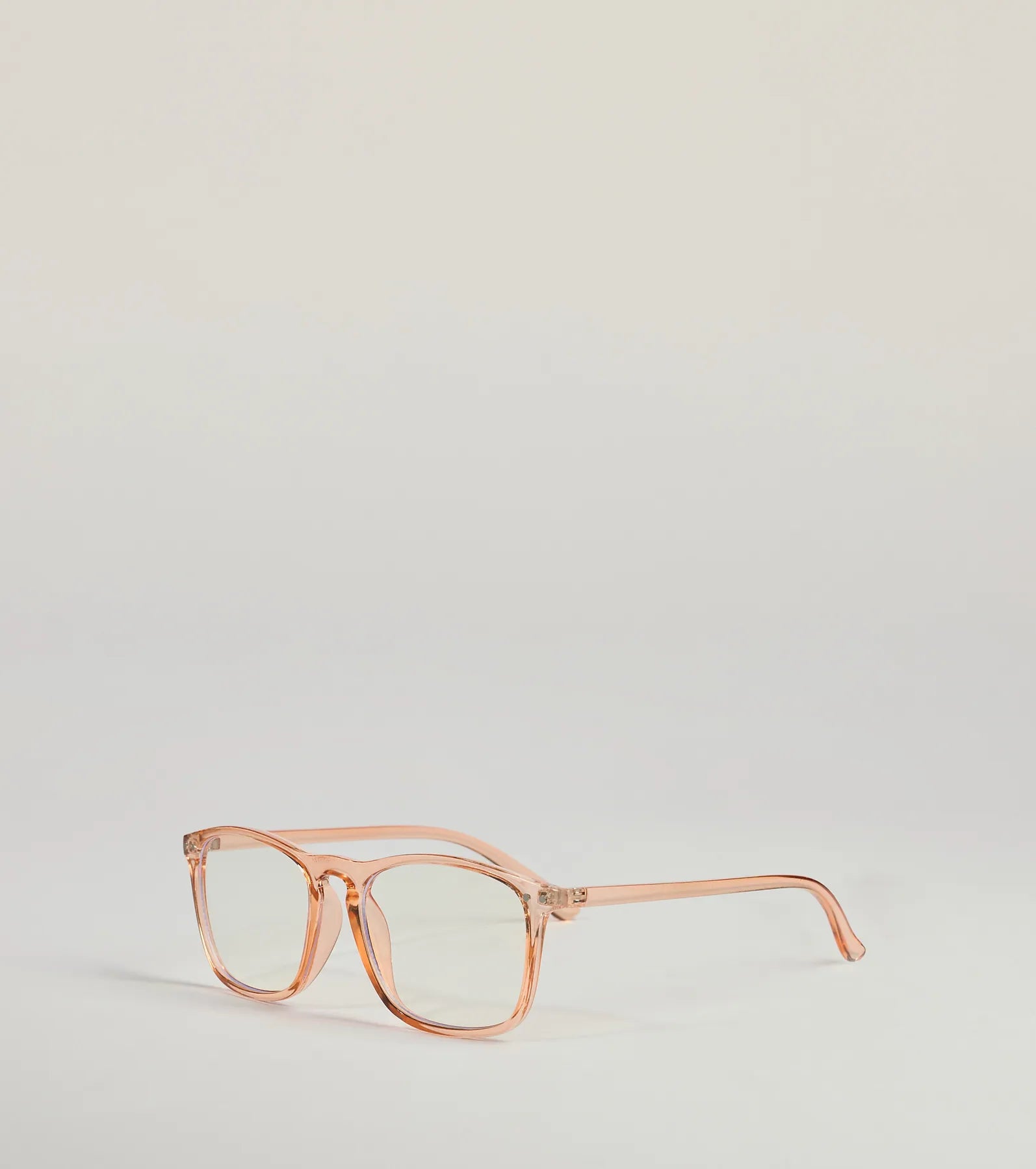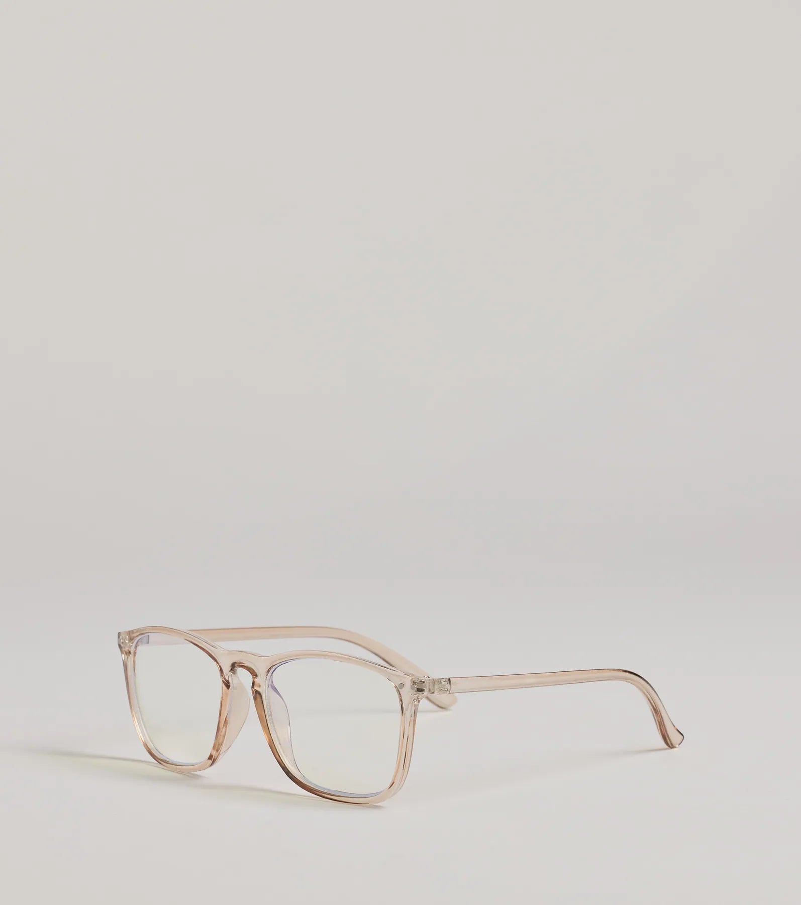 Protect your eyes while looking chic in these blue light eyeglasses with an oversized square frame and UV protection perfect for indoor or outdoor use. Pair with a shoulder bag.