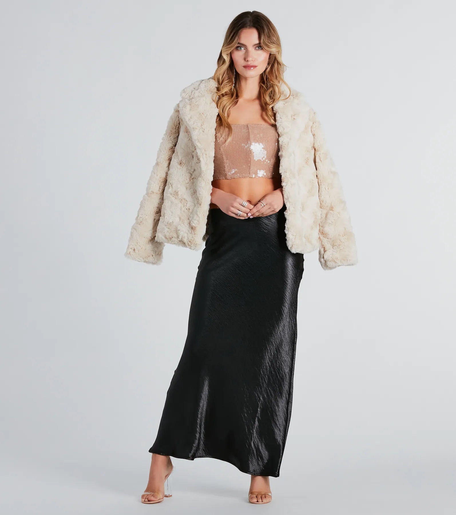 This corset top is a clear sign you should dress up your ‘fit! It features a strapless neckline. flexible boning inserts for structure. a cropped hem. and clear sequin embellishments. Complete the look in sleek for dinner and drinks!