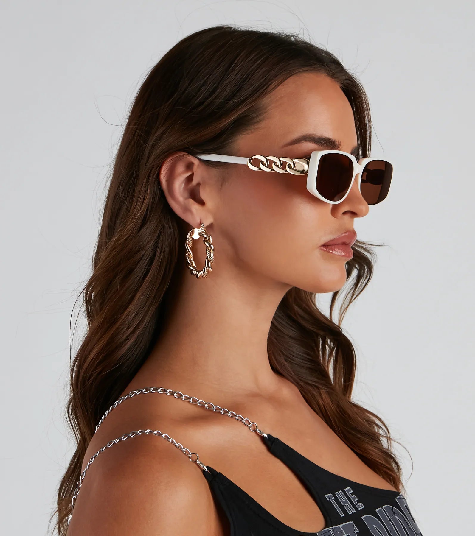 Bring cool-girl vibes to your look with these trendy shades! The sunglasses feature a plastic frame. rectangular-shaped tinted lenses. and chain-link detailing on the arms. Style with a .