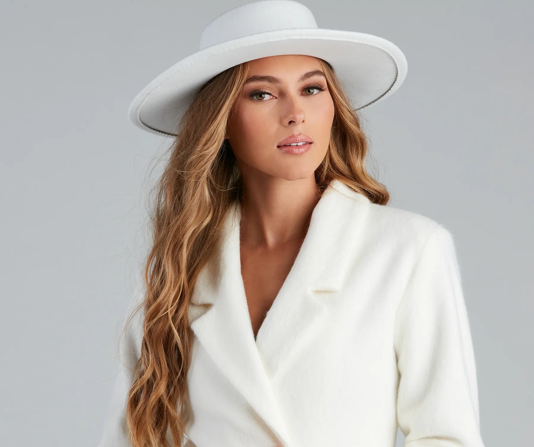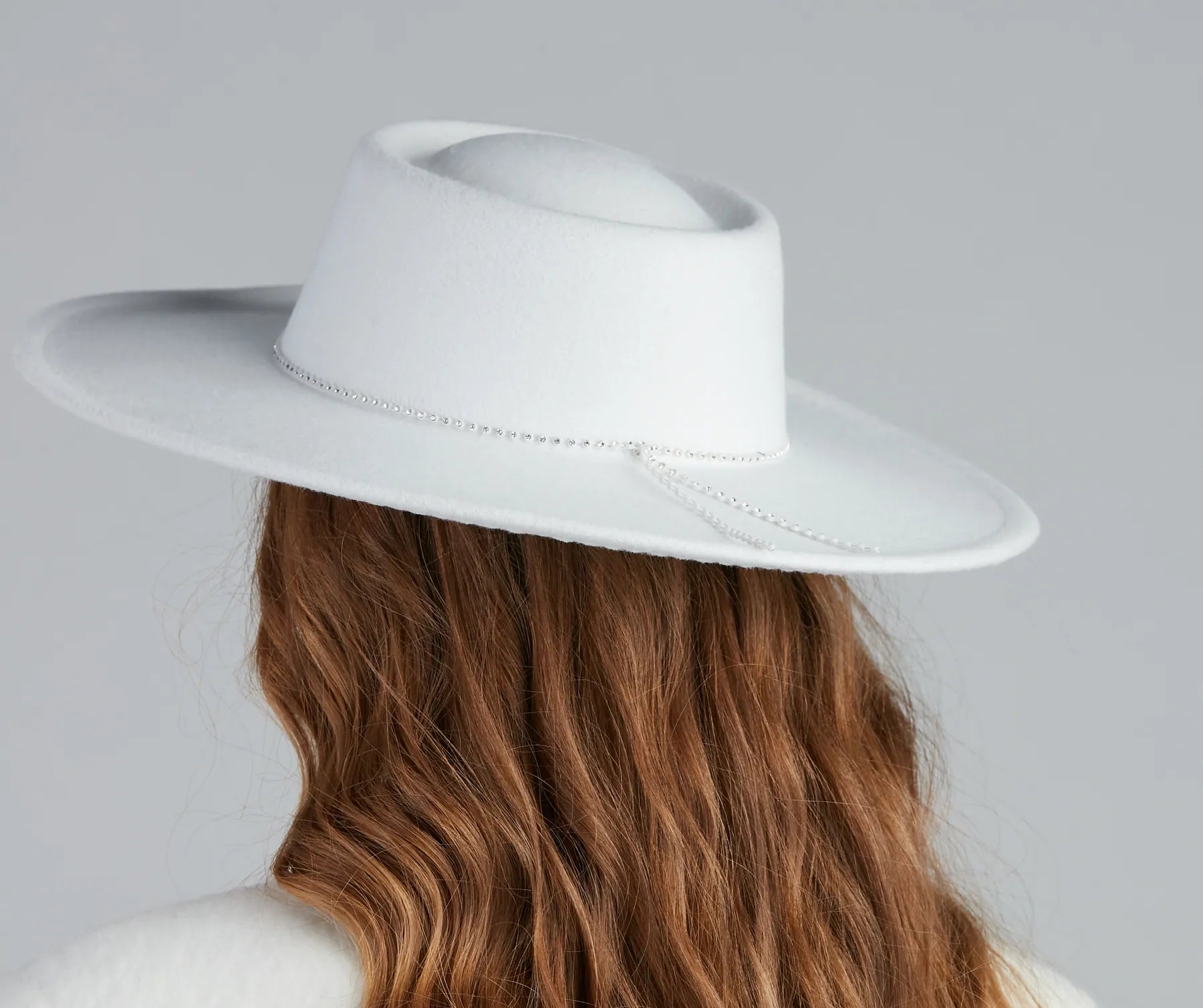 Dig up your country roots looking fab in this Panama hat featuring a rhinestone string. wide brim. and faux wool material. Complete the look in a cute long sleeve