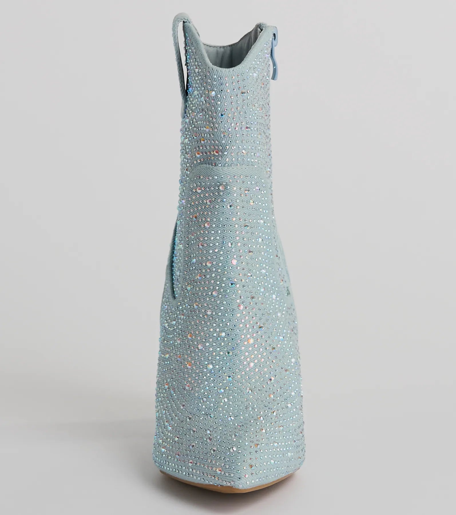 Add a touch of glitz in these rhinestone denim booties and get ready for the spotlight! Featuring a pointed-toe design and inner zipper closure. these booties are made with rhinestone-embellished denim material for a fun and stylish touch and have a comfortable block heel. Complete the look for a festival. concert. or country bar with a fun .